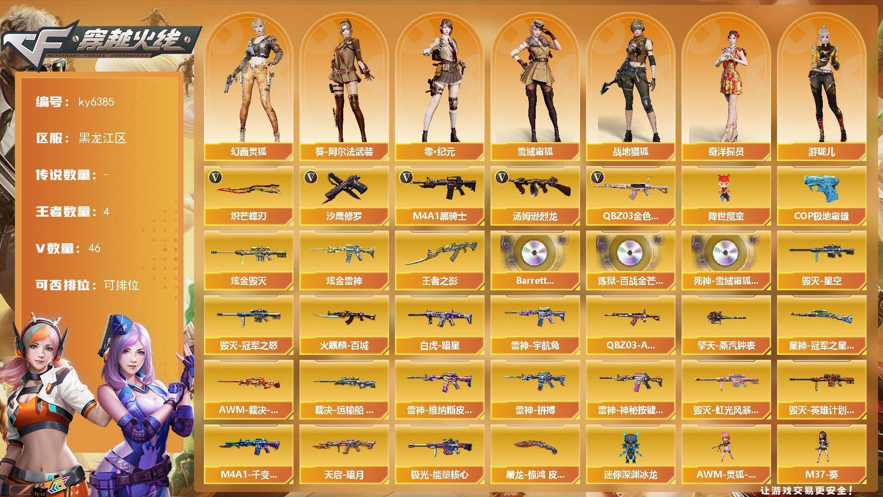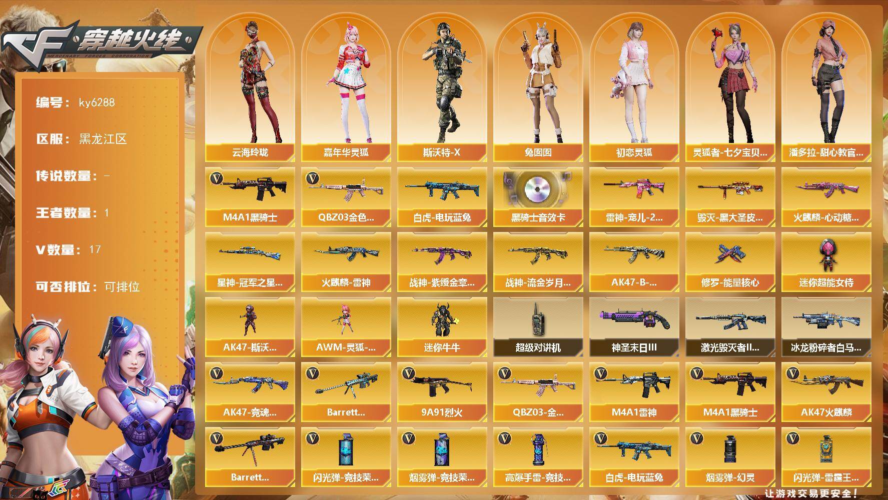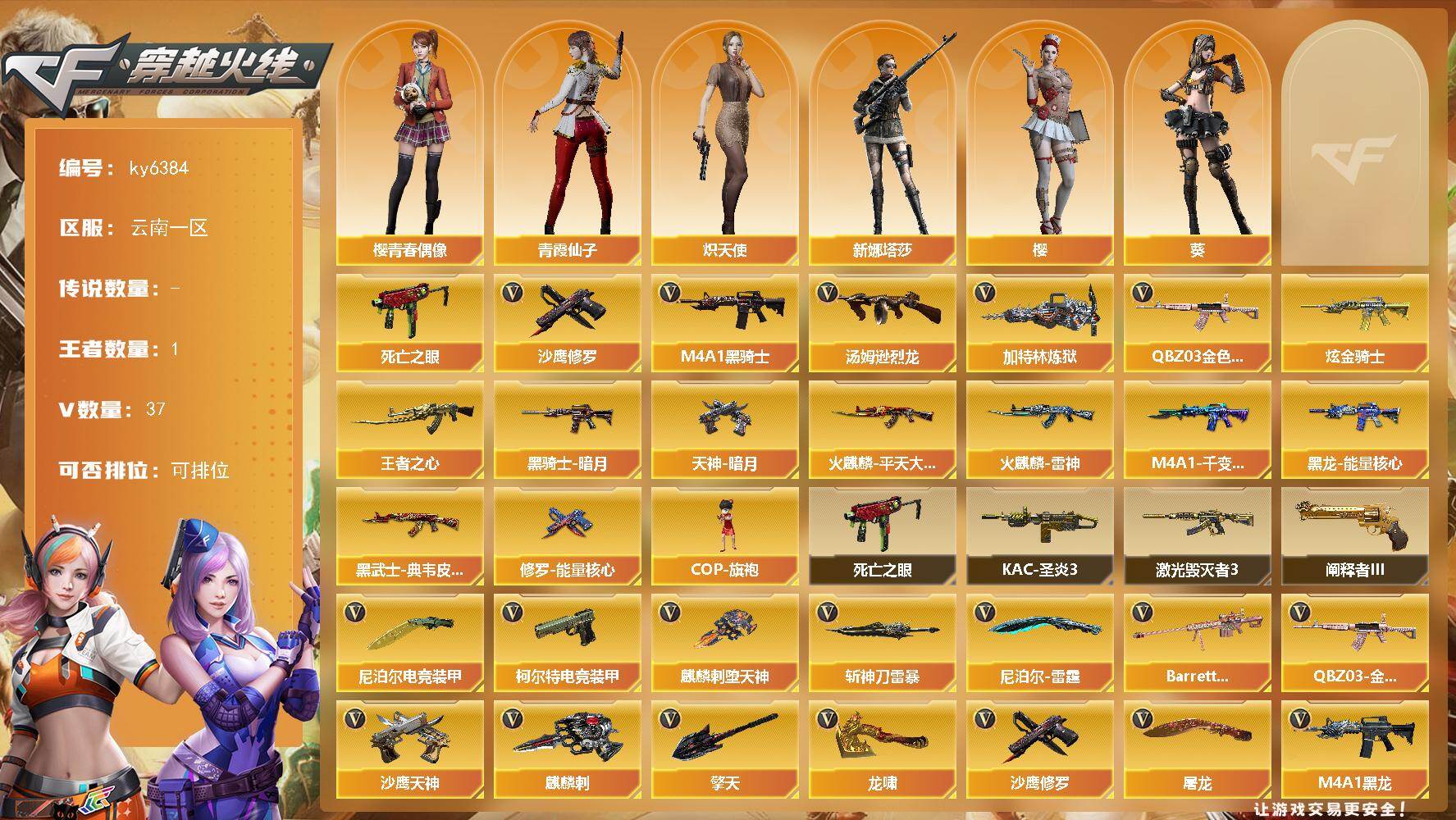 PX_2548705-37V-1王者武器数-1炫金武器数 【热门武器】:QBZ03-金色蔷薇,死亡之眼,M4A1-黑骑士,汤姆逊-烈龙,加特林-炼狱,沙鹰-修罗 【王者炫金武器】:王者之心,炫金骑士 【皮肤】:火麒麟-雷神,火麒麟-平天大圣,M4A1-千变-孔明皮肤,黑龙-能量核心,黑骑士-暗月,黑武士-典韦皮肤,修罗-能量核心,天神-暗月 【角色】:葵,樱,炽天使,青霞仙子,新娜塔莎,樱-青春偶像 【人