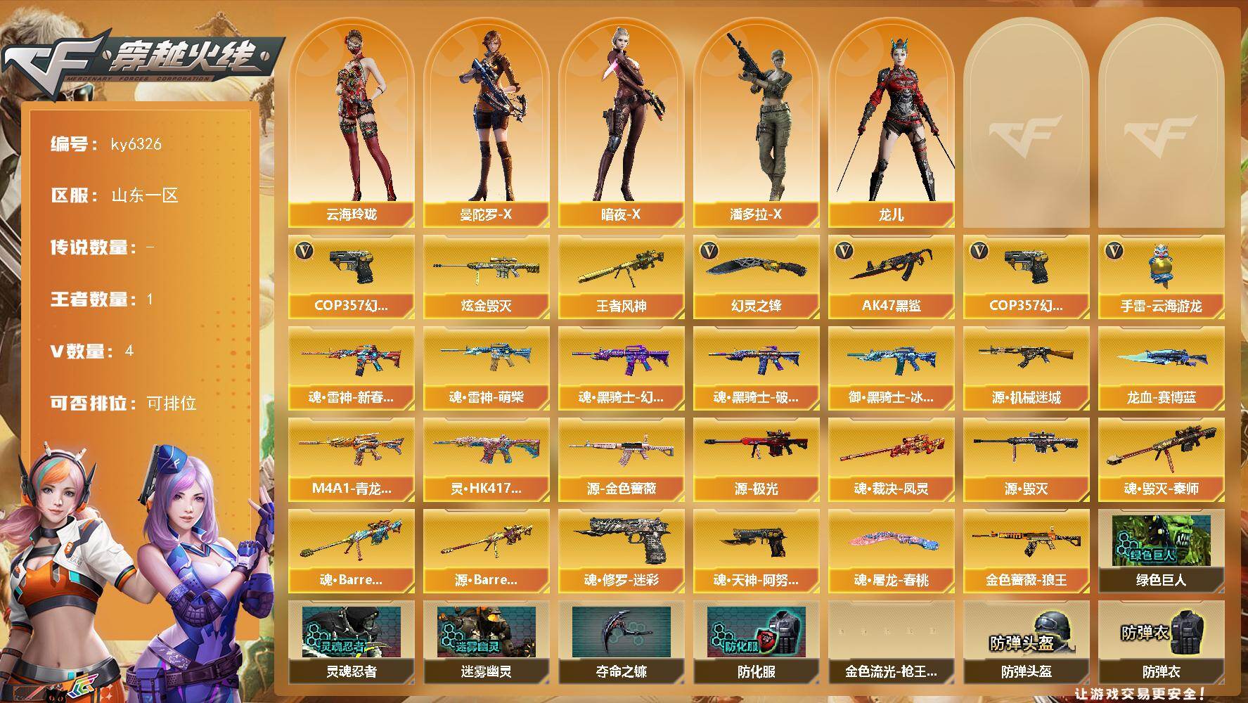 PX_2548729-6V-1王者武器数-1炫金武器数 【热门武器】:COP,357-幻灵 【王者炫金武器】:王者风神,炫金毁灭 【角色】:云海玲珑,暗夜-X,龙儿,曼陀罗-X,潘多拉-X 【英雄级武器】:AK47-黑鲨,COP,357-幻灵,幻灵之锋,手雷-云海游龙 【源级武器】:魂·雷神-新春神龙,魂·雷神-萌柴*2,魂·黑骑士-幻能朋克,魂·黑骑士-破浪10年,御·黑骑士-冰魄,源·机械迷城,龙血-