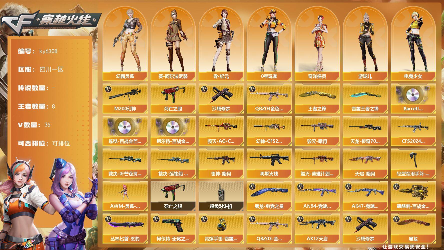 PX_2548759-37V-8王者武器数-0炫金武器数 【热门武器】:QBZ03-金色蔷薇,M200-幻神,死亡之眼,沙鹰-修罗*2 【王者炫金武器】:王者之锋,雷霆王者之锋 【音效卡】:Barrett-碧霄极光音效卡,炼狱-百战金芒-庆典舞曲音效卡,柯尔特-百战金芒-庆典舞曲音效卡 【皮肤】:幻神-CFS2022,QBZ03-CFS2024,皮肤,裁决-叶芒苍灵,皮肤,裁决-运输船,皮肤,雷神-暗月,