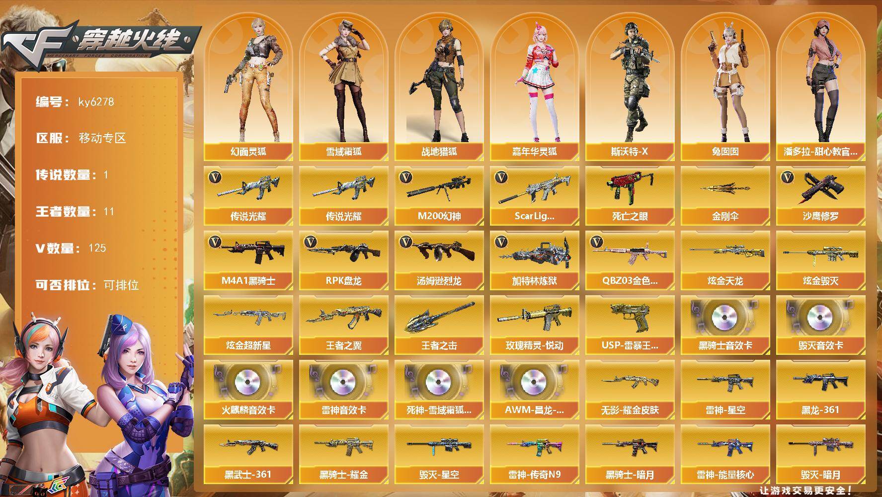 PX_2548766-22V-1王者武器数-0炫金武器数 【热门武器】:QBZ03-金色蔷薇,白虎-电玩蓝兔,M4A1-黑骑士 【音效卡】:M4A1-黑骑士音效卡 【皮肤】:Kar98K-星神-冠军之星皮肤,雷神-宠儿-2019MVP,火麒麟-雷神,火麒麟-心动糖果,毁灭-黑大圣皮肤,战神-紫绶金章皮肤*2,战神-流金岁月皮肤,AK47-B-常胜将军-刘备,修罗-能量核心 【角色】:云海玲珑,暗夜-X,初