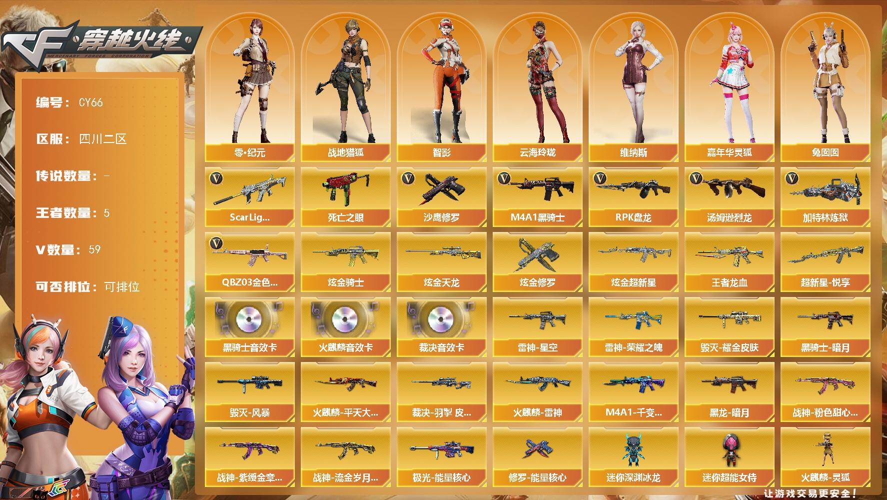 PX_2543681-52V-5王者武器数-1炫金武器数 【传说武器】:传说幽冥 【热门武器】:传说幽冥,M200-幻神,金色蔷薇-古蛇迷踪,修罗-古蛇迷踪,沙鹰-修罗,炽芒蝶刃 【王者炫金武器】:王者星霆,王者玉锋,炫金毁灭 【音效卡】:炼狱-百战金芒-庆典舞曲音效卡,柯尔特-百战金芒-庆典舞曲音效卡 【皮肤】:M200-幻神-N9-2022MVP,雷神-宠儿-2019MVP,雷神-R.LGD-CFPL
