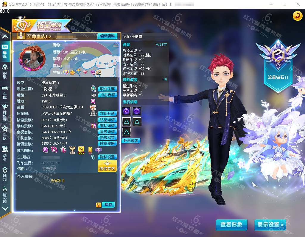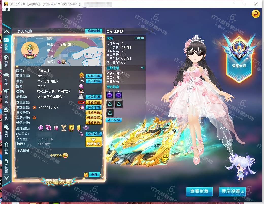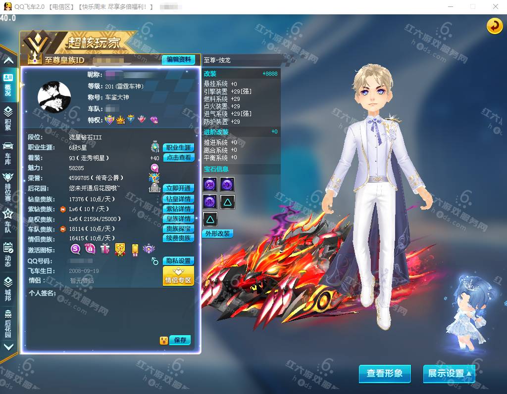 F16042,红六更号裙762771576【电信一区】红六自营,魅力1.6W,荣誉165w,紫钻4级,S车:双四至曜影虎/X次元白虎+29,T1:至尊青龙,7A车:单四电玩雷诺,单四天穹般黛,天数雷诺/弑神1阶,骑宠2页:甜心公主+10,小菊仙+8,座椅*2,套装女14页:凌霄齐天/应龙驭风/X次元白虎,套装男12页:凌霄齐天/应龙驭风,6999R,