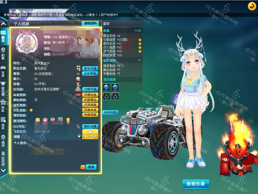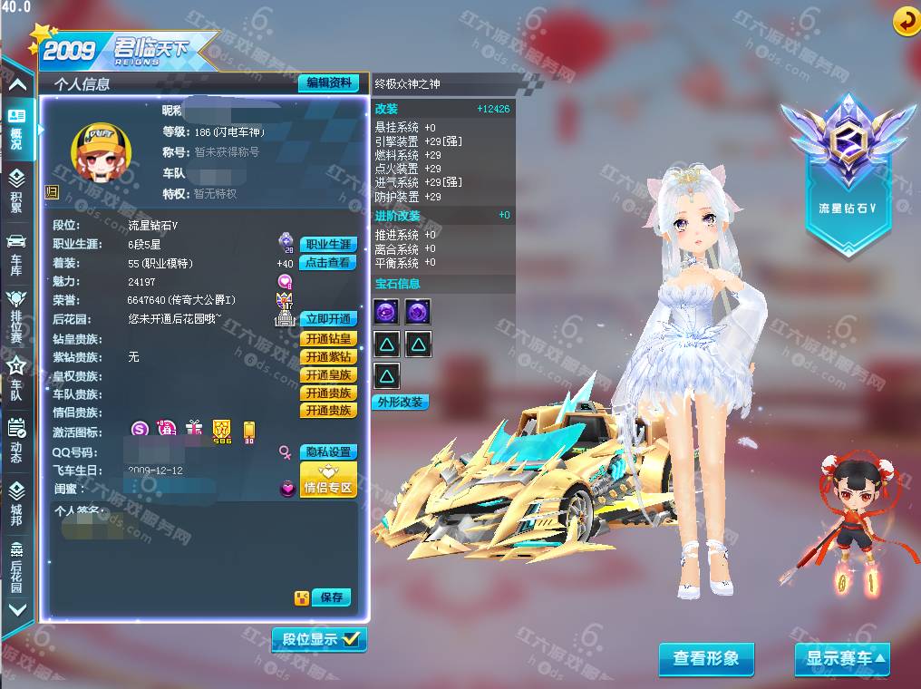 DS3298,红六更号裙762771576【电信一区】魅力4715,荣誉362w,S车:双四爆天雷诺冰蓝+29,双四至尊麦凯伦+29,A车*4:双四电玩雷诺,C车:飞碟,骑宠*11:哪吒三太子+9,坐骑*7,套装男14页,套装女18页:山海冬神/绮丽梦游发饰,3333R,