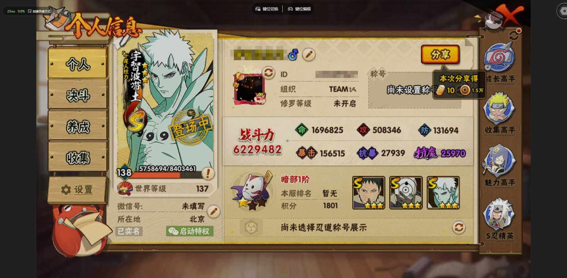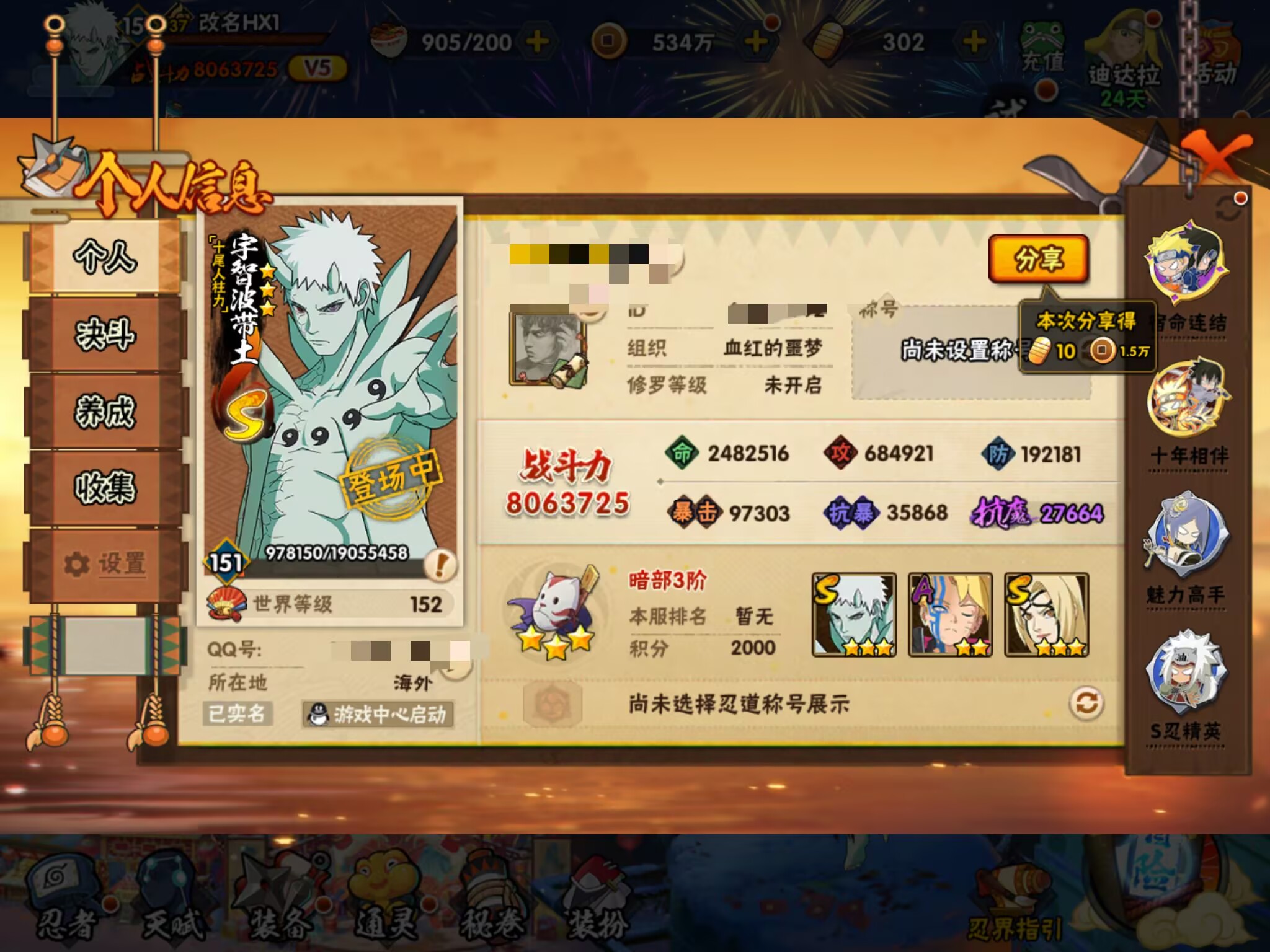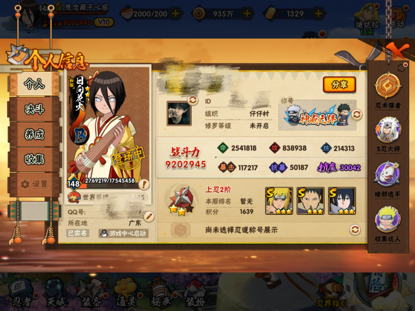 PX_2549052-实名:,可修改,贵族等级:,V10,S忍数:,13,A忍数:,31,【S级忍者】大野木「忍界大战」(3星),宇智波带土「忍界大战」(3星),宇智波鼬「须佐能乎」(3星),自来也「舞之豪杰」(3星),大蛇丸(3星),自来也「传说中的三忍」(3星),波风水门(3星),漩涡鸣人「九喇嘛连结」(3星),佩恩「天道」(3星),宇智波佐助「永恒万花筒」(3星),宇智波斑,「白面具」(3星宇智波斑「白面具」),漩涡鸣人·宇智波佐助(3星),宇智波带土「十尾人柱力」(3星)