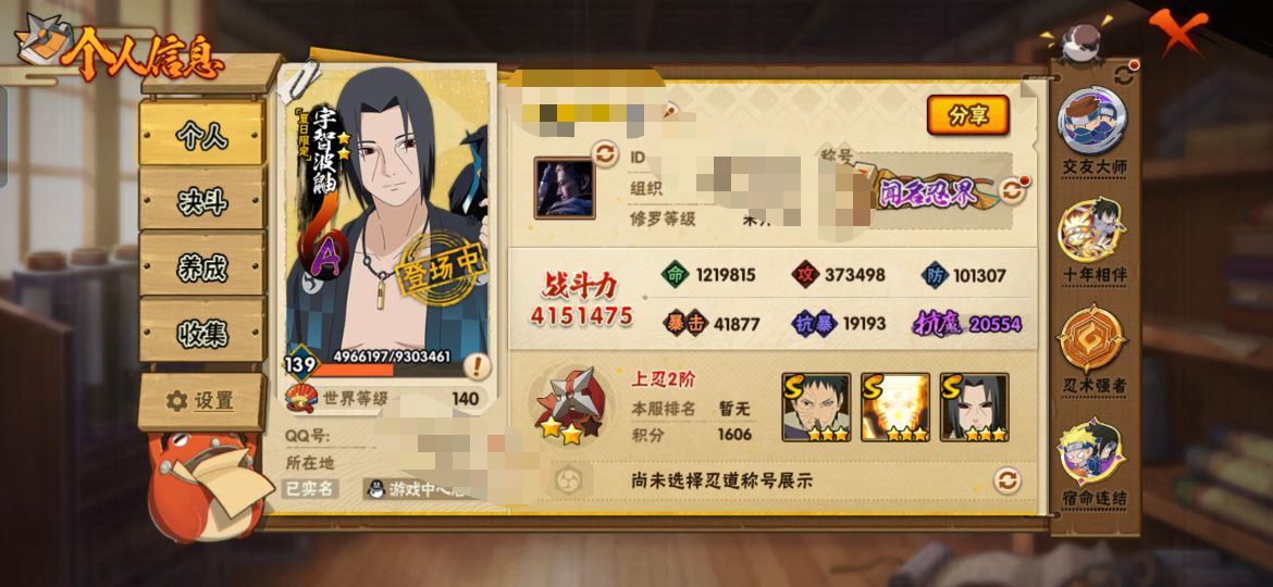 PX_2462146-果Q,2212【等级】152【S级数量】33【A级数量】54【B级数量】97【C级数量】66【S级】宇智波鼬「须佐能乎」,迈特凯「死门」,旗木卡卡西「须佐能乎」,猿飞日斩,宇智波佐助「永恒万花筒」,大筒木舍人「最终章」,漩涡鸣人「暴怒·第六尾」,千手柱间,艾「忍界大战」,猿飞日斩「秽土转生」,纲手,千手扉间,自来也「传说中的三忍」,大筒木桃式,宇智波斑「秽土转生·解」,宇智波斑「五影会谈