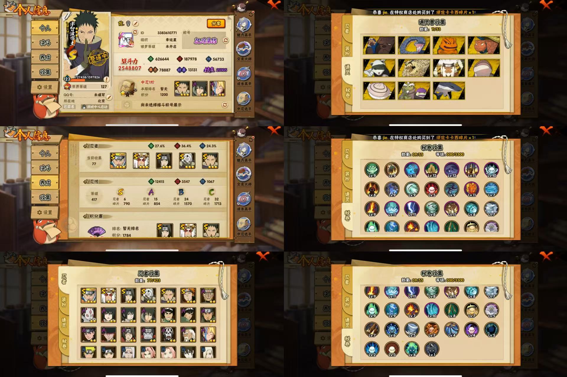 PX_2434733-IOS/6S忍/15A忍/战力254W/V7/区服836 【S忍者】,宇智波佐助「漩涡鸣人」,宇智波带土「忍界大战」,自来也「舞之豪杰」,宇智波斑「白面具」,宇智波鼬「须佐能乎」,佩恩「天道」, 【A忍者】,机械鸣人「初始形态」,大野木「侠隐江湖」,迈特凯「青春爆炸」,漩涡博人「桃式显现」,宇智波泉奈,佩恩·六道「漂泊浪客」,神秘面具男「忍者之路」,宇智波佐助「须佐能乎」,猿飞日斩「火影继承人」,宇智波佐助「万花筒写轮眼」,飞段「死司凭血」,干柿鬼鲛,宇智波鼬,猿飞阿斯玛,迈特凯,