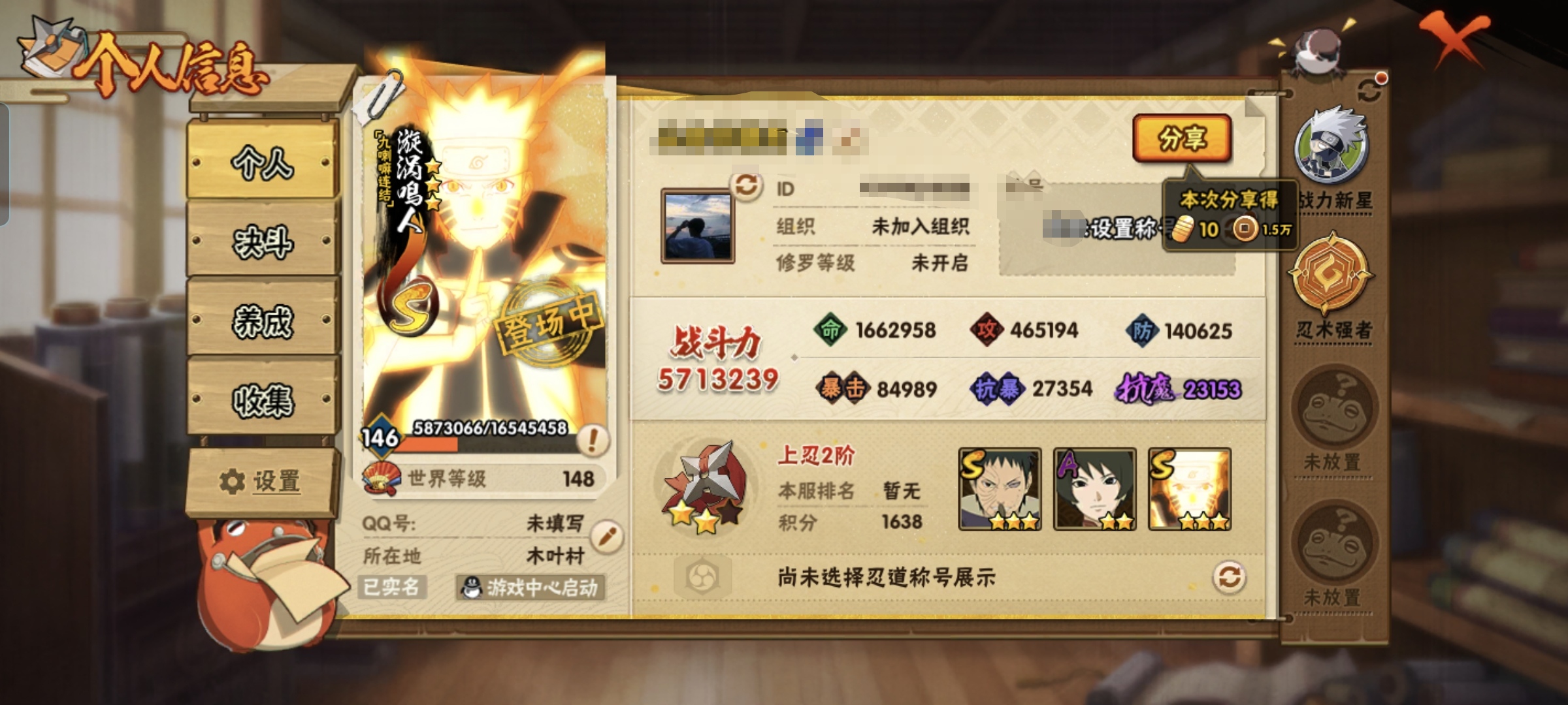 PX_2421578-2,A忍者36,通灵15】【安卓Q-2418区-143级-V10-601万战力】【S级】宇智波带土「忍界大战」,漩涡鸣人「九喇嘛连结」,波风水门「秽土转生」,佩恩「天道」,漩涡鸣人·宇智波佐助,自来也「舞之豪杰」,波风水门,神秘面具男,宇智波斑「秽土转生·解」,大蛇丸,宇智波佐助「永恒万花筒」,宇智波鼬「须佐能乎」【A级】神秘面具男「忍者之路」,迈特凯「青春爆炸」,药师兜「半蛇斗篷」,猿