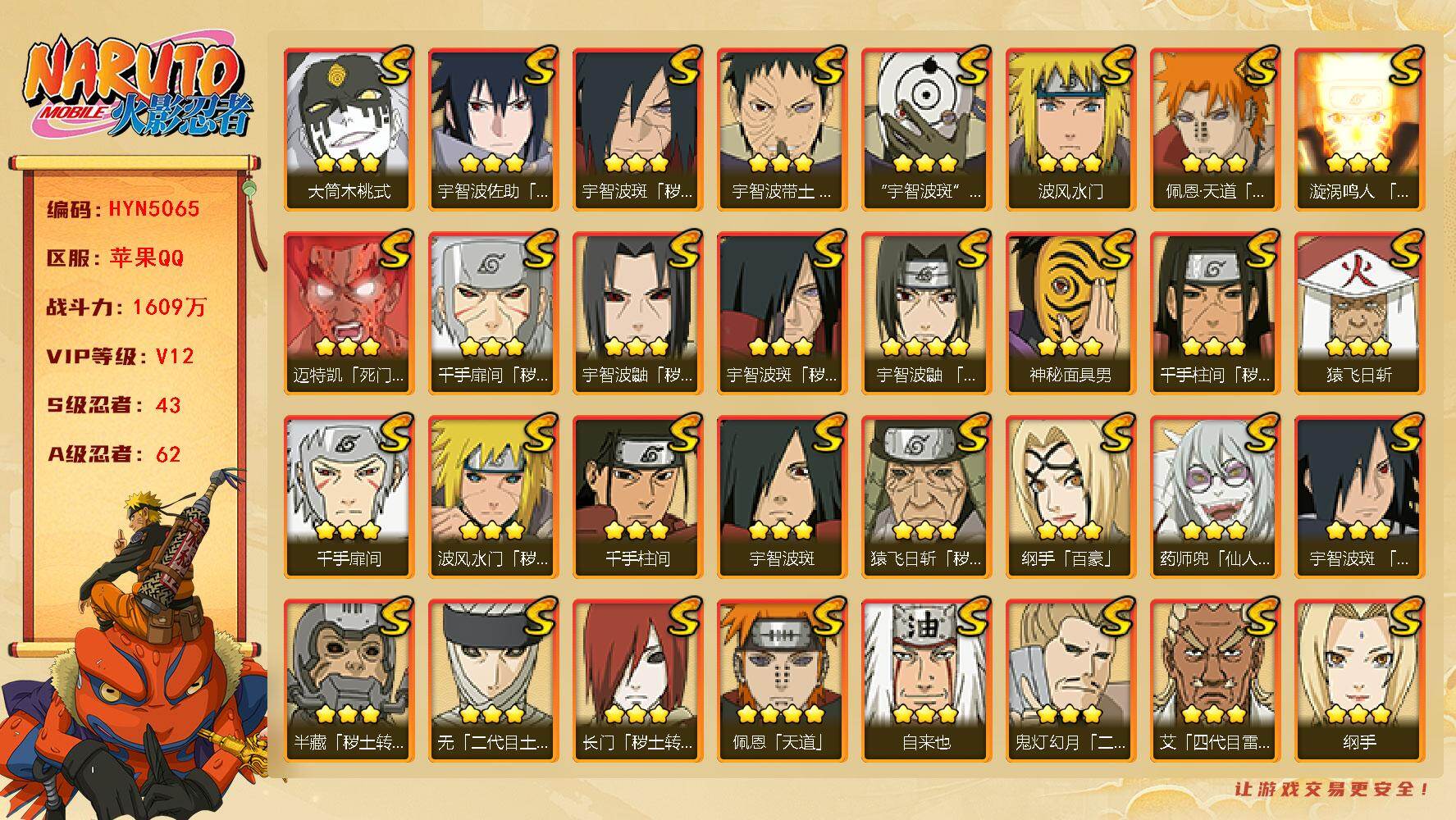 PX_2380500-065】V12/战力1609W/S忍43/A忍62/秽土斑/达鲁伊/须佐能乎旗木卡卡西/5星蝎/5星飞段/宇智波斑/秽土日斩/照美冥/千手扉间/5星迈特凯/自来也/秽土扉间/仙人兜/长十郎/3星蝎「绯流琥」/百豪樱/死门凯/恶灵飞段/秽土迪达拉/斗篷兜/忍战樱/永恒万花筒佐助/团藏/不缘/博人传木叶丸/虎皮面具男/晓大蛇/日向宁次「忍界大战」/2星长门「青年」/桃地不再斩/咒印佐助/