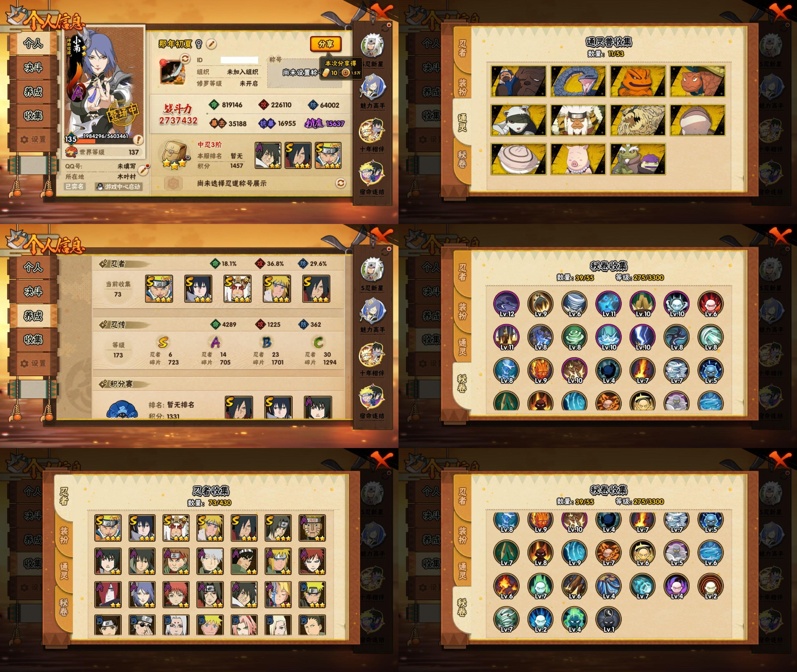 PX_2538349-实名:,可修改,S忍数:,21,A忍数:,29,战力值(万):,13473988,贵族等级:,V8,S级忍者:,千手柱间「秽土转生」,宇智波鼬「秽土转生」,药师兜「仙人模式」,半藏「秽土转生」,猿飞日斩「秽土转生」,长门「秽土转生」,神秘面具男,大蛇丸,波风水门,纲手,自来也,宇智波鼬,「须佐能乎」,自来也「仙人模式」,猿飞日斩,迈特凯「死门」,宇智波带土,「忍界大战」,自来也,「舞之豪杰」,“宇智波斑”,「白面具」,漩涡鸣人,「九喇嘛连结」,宇智波佐助「永恒万花筒」,宇智波斑「秽土转生·解」,通灵兽:,忍犬,忍龟,蛤蟆吉,蓝蛇,猿魔,蛞蝓,蛤蟆仙人,镰鼬,山椒鱼,蜃,鲛鲨,蛤蟆健,乌鸦,蛤蟆龙,蛤蟆广,梦貘,鹰,砂之守鹤