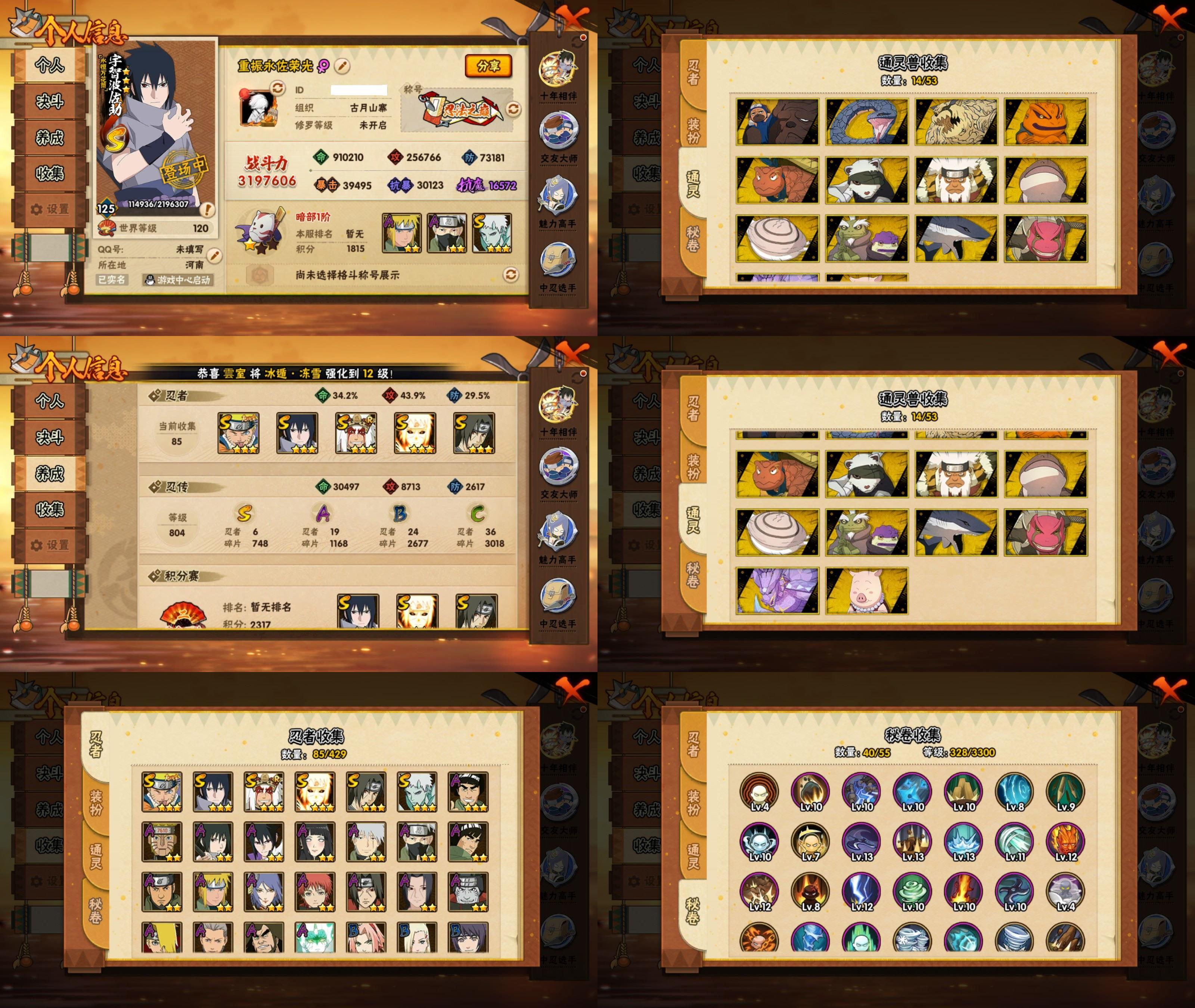 PX_2535988-6S忍/19A忍/战力319W/V7/区服4465 【S忍者】,宇智波带土「十尾人柱力」,宇智波佐助「漩涡鸣人」,宇智波佐助「永恒万花筒」,自来也「舞之豪杰」,宇智波鼬「须佐能乎」,波风水门「九喇嘛连结」, 【A忍者】,宇智波佐助「侠隐江湖」,小南「神驹佑将」,旗木卡卡西「神威对决」,机械鸣人「初始形态」,巳月「仙人模式」,迈特凯「青春爆炸」,宇智波鼬「夏日限定」,日向雏田「最终章」,旗木卡卡西「幻之真容」,神农「羁绊」,波风水门「青年」,宇智波佐助「须佐能乎」,飞段,迪达拉,蝎,干柿鬼鲛,宇智波鼬,猿飞阿斯玛,迈特凯,