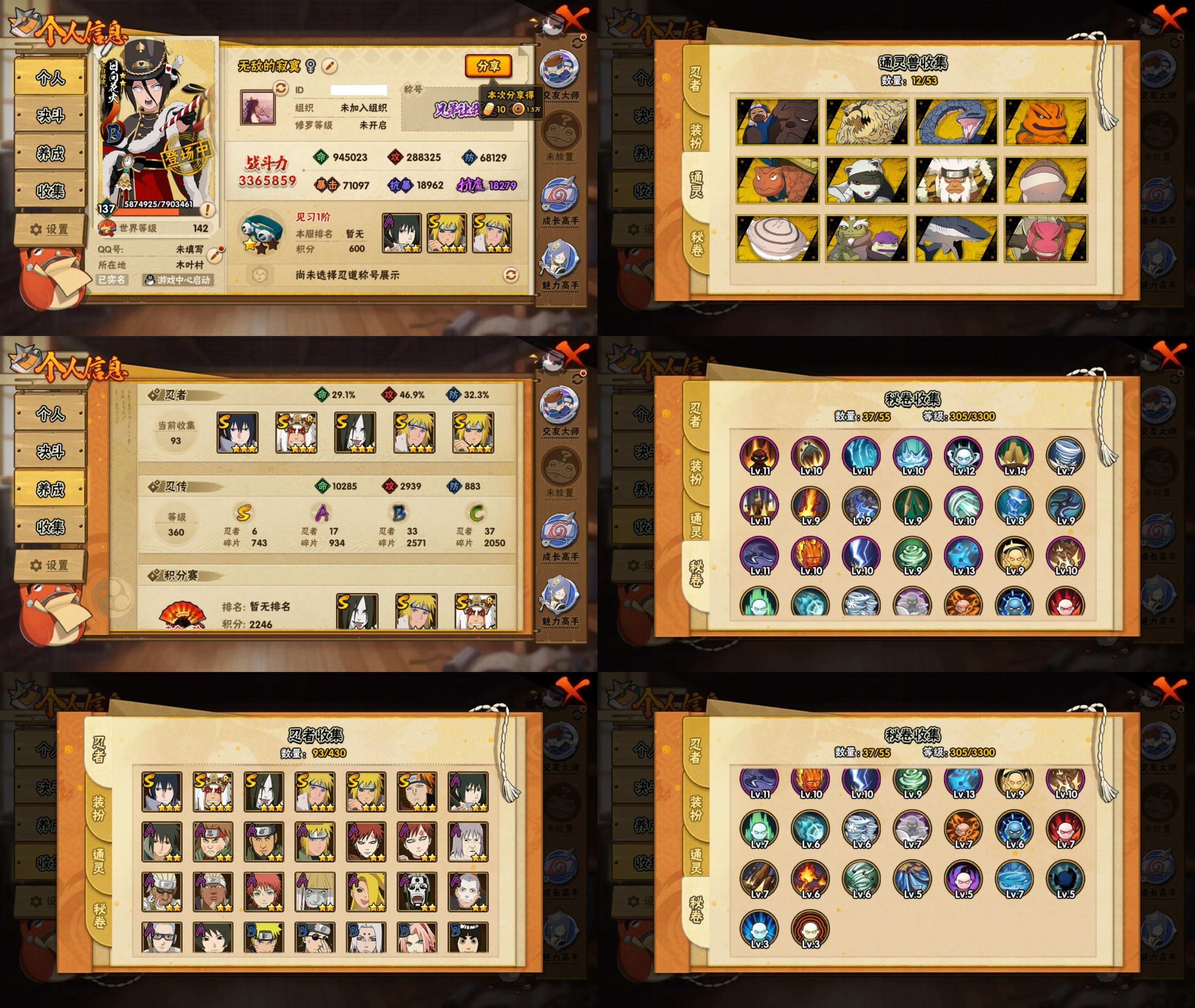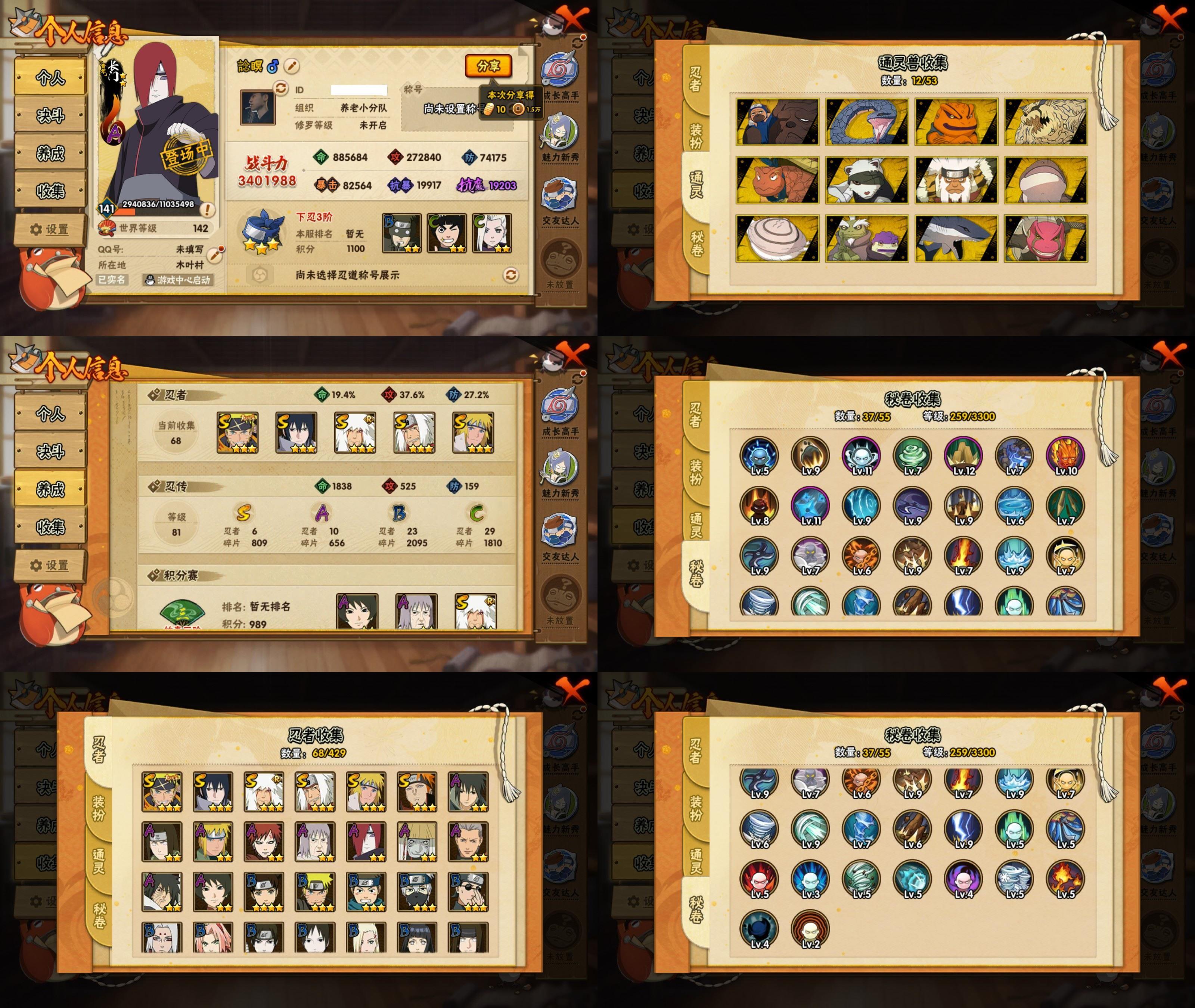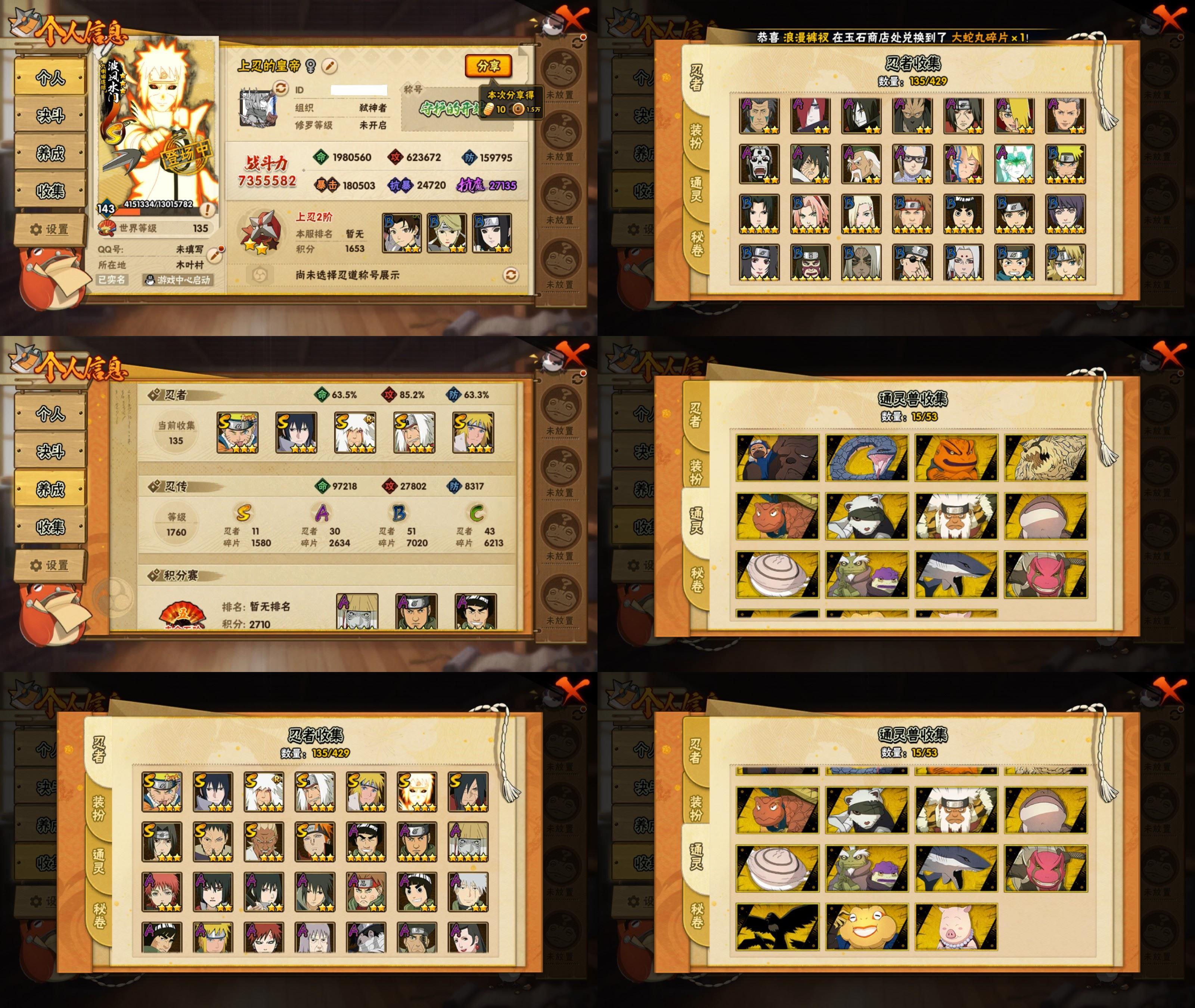 PX_2543510-11S忍/30A忍/战力735W/V6/区服3599 【S忍者】,宇智波佐助「漩涡鸣人」,艾「忍界大战」,宇智波斑「秽土转生·解」,宇智波佐助「永恒万花筒」,宇智波带土「忍界大战」,自来也「舞之豪杰」,自来也「传说中的三忍」,宇智波鼬「须佐能乎」,佩恩「天道」,波风水门,波风水门「九喇嘛连结」, 【A忍者】,大野木「侠隐江湖」,巳月「仙人模式」,迈特凯「青春爆炸」,土台「忍界大战」,长十郎「六代目水影」,不缘,漩涡博人「桃式显现」,旗木卡卡西「幻之真容」,李洛克「忍界大战」,不动,蝎「绯流琥」,宇智波泉奈,桃地再不斩「秽土转生」,长门「青年」,波风水门「青年」,宇智波佐助「须佐能乎」,宇智波带土「暴怒」,千代「近松十人卫」,秋道丁次「忍界大战」,大蛇丸「晓」,宇智波佐助「万花筒写轮眼」,飞段「死司凭血」,飞段,迪达拉,我爱罗「疾风传」,蝎,干柿鬼鲛,宇智波鼬,猿飞阿斯玛,迈特凯,