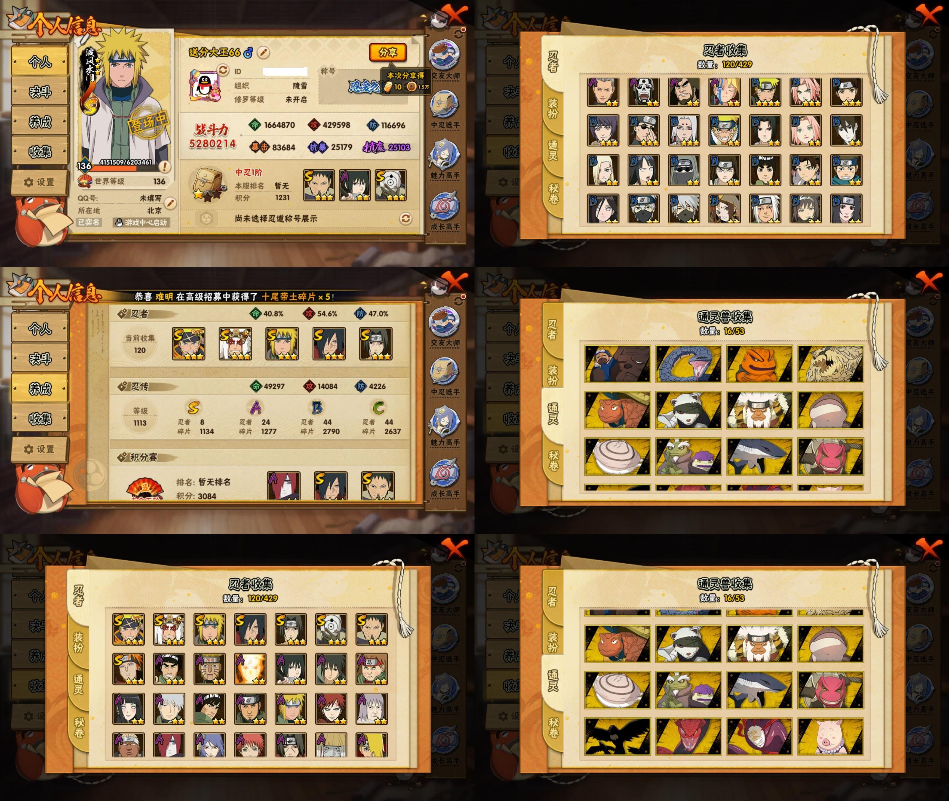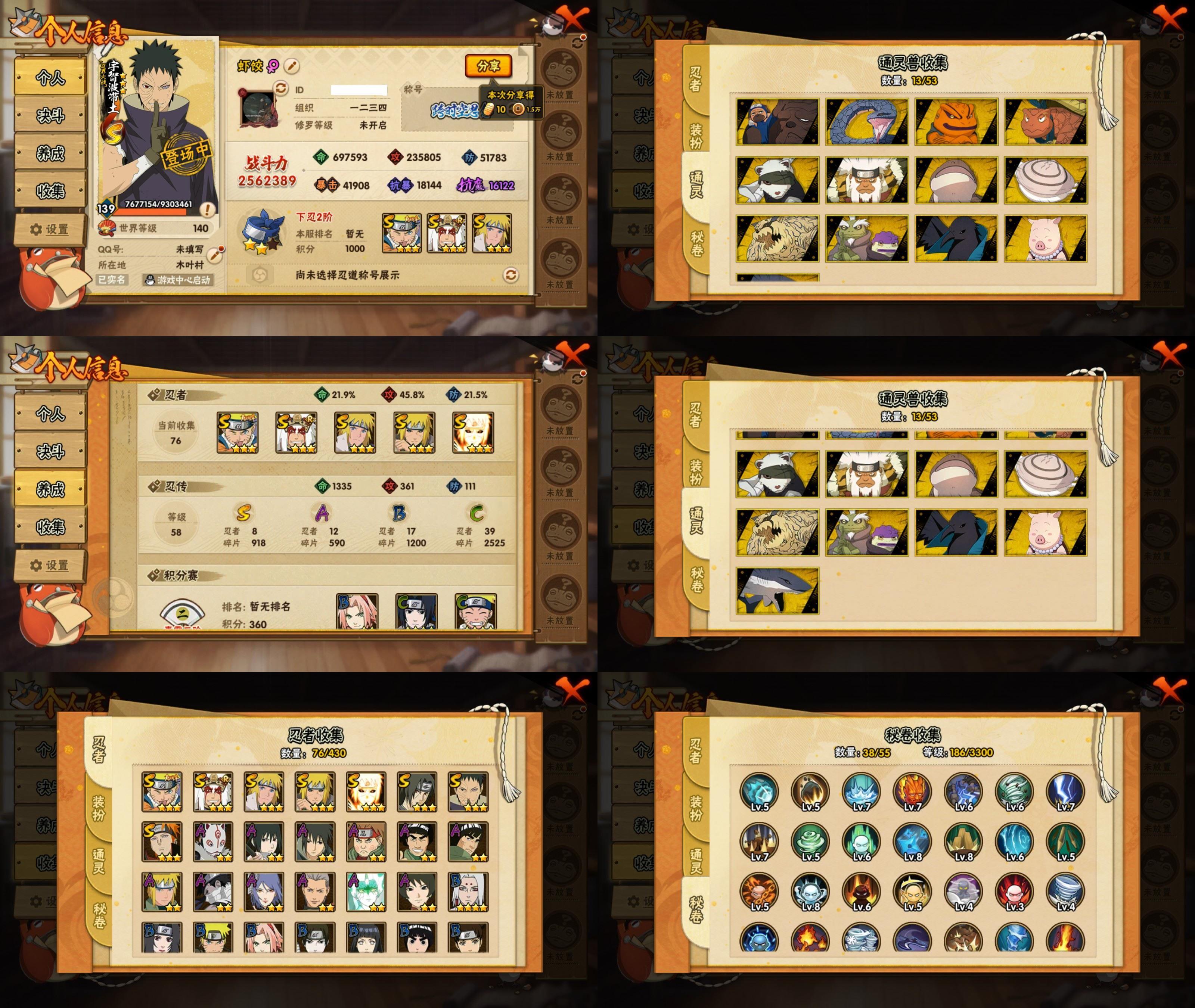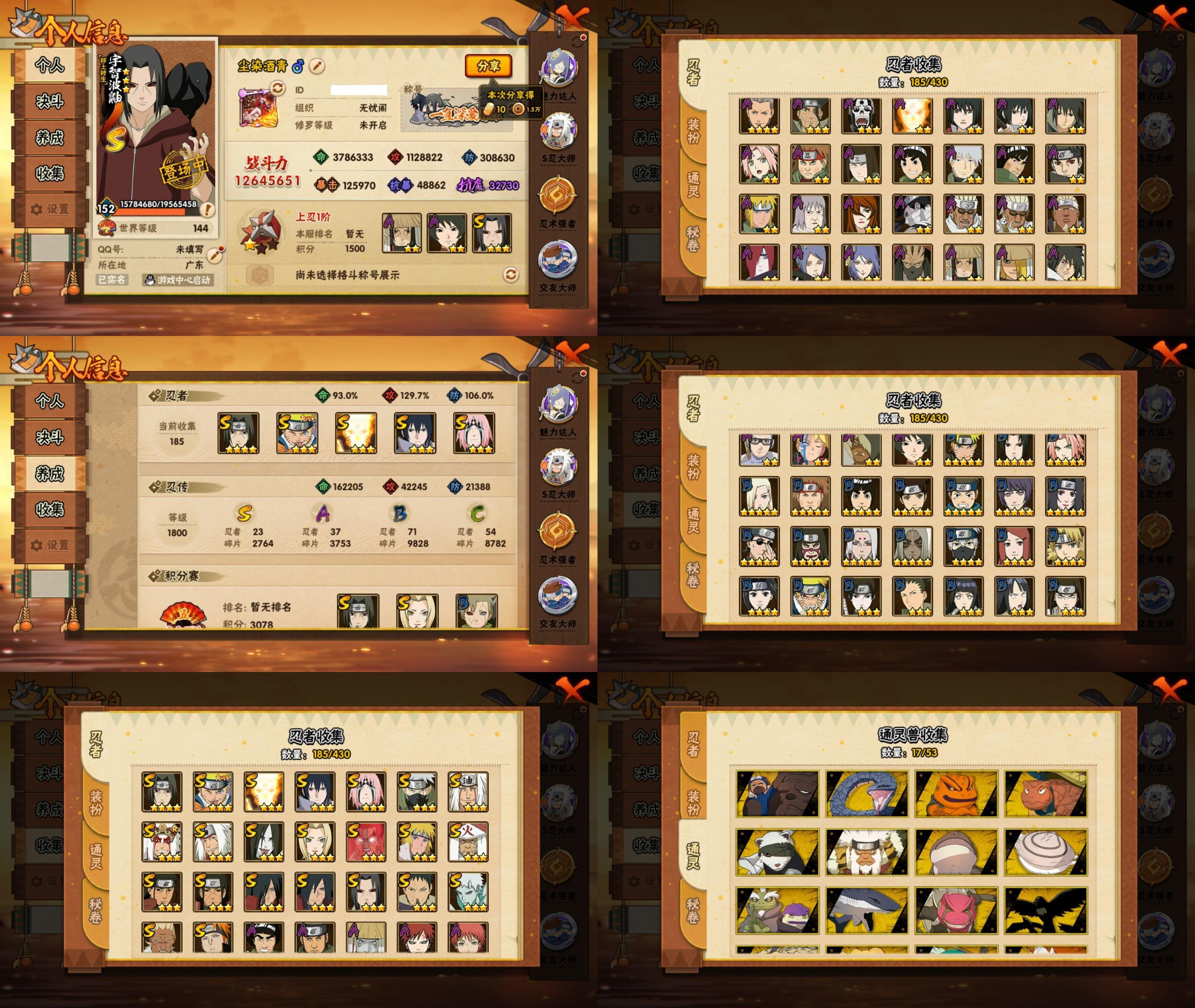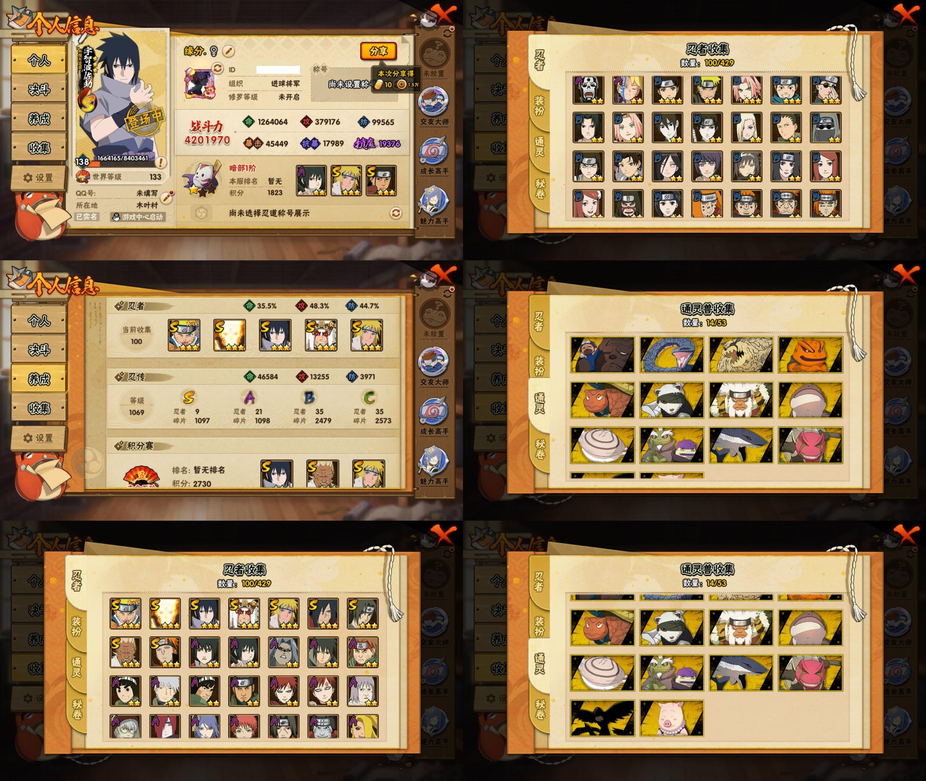 PX_2543510-11S忍/30A忍/战力735W/V6/区服3599 【S忍者】,宇智波佐助「漩涡鸣人」,艾「忍界大战」,宇智波斑「秽土转生·解」,宇智波佐助「永恒万花筒」,宇智波带土「忍界大战」,自来也「舞之豪杰」,自来也「传说中的三忍」,宇智波鼬「须佐能乎」,佩恩「天道」,波风水门,波风水门「九喇嘛连结」, 【A忍者】,大野木「侠隐江湖」,巳月「仙人模式」,迈特凯「青春爆炸」,土台「忍界大战」,长十郎「六代目水影」,不缘,漩涡博人「桃式显现」,旗木卡卡西「幻之真容」,李洛克「忍界大战」,不动,蝎「绯流琥」,宇智波泉奈,桃地再不斩「秽土转生」,长门「青年」,波风水门「青年」,宇智波佐助「须佐能乎」,宇智波带土「暴怒」,千代「近松十人卫」,秋道丁次「忍界大战」,大蛇丸「晓」,宇智波佐助「万花筒写轮眼」,飞段「死司凭血」,飞段,迪达拉,我爱罗「疾风传」,蝎,干柿鬼鲛,宇智波鼬,猿飞阿斯玛,迈特凯,