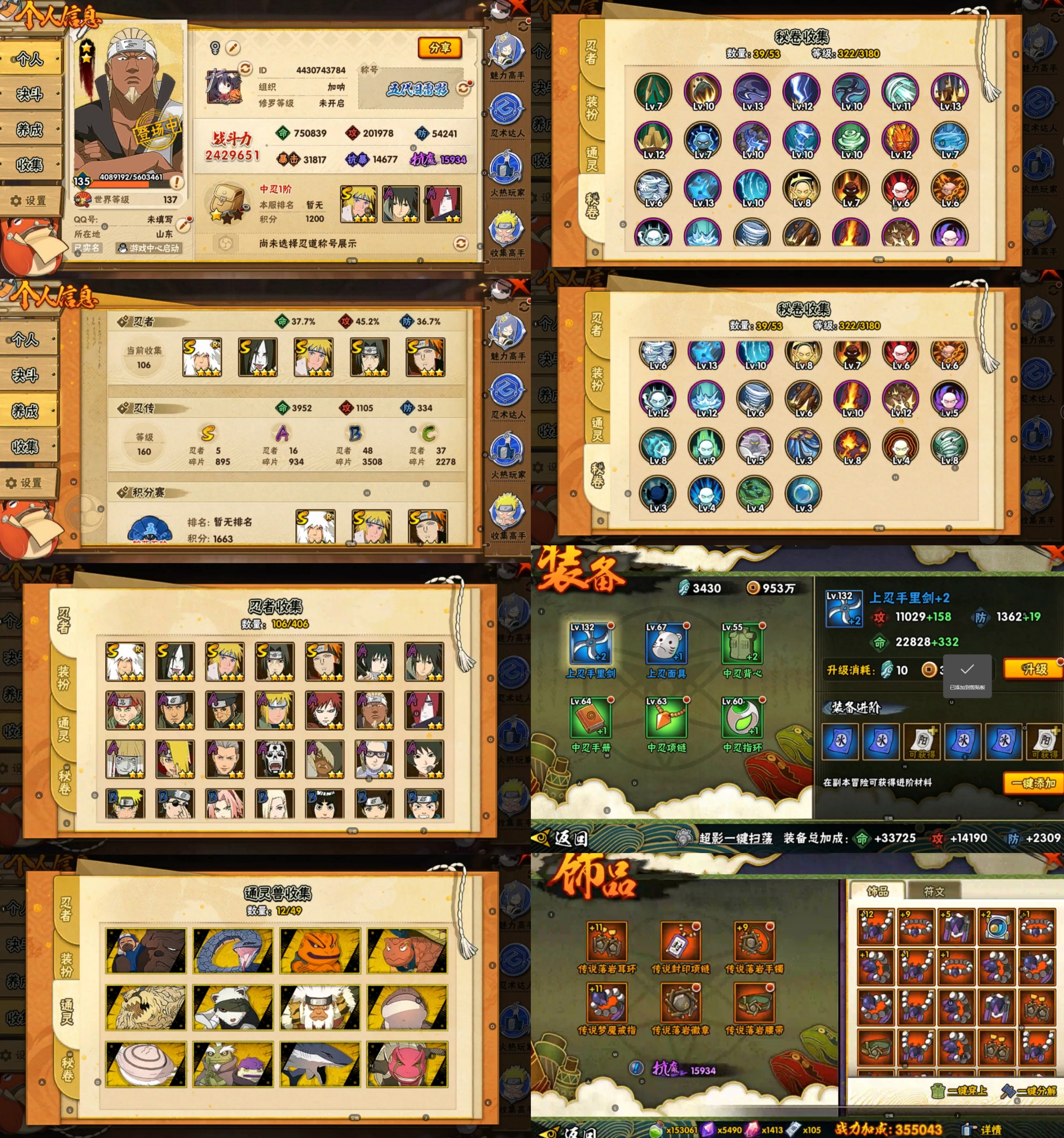 PX_2171282-5S忍/20A忍/战力346W/V6/区服4094 【S忍者】,自来也「舞之豪杰」,旗木卡卡西「须佐能乎」,自来也「传说中的三忍」,宇智波鼬「须佐能乎」,佩恩「天道」, 【A忍者】,不缘,日向雏田「最终章」,旗木卡卡西「幻之真容」,李洛克「忍界大战」,蝎「绯流琥」,宇智波泉奈,神农「羁绊」,桃地再不斩「秽土转生」,角都「秽土转生」,千代「近松十人卫」,药师兜「半蛇斗篷」,飞段「死司凭血」,迪达拉,我爱罗「疾风传」,蝎,干柿鬼鲛,宇智波鼬,猿飞阿斯玛,迈特凯,