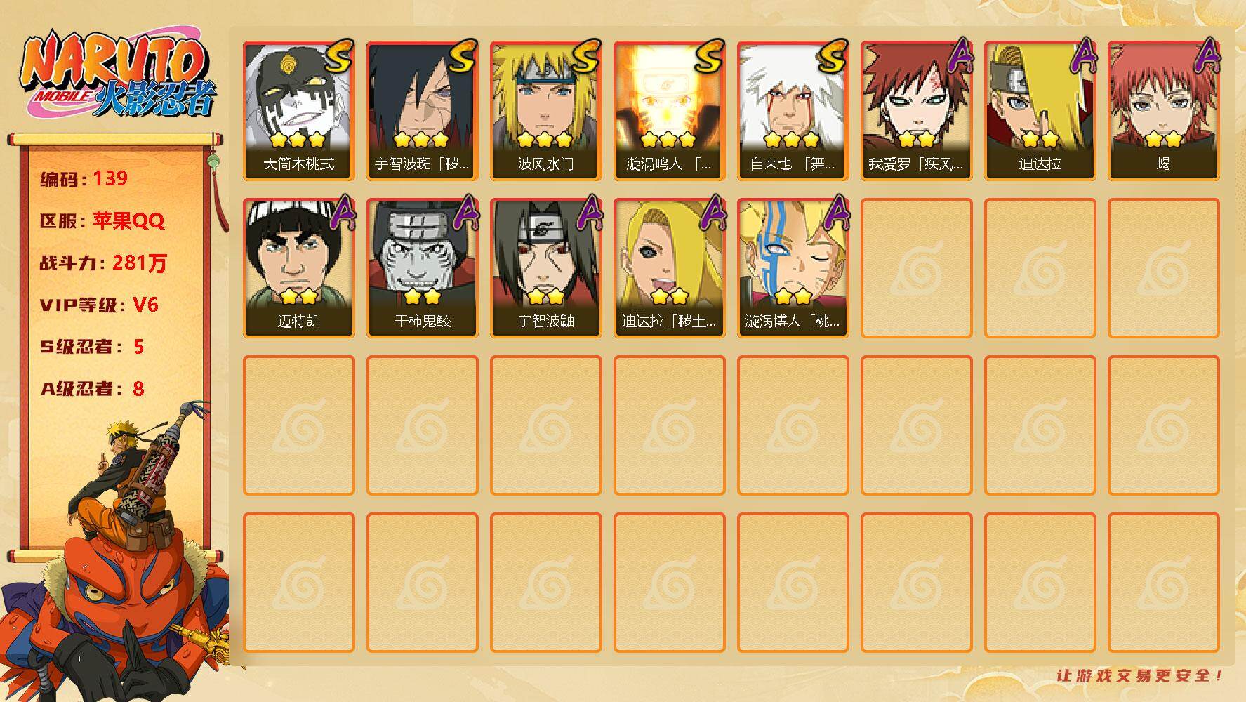 PX_2152500-可换绑,XD0141,可二次,V6/战力281W/S忍5/A忍8/744区服,3星大筒木桃式,3星宇智波斑「秽土转生·解」,3星波风水门,3星漩涡鸣人「九喇嘛连结」,3星自来也「舞之豪杰」,2星我爱罗「疾风传」,2星迪达拉,2星蝎,2星迈特凯,2星干柿鬼鲛,2星宇智波鼬,2星迪达拉「秽土转生」,2星漩涡博人「桃式显现」
