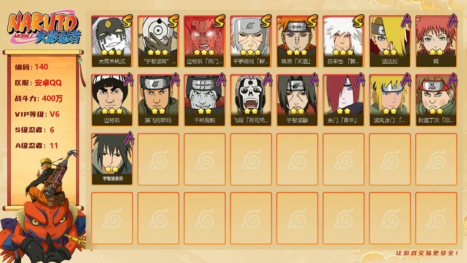 PX_2152501-可换绑,XD0151,可二次,V6/战力400W/S忍6/A忍11/3879区服,3星大筒木桃式,3星宇智波斑「白面具」,3星迈特凯「死门」,3星千手扉间「秽土转生」,3星佩恩「天道」,3星自来也「舞之豪杰」,2星迪达拉,2星蝎,3星迈特凯,2星猿飞阿斯玛,2星干柿鬼鲛,2星飞段「死司凭血」,2星宇智波鼬,2星长门「青年」,2星波风水门「青年」,2星秋道丁次「忍界大战」,2星宇智波泉奈