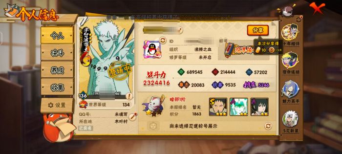 PX_2524112-区服】2712【等级】139【S级数量】4【A级数量】6【B级数量】14【C级数量】25【S级】漩涡鸣人·宇智波佐助,佩恩「天道」,宇智波鼬「须佐能乎」,自来也「舞之豪杰」,【A级】旗木卡卡西「幻之真容」,神秘面具男「忍者之路」,宇智波佐助「须佐能乎」,迈特凯,宇智波泉奈,迈特凯「青春爆炸」,【B级】雨琉「羁绊」,春野樱「忍者少女」,漩涡鸣人「疾风传」,御手洗红豆,佩恩「修罗道」,山中井