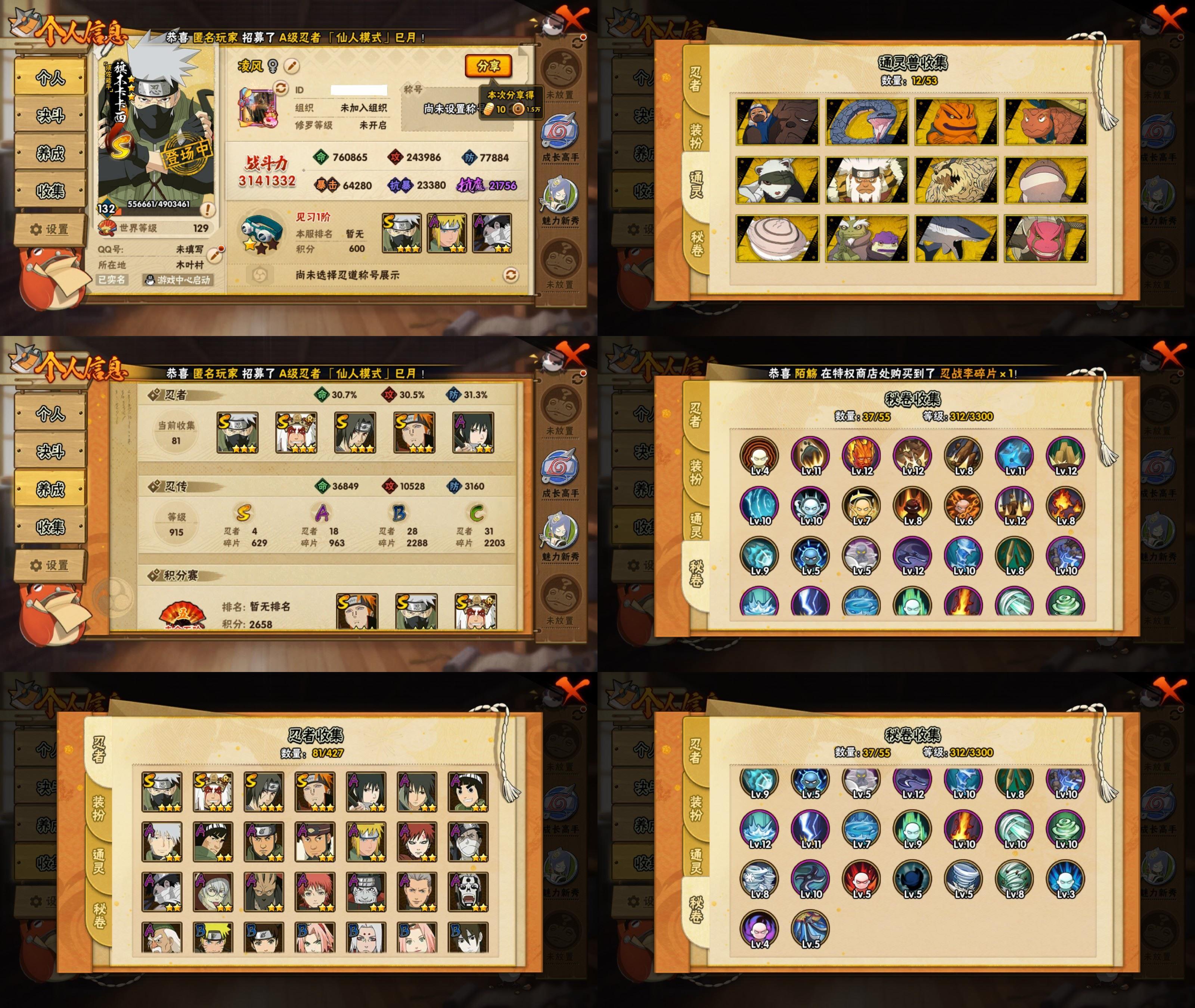 PX_2493715-6S忍/21A忍/战力350W/V6/区服3383 【S忍者】,宇智波佐助「漩涡鸣人」,自来也「舞之豪杰」,自来也「传说中的三忍」,宇智波鼬「须佐能乎」,佩恩「天道」,波风水门, 【A忍者】,小南「神驹佑将」,迈特凯「青春爆炸」,药师兜「侠隐江湖」,漩涡博人「桃式显现」,李洛克「忍界大战」,蝎「绯流琥」,宇智波泉奈,桃地再不斩「秽土转生」,迪达拉「秽土转生」,宇智波带土「暴怒」,千代「近松十人卫」,药师兜「半蛇斗篷」,春野樱「百豪」,宇智波佐助「万花筒写轮眼」,志村团藏,飞段,我爱罗「疾风传」,干柿鬼鲛,宇智波鼬,猿飞阿斯玛,迈特凯,