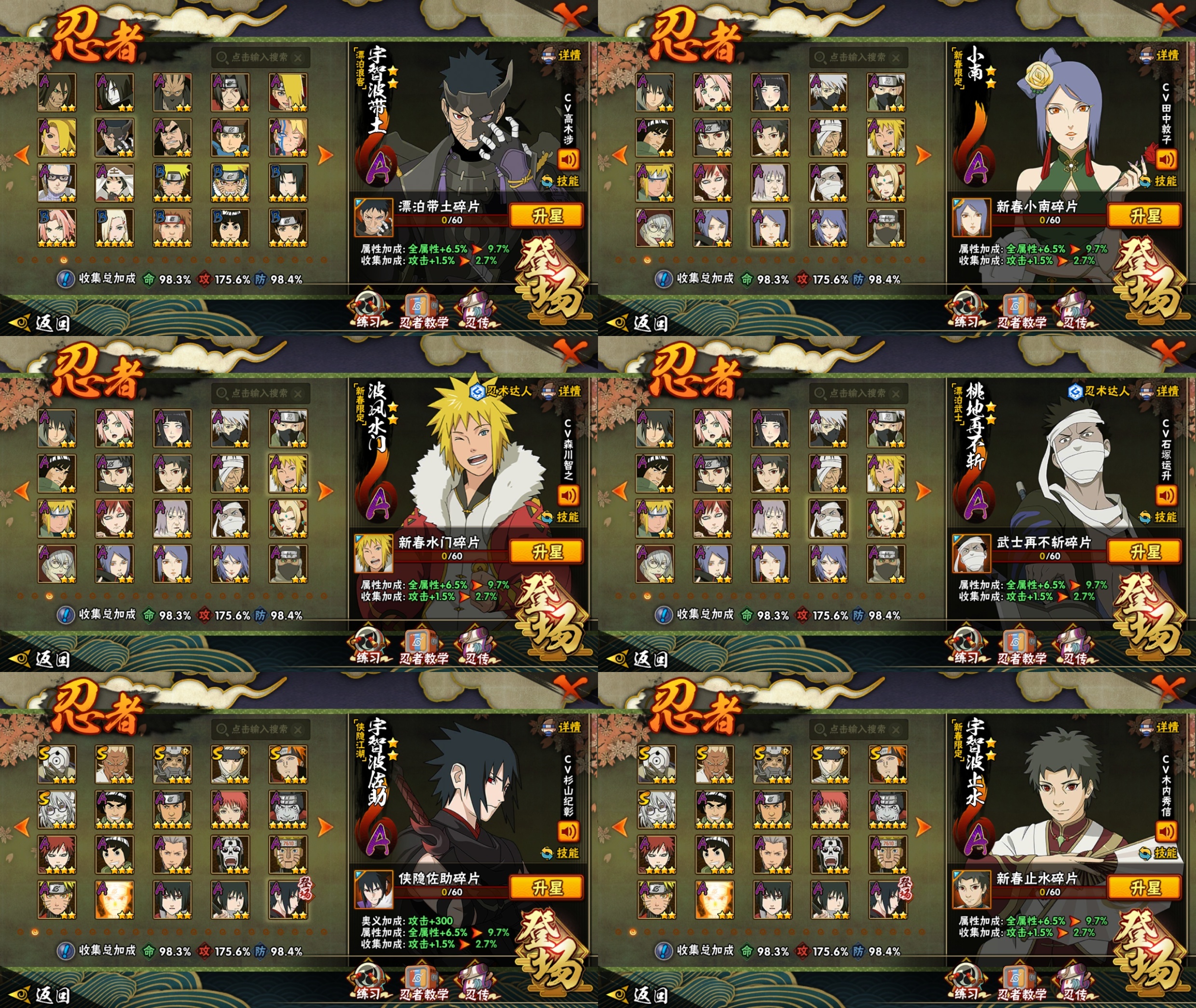 PX_2540971-6S忍/21A忍/战力410W/V7/区服3933,(神驹老马.新春小南) 【S忍者】,宇智波佐助「漩涡鸣人」,千手柱间「秽土转生」,自来也「舞之豪杰」,宇智波鼬「秽土转生」,宇智波鼬「须佐能乎」,佩恩「天道」, 【A忍者】,猿飞阿斯玛「神驹佑将」,小南「新春限定」,小南「神驹佑将」,迈特凯「青春爆炸」,长十郎「六代目水影」,宇智波泉奈,神秘面具男「忍者之路」,波风水门「青年」,宇智波佐助「须佐能乎」,漩涡鸣人「九尾查克拉」,千代「近松十人卫」,药师兜「半蛇斗篷」,宇智波佐助「万花筒写轮眼」,飞段,迪达拉,蝎,干柿鬼鲛,宇智波鼬,猿飞阿斯玛,迈特凯,桃地再不斩,