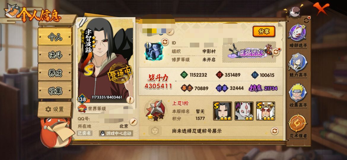 PX_2486280-11,A忍者35,通灵20】【安卓Q-3189区-145级-V8-907万战力】【S级】宇智波斑「秽土转生」,自来也「舞之豪杰」,波风水门,佩恩「天道」,宇智波斑「秽土转生·解」,自来也「传说中的三忍」,宇智波鼬「须佐能乎」,漩涡鸣人·宇智波佐助,宇智波佐助「永恒万花筒」,春野樱「忍界大战」,漩涡鸣人「九喇嘛连结」【A级】漩涡博人「桃式显现」,春野樱「百豪」,飞段「死司凭血」,宇智波鼬「