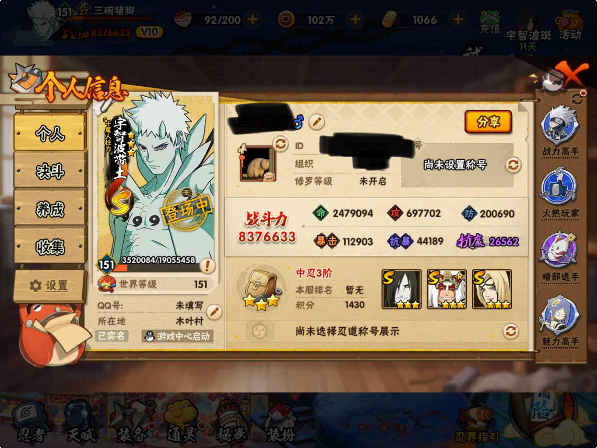 PX_2483641-0,A忍者25,通灵15】【安卓Q-2303区-141级-V8-494万战力】【S级】宇智波鼬「须佐能乎」,漩涡鸣人·宇智波佐助,大蛇丸,佩恩「天道」,宇智波斑「白面具」,宇智波斑「秽土转生·解」,波风水门,宇智波鼬「秽土转生」,春野樱「忍界大战」,自来也「舞之豪杰」【A级】猿飞阿斯玛,旗木卡卡西「幻之真容」,漩涡博人「桃式显现」,宇智波佐助「万花筒写轮眼」,迈特凯「青春爆炸」,长门「青