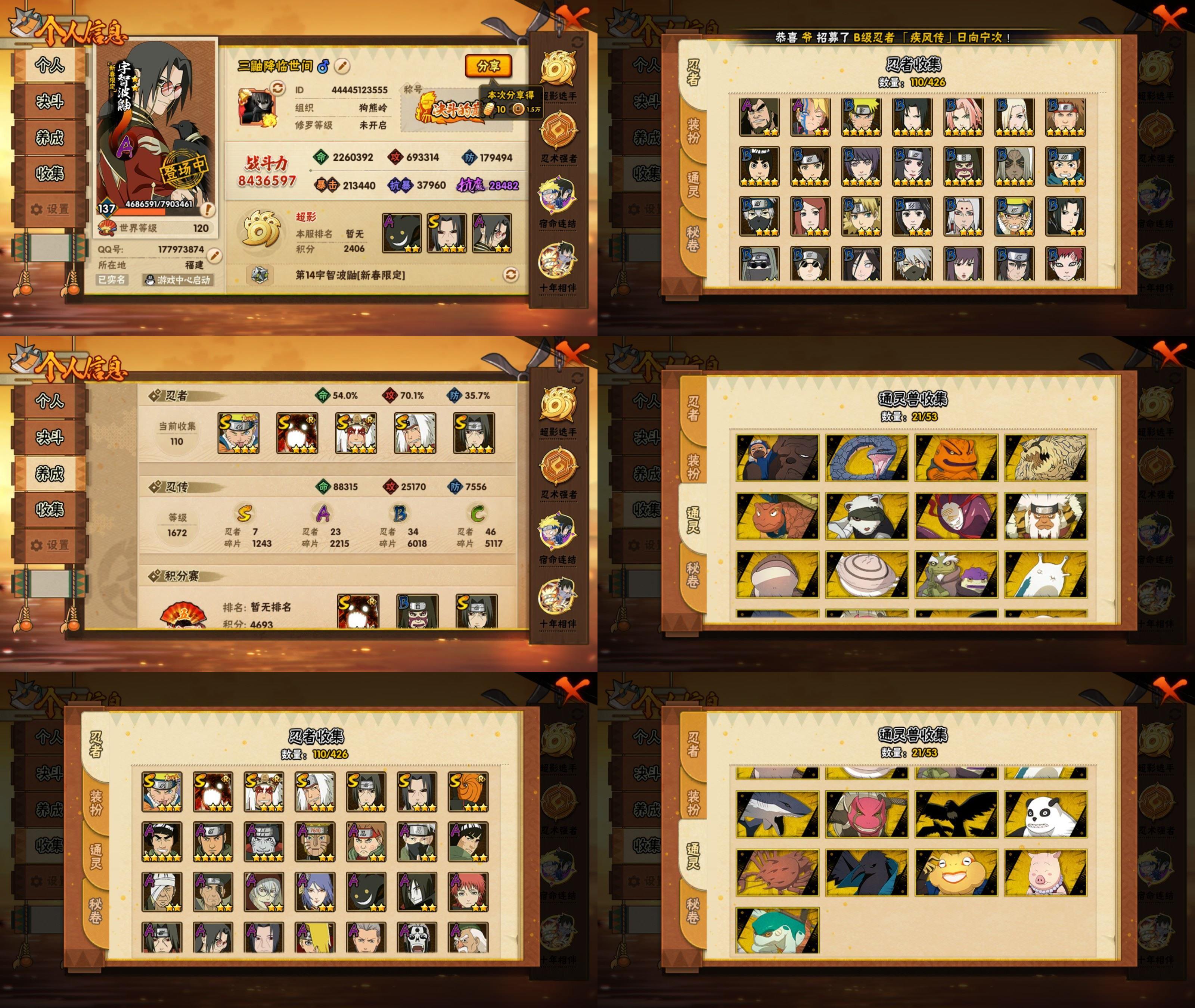 PX_2480100-7S忍/23A忍/战力843W/V11/区服4451 【S忍者】,宇智波佐助「漩涡鸣人」,宇智波斑「五影会谈」 ,自来也「舞之豪杰」,自来也「传说中的三忍」,漩涡鸣人「暴怒·第六尾」,宇智波鼬「秽土转生」,宇智波鼬「须佐能乎」, 【A忍者】,小南「神驹佑将」,机械鸣人「初始形态」,大野木「侠隐江湖」,迈特凯「青春爆炸」,土台「忍界大战」,漩涡博人「桃式显现」,宇智波鼬「夏日限定」,黑绝,神农「羁绊」,药师兜「半蛇斗篷」,宇智波鼬「新春限定」,秋道丁次「忍界大战」,大蛇丸「晓」,志村团藏,飞段「死司凭血」,飞段,迪达拉,蝎,干柿鬼鲛,宇智波鼬,猿飞阿斯玛,迈特凯,