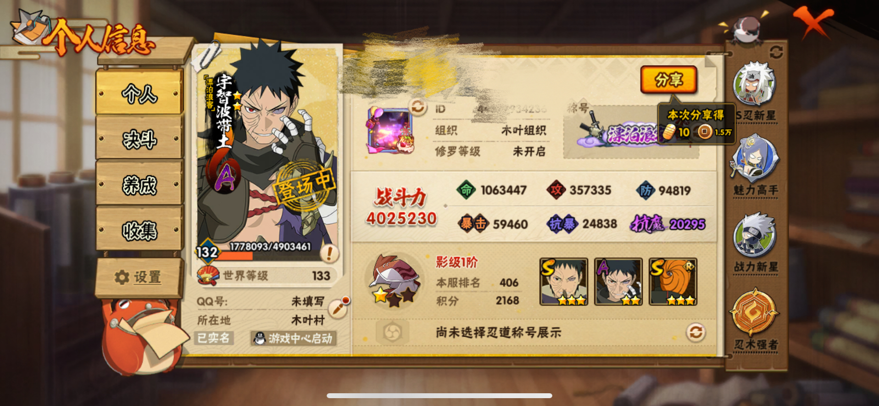 PX_2477980-服】3779【等级】132【S级数量】7【A级数量】26【B级数量】33【C级数量】41【S级】自来也「舞之豪杰」,宇智波斑「白面具」,宇智波鼬「须佐能乎」,宇智波带土「忍界大战」,佩恩「天道」,宇智波斑「五影会谈」,漩涡鸣人·宇智波佐助【A级】巳月「仙人模式」,猿飞阿斯玛,蝎「绯流琥」,飞段「死司凭血」,飞段,大野木「侠隐江湖」,达鲁伊「五代目雷影」,干柿鬼鲛,千代