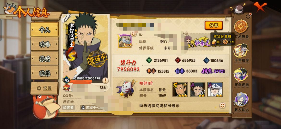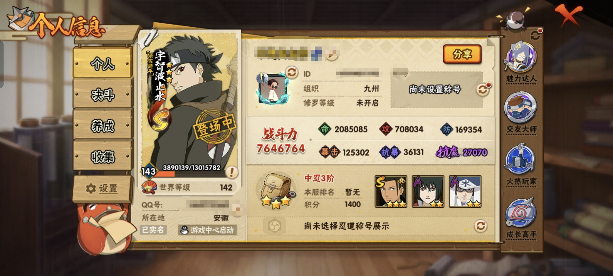 PX_2462989-40A,VIP11】【区服】安卓Q,1940【等级】143【S级数量】15【A级数量】40【B级数量】64【C级数量】54【S级】自来也「传说中的三忍」,大筒木桃式,宇智波斑「秽土转生·解」,千手扉间「秽土转生」,佩恩「天道」,宇智波止水「须佐能乎」,宇智波鼬「须佐能乎」,千手柱间「木叶创立」,波风水门,自来也「舞之豪杰」,旗木卡卡西「须佐能乎」,漩涡鸣人·宇智波佐助,宇智波佐助「永恒万