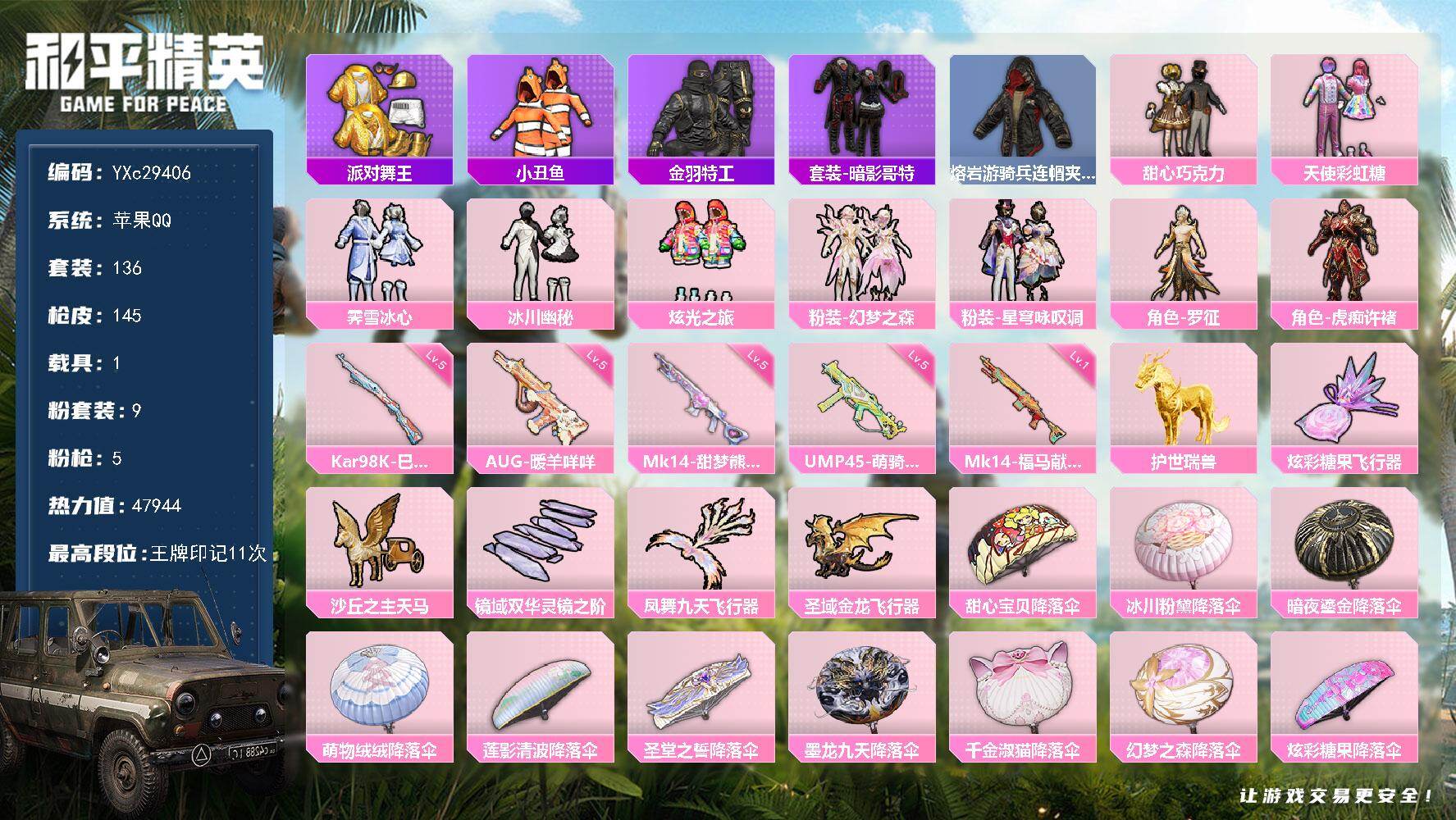 PX_2555062-??,巧克力,小丑鱼,哥特,满地铁天赋】YXc29406-【无二次协助处理】【因赛季更新游戏段付以上号为准!】 苹果Q-3稀有1载具9粉装5特效枪6热门136套装145枪皮,,11印记,历史超级王牌12星, 【3稀有】,AKM-缤纷海域,派对舞王,派对舞王(金靴子), 【1载具】,护世瑞兽, 【9粉装】,天使彩虹糖,甜心巧克力,虎痴许褚,罗征,炫光之旅,星穹咏叹调,幻梦之森,冰川幽秘,霁雪冰心, 【5特效枪】,Kar98K-巳巳如意,(5级),AUG-暖羊咩咩,(5级),Mk14-甜梦熊击,(5级),Mk14-福马献瑞,(1级),UMP45-萌骑冒险,(5级), 【6热门】,小丑鱼,晶辉守护,金羽特工,暗影哥特,破蛋小黄鸡,极速红龙, 【1头盔】,甜心宝贝头盔, 【1背包】,甜心宝贝背包,