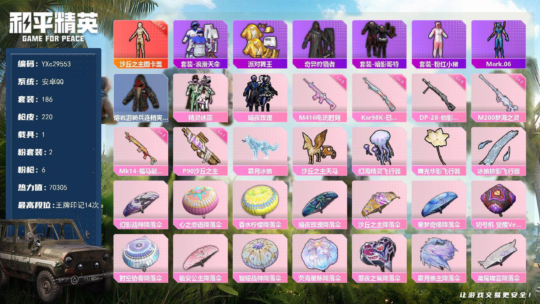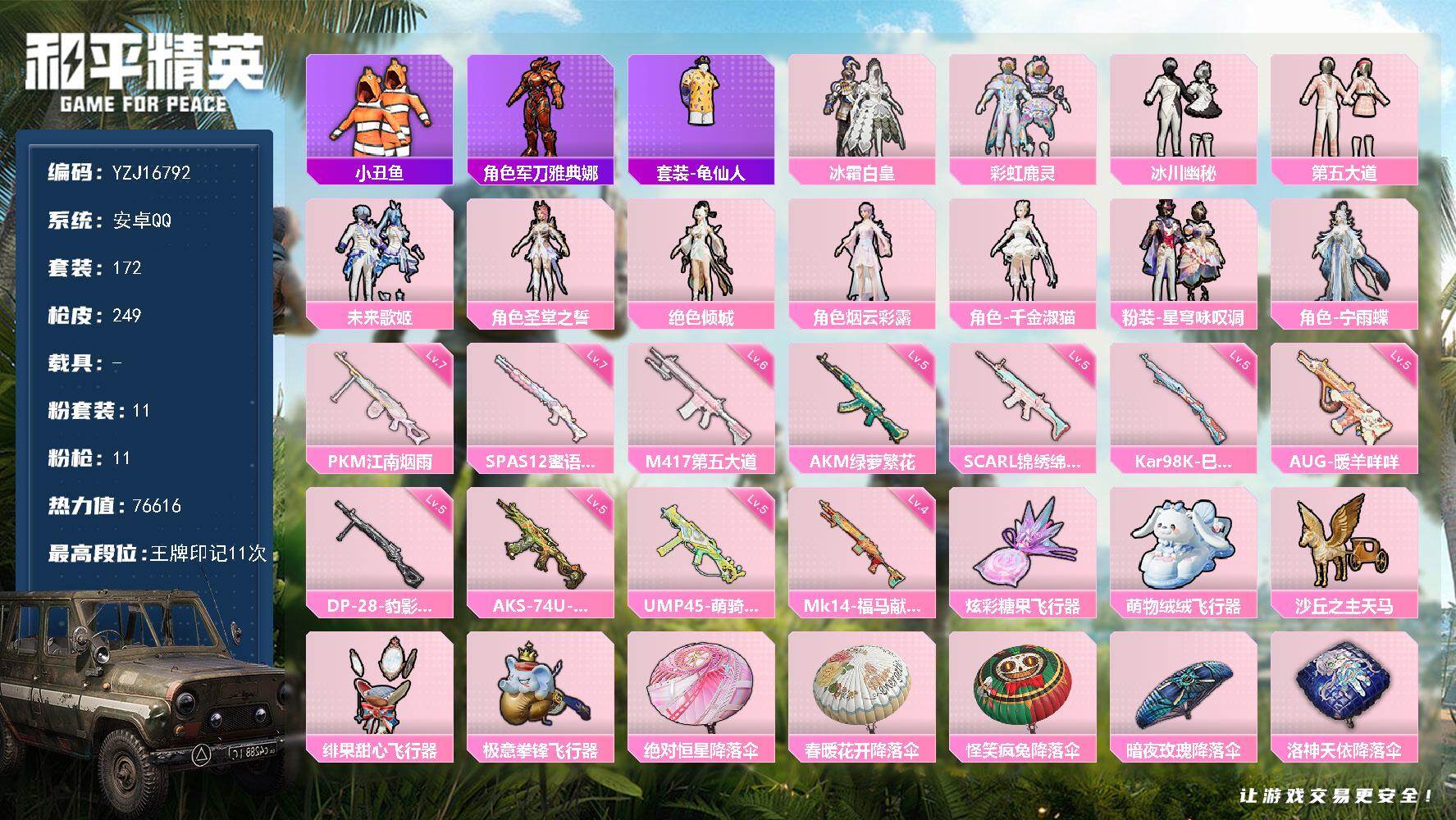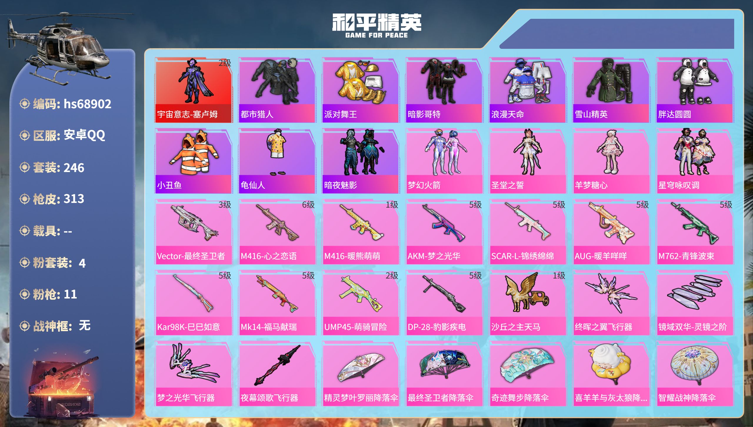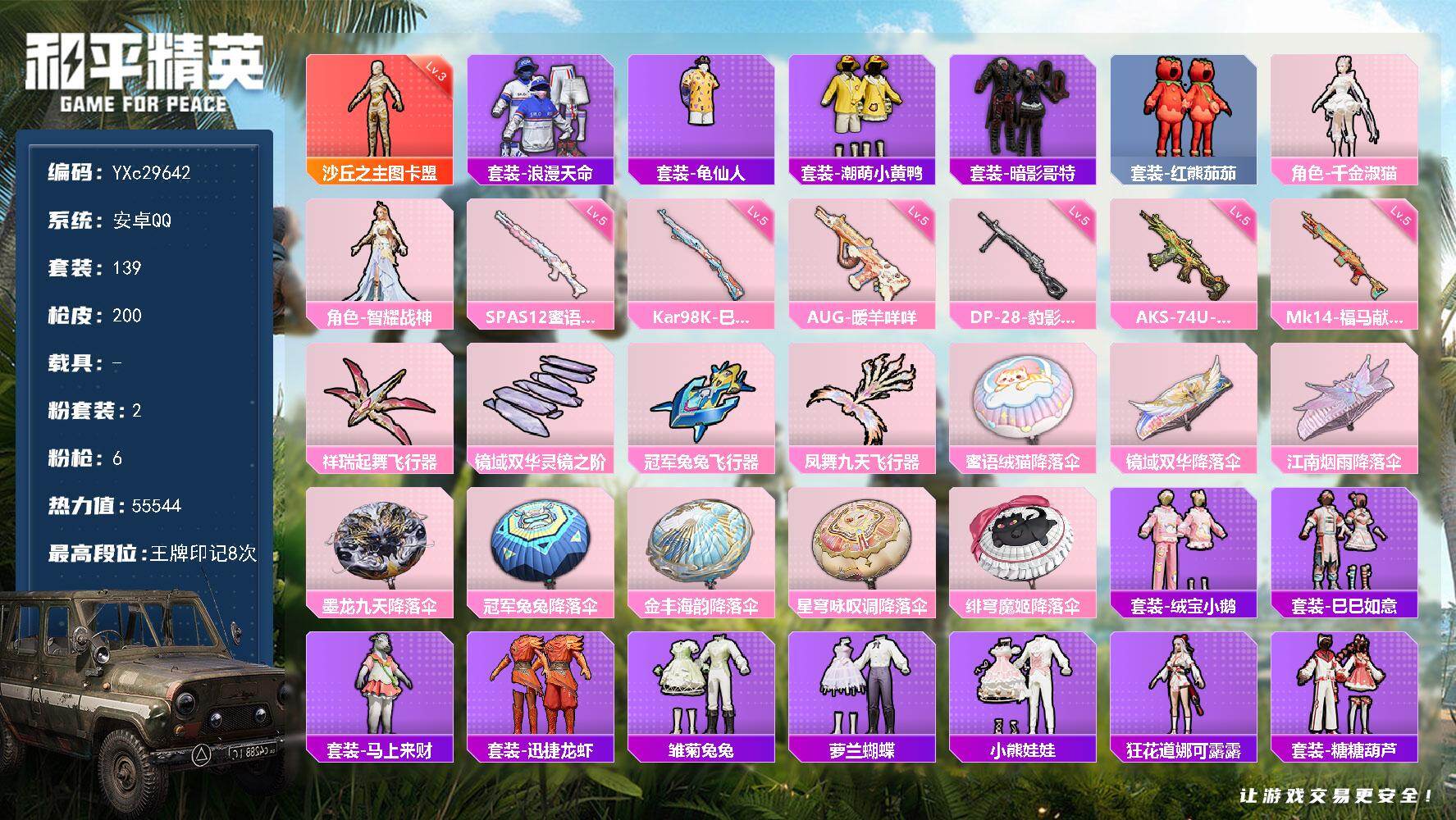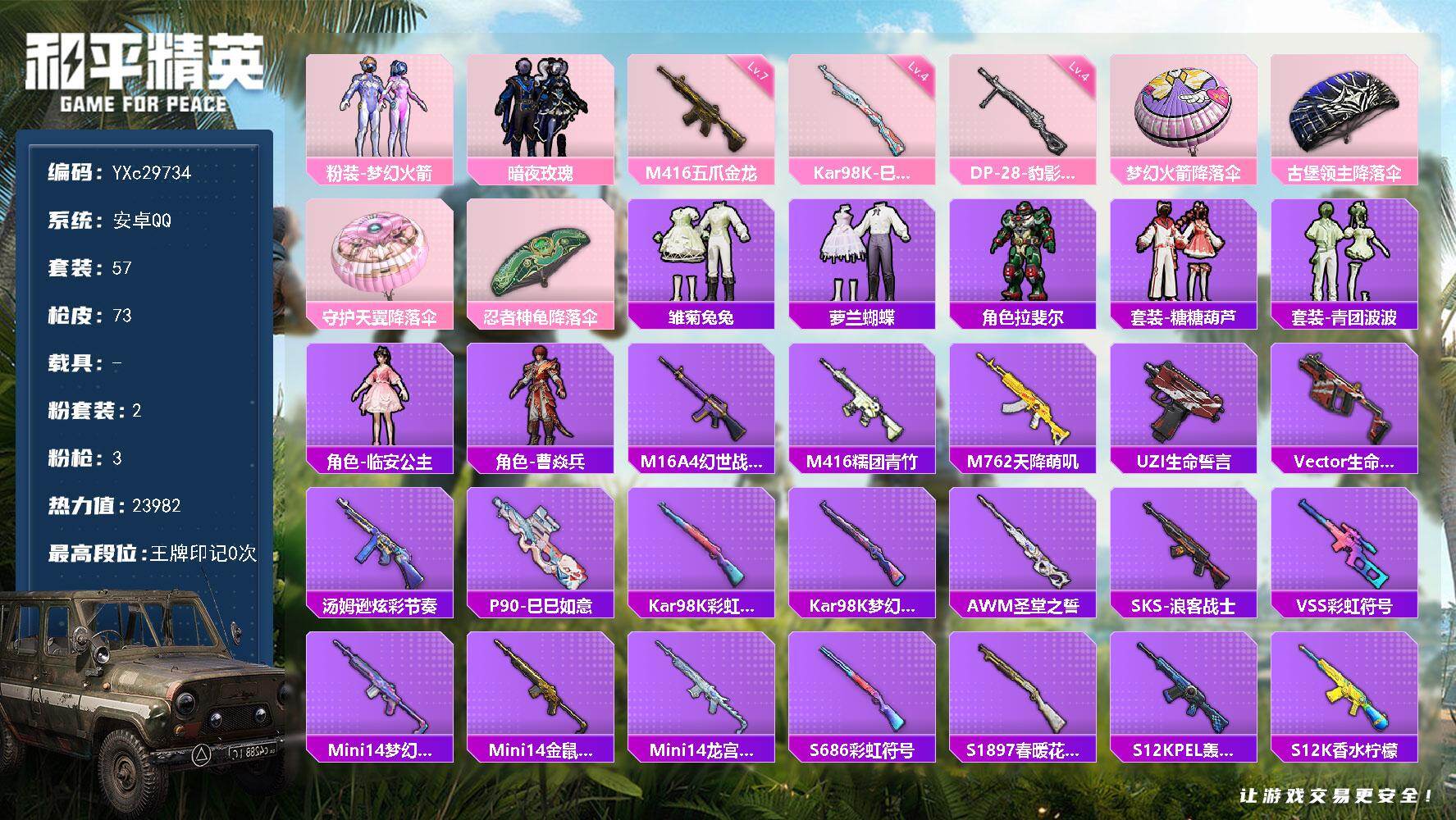 PX_2558653-,安卓手Q-21王牌印记-1红装-4粉装-11特效枪-98217热力值-246套装-313枪皮-8卓越印记-5传奇印记 【1红装】宇宙意志-塞卢姆/2级 【4粉装】套装-梦幻火箭,套装-星穹咏叹调,角色-羊梦糖心,角色-圣堂之誓 【11特效枪】Mk14-福马献瑞/5级,M416-心之恋语/6级,SCAR-L-锦绣绵绵/5级,Vector-最终圣卫者/3级,Kar98K-巳巳如意/5级,AKM-梦之光华/5级,UMP45-萌骑冒险/2级,DP-28-豹影疾电/5级,M762-青锋波束/5级,AUG-暖羊咩咩/5级,M416-暖熊萌萌/1级 【9稀有紫装】都市猎人,派对舞王,暗影哥特,浪漫天命,雪山精英,胖达圆圆,小丑鱼,龟仙人,暗夜魅影 【245稀有时装】塞卢姆/2级,梦幻火箭,圣堂之誓,羊梦糖心,星穹咏叹调,SS38特训,都市猎人,浪漫天命,龟仙人,雪山精英,暗影哥特,小丑鱼,胖达圆圆,派对舞王,好奇恐龙,激萌罗小黑,狂沙舞者,萌趣咩咩,神秘黑猫,龙魂突击队,阿虎,小熊娃娃,迎夏光舞,异域银装,狂花道·娜可露露,幸运青,星渊小夜曲,街头风暴,星途旅人,冰河战士,大橘大利,战术大师,智谋强哥,听雨铃兰,雏菊兔兔,马上有钱,香桃花海,米开朗基罗,蝶变,巳巳如意,曼妙人鱼,元素星魂,午间小调,彩虹兔,琴音绮想,雪绒豹,画境星梦,朱霞炽焰,狂鲨锋刃,阳光菠萝,绛羽幽主,喜羊羊,凌霄紫焰,绯色魅影,萌鸡速递,漫游都市,薄荷星砂,蓝海鲸歌,云朵鹅,引力深渊,顶瓜瓜,恋语绒绒,暗夜魅影,SS35特训,SS29特训,萝兰蝴蝶,SS5特训,SS31特训,SS33特训,冰焰天使,SS32特训,SS16特训,SS36特训,贝斯之夜,焰鹰斗篷,军械专家,醒狮腾龙,菲菲,金鼠迎春,湖雨初晴,福星高照,虎虎生威吉莉,夏日音浪,龙的传人,潮流炫酷,SS8特训,甜梦熊熊,白熊同盟,青玉碎影,SS37特训,SS28特训,特训学院,猎鹰,青年教官,橘黑制服,红色运动,黄色运动,蓝色运动,黄色伏地魔,白色伏地魔,热血青春,冰川格斗者,爆竹金鼠,SS9特训,酒红色名流,湖蓝色名流,黄色名流,酷潮明星,绯格组合,涂山之恋,伏击者,SS26特训,漫步者,空岛之星,热情海星,黑色伏地魔,黎明保卫者,炫蓝之夏,纯真浪花,SS34特训,骑行爱好者,竞技名士,蓝色守护者,深蓝色名流,猛禽,SS30特训,长空猛禽,沙漠探路者,竞技勇士朋克,特战装甲,战地菁英,旭日情侣,软羊咩咩,甜蜜告白,街头潮人,冥星暗影,冷焰舞者,惊鸿侠骨,魅力单车,灼焰舞者,雪山征服者,春光漫游,夜莺强袭者,野性战魂,甜心亚梦,SS2特训,虚音幻奏,极地朋克,幻世战舞者,战地督导,特殊使命,青涩时光,牛气满满,娇憨猪猪,童话森林,冰川特警,潮流先锋,燃烧卡路里,极速红龙,狙击之神,红釉青花,麻辣教官,鹰眼刺客,雨过天青,福马献瑞,SS3特训,冰冻风暴,完美偶像,SS11特训,人气偶像,幽夜迷踪,SS4特训,幻影武者,俏皮奶喵,破蛋小黄鸡,疯狂小兔子,圣诞大吉,特战英豪,熔岩使者,朱雀圣者,快闪甜心,凛冬战士,北国孤狼,蓝彩潮人,SS6特训,绮丽涂鸦,坚韧舞者,竞技达人朋克,海岛探路者,跃动心情,SS7特训,破晓战魂,酒剑仙,霓虹街区,都市魅力,萌趣颜团子,SS10特训,沙漠兵团,耀粉歌者,探宝勇士,奇趣章鱼,SS12特训,SS27特训,牛气冲天,SS18特训,SS13特训,SS17特训,瑞龙福将,团圆交子,缤纷焰火,异彩先驱,霓虹极客,空投萌叽,金戈铁马,SS19特训,光之冒险,SS20特训,SS21特训,绝对偶像,玉兔迎春,SS22特训,SS23特训,夏日倾情,甜蜜熊情侣,缤纷果语,滨海厨神,SS14特训,神气柴柴,妙红点点,幻彩翩翩,格斗先锋,幻羽潜行,海盐绵绵冰,老实芭蕉,王牌教练,荣耀,柠萌假日,粉红小猪,SS24特训,鹤鸣,懵萌河马,SS25特训,锦衣飞扬,星梦畅游,SS15特训 【314稀有枪械】Vector-最终圣卫者/3级,M416-心之恋语/6级,M416-暖熊萌萌/1级,AKM-梦之光华/5级,SCAR-L-锦绣绵绵/5级,AUG-暖羊咩咩/5级,M762-青锋波束/5级,Kar98K-巳巳如意/5级,Mk14-福马献瑞/5级,UMP45-萌骑冒险/2级,DP-28-豹影疾电/5级,MG3-梦海之灵,QBZ-纯真浪花,AWM-纯真浪花,汤姆逊-纯真浪花,DBS-乌木金纹,AA12-G-纯真浪花,平底锅-纯真浪花,P1911-创世·救赎,AC-VAL-兔兔小魔女,突击盾牌-初号机,觉醒Ver.,S1897-精灵梦叶罗丽,SCAR-L-海盐豹豹,GROZA-海盐豹豹,SLR-金丰海韵,野牛-雏菊兔兔,蝎式手枪-金丰海韵,Mk14-冰河战士,平底锅-雏菊兔兔,M762-雏菊兔兔,Mini14-雏菊兔兔,R1895-雏菊兔兔,UZI-冰河战士,M16A4-冰河战士,MK20-H-乌木金纹,短管霰弹-圣域龙灵,DBS-风迹短诗,莫辛纳甘-风迹短诗,Mini14-鸡智如我,Win94-乌木金纹,MK12-风迹短诗,MK12-乌木金纹,汤姆逊-灵猫魔法师,MG3-霓彩脉冲,DBS-幻彩电音,ACE32-画境星梦,M1加兰德-画境星梦,MP5K-画境星梦,M24-幻彩电音,蜜獾-乌木金纹,M762-云朵鹅,SVD-云朵鹅,蜜獾-绯穹魔姬,SPAS-12-狂鲨锋刃,M417-玩趣呆呆,MK20-H-狂鲨锋刃,AA12-G-画境星梦,平底锅-画境星梦,Mk47-风迹短诗,JS9-凌霄紫焰,MG-36-凌霄紫焰,ARX-凌霄紫焰,AKS-74U-乌木金纹,电击枪-喜羊羊与灰太狼,蜜獾-风迹短诗,爆炸猎弓-喜羊羊与灰太狼,P92-凌霄紫焰,AMR-喜羊羊与灰太狼,Famas-乌木金纹,Famas-霓彩脉冲,SPAS-12-云朵鹅,破片手榴弹-拽到爆炸,十字弩-异瞳寒姬,平底锅-凌霄紫焰,Mk14-薄荷星砂,AKS-74U-鸡智如我,沙漠之鹰-云朵鹅,烟雾弹-冰氧夏日,MG-36-薄荷星砂,大砍刀-云朵鹅,PKM-啾咪啾咪,S1897-荧海星豚,DBS-荧海星豚,SLR-霓彩脉冲,平底锅-属我最6,Famas-湮灭星辰,AUG-紫晶流影,S12K-霓彩脉冲,Kar98k-最终圣卫者,AMR-鸡智如我,野牛-最终圣卫者,AKM-霓彩脉冲,M416-红色方程式,M416-乌木金纹,M416-蓝色火焰,M416-夜灯,M416-糯团青竹,M416-绯红前夜,AKM-影袭,AKM-乌木金纹,AKM-彩虹符号,AKM-破晓战魂,AKM-龙的传人,AKM-灼热熔岩,AKM-虎虎生威,AKM-霓虹街区,