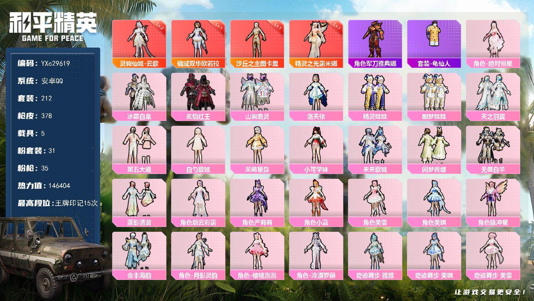 PX_2558638-??连体号!2级云歌,精灵,欧若拉,图卡盟,3级AUG星梦,10把计数枪,满地铁天赋】【连体王者-V11-至尊星耀IV段位-129英雄-486皮肤-3典藏皮肤-1珍品无双-4无双-4珍品传说-54传说-159史诗】YXc29619-【可二次】【因赛季更新游戏段付以上号为准!】. ,安卓Q-4红装5载具31粉装35特效枪10热门212套装378枪皮,15印记,历史卓越王牌19星, 【4红装】,灵驹仙姬-云歌,(2级),精灵之光-露米娜,(1级),镜域双华-欧若拉,(1级),沙丘之主-图卡盟,(1级), 【5载具】,路特斯EL蓝色,九霄玄鹿,合金龙骨蓝色,永恒黄蜂,星梦玉骢, 【31粉装】,严莉莉,小蓝,美琪,美雪,奇迹舞步美雪,奇迹舞步美琪,奇迹舞步雅雅,脉冲星,洛天依,金丰海韵,异瞳寒姬,月影灵韵,烟云彩露,樱桃泡泡,未来歌姬,冷漠罗丽,羊梦糖心,无畏白羊,白勺歌姬,呆萌星弥,小可学妹,绝对恒星,闲梦青缨,酣梦娃娃,精灵娃娃,莲影清波,第五大道,冰霜白皇,炙焰红王,山涧鹿灵,天之羽翼, 【35特效枪】,SCAR-L-锦绣绵绵,(5级),SCAR-L-灵驹仙姬,(3级),M416-天马神君,(3级),P90-金丰海韵,(4级),AKM-幽焰骑士,(3级),AKS-74U-森灵之息,(5级),AKM-绿萝繁花,(5级),UMP45-宇宙意志,(3级),Kar98K-圣域龙灵,(3级),Kar98K-巳巳如意,(5级),MG-36-沧焰双生,(5级),DP-28-豹影疾电,(5级),SVD-月影灵韵,(4级),AUG-星梦奇缘,(3级),M200-伏羲圣卦,(4级),M200-梦海之灵,(3级),Mk14-闲梦青缨,(4级),AMR-鸢尾晶梦,(5级),M24-镜域双华,(3级),GROZA-精灵之光,(3级),SCAR-L-童趣迷兔,(5级),UZI-绮梦青鸾,(4级),UMP45-相思残雪,(4级),M416-暖熊萌萌,(5级),M417-第五大道,(4级),DP-28-暗夜鎏金,(5级),M24-莲影清波,(4级),M249-绝对恒星,(4级),MG3-洛神天依,(5级),Mk14-福马献瑞,(5级),AA12-G-萌骑幻想,(5级),平底锅-喜羊羊与灰太狼,(3级),燃烧瓶-天降桃花,(5级),GROZA-焦糖拿铁,(5级),破片手榴弹-粉粉猫爪,(7级), 【10热门】,龟仙人,爱崽白熊,罗小黑,团圆交子,瑞龙福将,粉甜马卡龙,风华少年志,白月香洋装,军刀雅典娜,M762-瑞龙福将, 【6飞行器】,童趣迷兔飞行器,幻海精灵飞行器,电糖天使飞行器,黄族统领飞行器,千面幻镜飞行器,太空嘟嘟飞行器, 【3头盔】,童趣迷兔头盔,金风玉露头盔,马卡龙头盔, 【2背包】,梦幻火箭背包,深海曼妙背包,