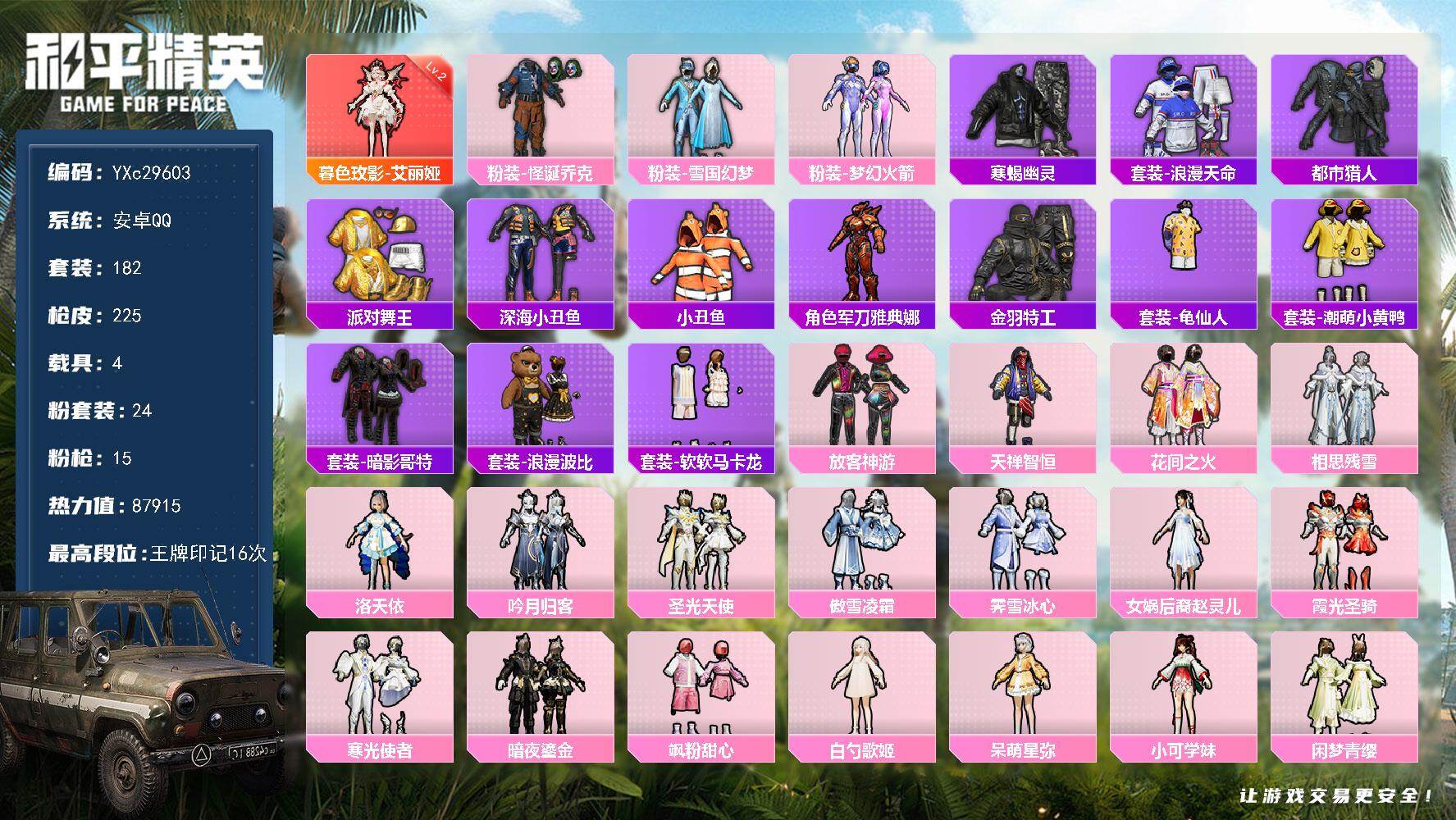 PX_2558651-??号!2级艾丽娅,寒蝎,都市,金鞋,保时捷,新101,雪国,赵灵儿,怪诞,放客,3级AUG星梦,马卡龙,粉熊包】YXc29603-【可二次】【因赛季更新游戏段付以上号为准!】 ,安卓Q-1红装6稀有4载具24粉装15特效枪19热门182套装225枪皮,,16印记,历史超级王牌12星, 【1红装】,暮色玫影-艾丽娅,(2级), 【6稀有】,寒蝎幽灵,AKM-缤纷海域,都市猎人,浪漫天命,派对舞王,派对舞王(金靴子), 【4载具】,保时捷918Spyder(液态银),玛莎拉蒂Q蓝色,兰博轿车灰色,双人摩托梦幻火箭, 【24粉装】,梦幻火箭,雪国幻梦,赵灵儿,洛天依,烟云彩露,星穹咏叹调,怪诞乔克,飒粉甜心,白勺歌姬,呆萌星弥,小可学妹,镜光幻境,闲梦青缨,放客神游,天禅智恒,花间之火,暗夜鎏金,霁雪冰心,傲雪凌霜,霞光圣骑,圣光天使,相思残雪,吟月归客,寒光使者, 【15特效枪】,M416-五爪金龙,(5级),SCAR-L-纯梦嫁纱,(5级),AKM-白勺歌姬,(1级),AKS-74U-森灵之息,(5级),Kar98K-巳巳如意,(5级),MG3-辉羽雀灵,(1级),Vector-飒粉甜心,(5级),DP-28-豹影疾电,(5级),AUG-星梦奇缘,(3级),AWM-花间之火,(7级),Mk14-盛世惊鸿,(3级),AKM-梦之光华,(6级),MG3-洛神天依,(5级),Mk14-福马献瑞,(1级),GROZA-焦糖拿铁,(6级), 【19热门】,小丑鱼,龟仙人,潮萌小黄鸭,软软马卡龙,晶辉守护,呆萌铁蟹,鹰眼刺客,兔兔白日梦,迅捷狂鲨,深海小丑鱼,浪漫波比,金羽特工,暗夜契约,暗影哥特,豚鼠丹丹,狂沙舞者,漫步者,军刀雅典娜,弄潮海豚, 【3飞行器】,心之恋语飞行翼,梦幻火箭飞行器,镜光幻境飞行翼, 【5头盔】,梦幻火箭头盔,雪国精灵头盔,深海小丑鱼头盔,甜蜜誓约头盔,花间之火头盔, 【6背包】,梦幻火箭背包,雪国精灵背包,百万伏特背包,萌熊伴侣背包,深海小丑鱼背包,花间之火背包