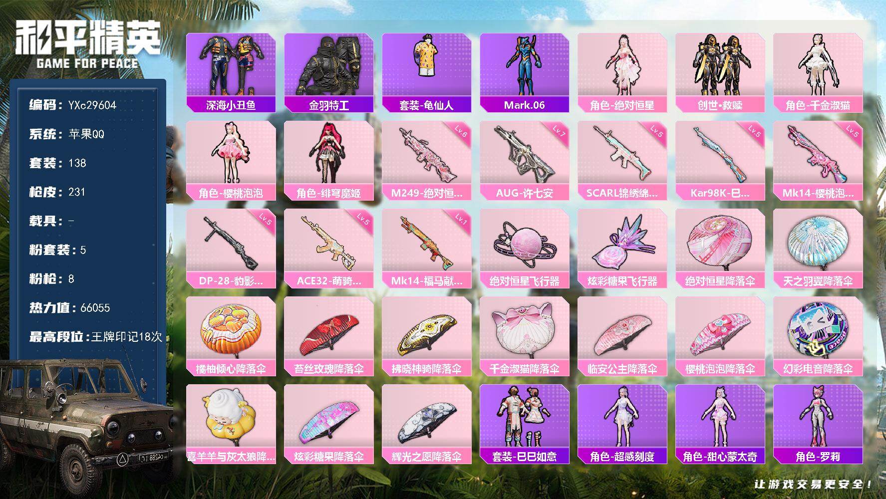 PX_2558667-??螂,双马尾,满地铁天赋】YXc29604-【无二次协助处理】【因赛季更新游戏段付以上号为准!】 ,苹果Q-5粉装8特效枪8热门138套装231枪皮,,18印记,历史传奇王牌19星, 【5粉装】,绯穹魔姬,千金淑猫,樱桃泡泡,创世救赎,绝对恒星, 【8特效枪】,SCAR-L-锦绣绵绵,(5级),Kar98K-巳巳如意,(5级),DP-28-豹影疾电,(5级),AUG-许七安,(7级),Mk14-樱桃泡泡,(5级),M249-绝对恒星,(6级),Mk14-福马献瑞,(1级),ACE32-萌骑漫游,(5级), 【8热门】,Mark.06,龟仙人,呆萌铁蟹,鹰眼刺客,迅捷狂鲨,深海小丑鱼,金羽特工,漫步者, 【1头盔】,深海小丑鱼头盔,