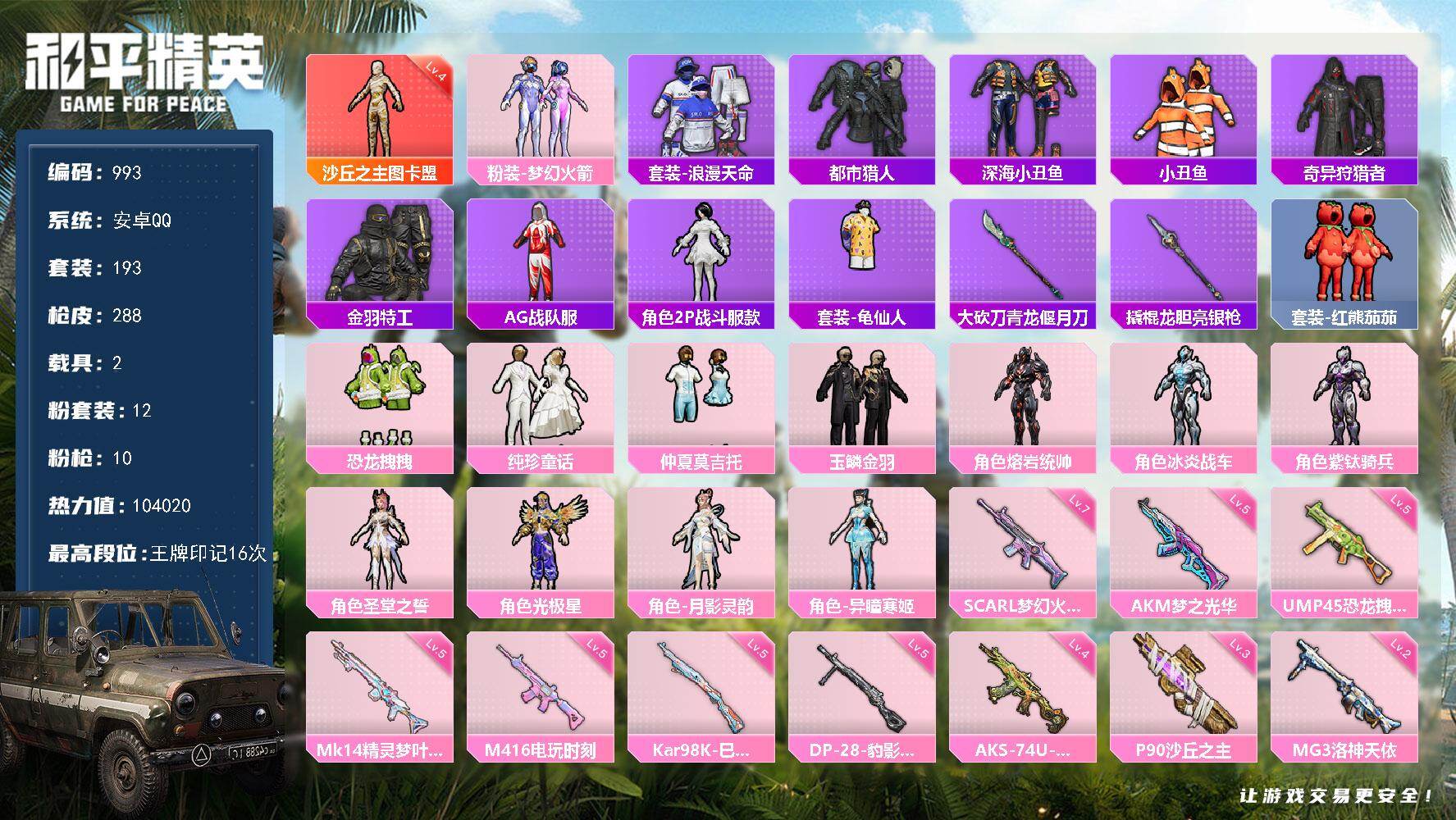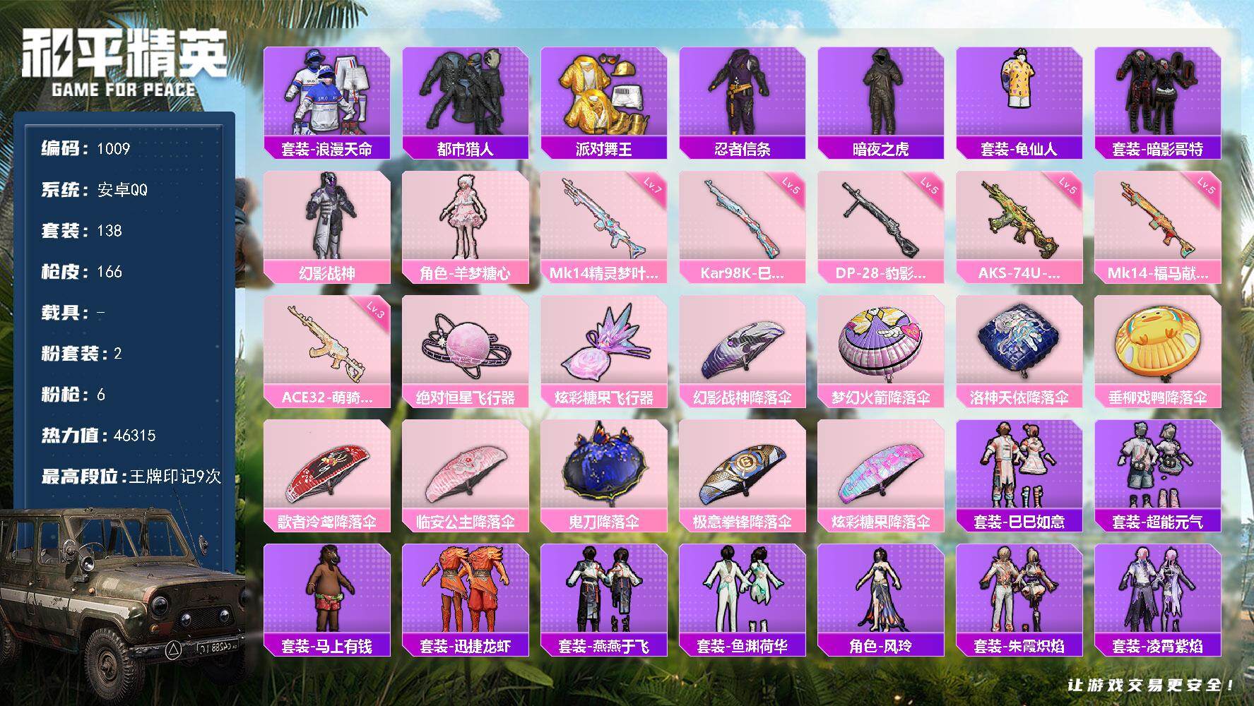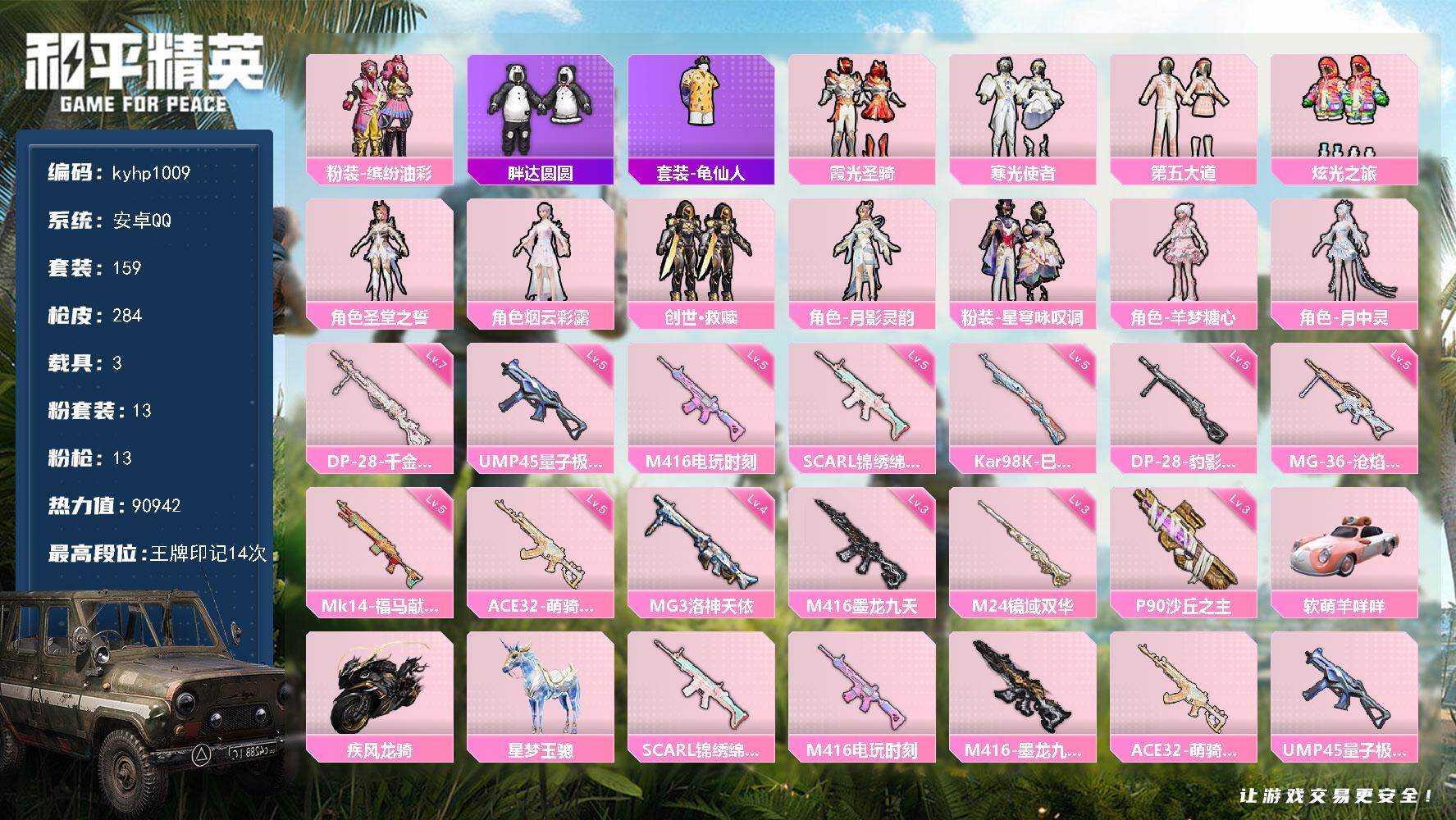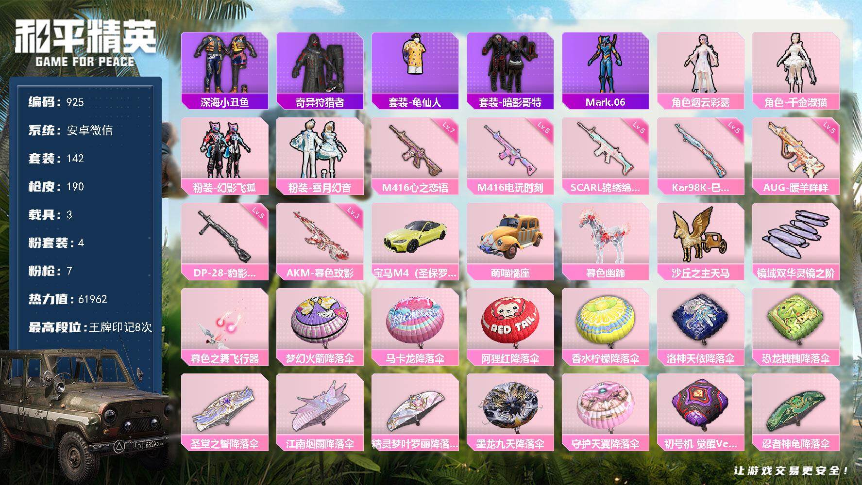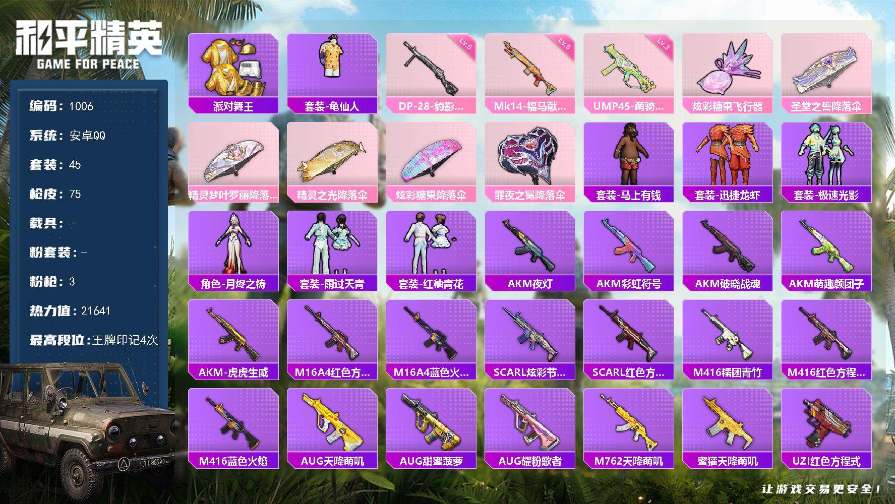 PX_2549065-派对舞王-瑰石海星-月烬之祈-明鸳圣池-龟仙人-萌趣颜团子-萌鸡速鸡安卓,手Q-0粉装-3特效枪-0载具-1粉色飞行器-21641热力值-4王牌印记-45套装-75枪皮 【热门品类】:套装-派对舞王,套装-龟仙人 【粉色枪皮等级】:UMP45-萌骑冒险(三级),Mk14-福马献瑞(五级),DP-28-豹影疾电(五级) 【粉色枪皮】:UMP45-萌骑冒险,Mk14-福马献瑞,DP-28-豹影疾电 【粉色飞行器】:炫彩糖果飞行器 【粉色降落伞】:圣堂之誓降落伞,精灵梦叶罗丽降落伞,精灵之光降落伞,炫彩糖果降落伞,罪夜之冕降落伞 【稀有套装】:套装-龟仙人,套装-炫彩糖果,套装-马上有钱,套装-迅捷龙虾,套装-极速光影,角色-月烬之祷,套装-雨过天青,套装-红釉青花 【稀有枪皮】:AKM-夜灯,AKM-彩虹符号,AKM-破晓战魂,AKM-萌趣颜团子,AKM-虎虎生威,M16A4-红色方程式,M16A4-蓝色火焰,SCAR-L-炫彩节奏,SCAR-L-红色方程式,M416-糯团青竹,M416-红色方程式,M416-蓝色火焰,AUG-天降萌叽,AUG-甜蜜菠萝,AUG-耀粉歌者,M762-天降萌叽,蜜獾-天降萌叽,UZI-红色方程式,UMP45-生命誓言,UMP45-蓝色火焰,Vector-生命誓言,汤姆逊-耀粉歌者,汤姆逊-像素花束,MP5K-飒粉甜心,Kar98K-彩虹符号,Kar98K-红色方程式,M24-奇异狩猎者,Mini14-耀粉歌者,S686-生命誓言,DP-28-彩虹符号 【其他套装】:套装-SS13特训,套装-SS14特训,套装-SS16特训,套装-SS17特训,套装-SS22特训,套装-SS24特训,套装-幻影武者,套装-战地督导,套装-灼焰舞者,套装-特殊使命,套装-白色伏地魔,套装-福星高照,套装-竞技名士,套装-萌趣颜团子,套装-蓝色守护者,套装-街头潮人,套装-酷潮明星,套装-长空猛禽,套装-阳光火鸡,套装-骑行爱好者,套装-鹤鸣,套装-黄色伏地魔,套装-龟仙人,套装-贵族骑装,套装-明鸳圣池 【稀有头盔】:深海小丑鱼头盔(2级) 【营地ID】:965904371