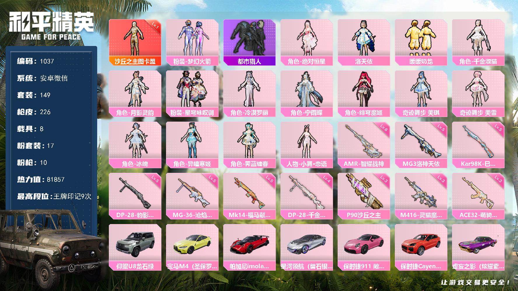 PX_2549073-盟(一级),地铁满天赋,梦幻火箭,都市猎人,安卓,微信-1神装-17粉装-10特效枪-8载具-14粉色飞行器-81857热力值-9王牌印记-149套装-226枪皮 【红色神装等级】:沙丘之主-图卡盟(一级) 【红色角色神装】:沙丘之主-图卡盟 【热门品类】:粉装-梦幻火箭,套装-都市猎人 【粉色套装】:角色-绝对恒星,粉装-梦幻火箭,角色-洛天依,粉装-暖暖奶龙,角色-千金淑猫,角色-月影灵韵,粉装-星穹咏叹调,角色-冷漠罗丽,角色-宁雨蝶,角色-绯穹魔姬,角色-奇迹舞步,美琪,角色-奇迹舞步,美雪,角色-冰魄,角色-异瞳寒姬,角色-霁蓝缠春,人物-小舞·恋语 【粉色枪皮等级】:M416-灵猫魔法师(三级),ACE32-萌骑漫游(三级),P90-沙丘之主(三级),Kar98K-巳巳如意(五级),Mk14-福马献瑞(五级),AMR-智耀战神(六级),DP-28-千金淑猫(四级),DP-28-豹影疾电(五级),MG3-洛神天依(五级),MG-36-沧焰双生(五级) 【粉色载具】:仰望U8(龙石绿),宝马M4(圣保罗黄),帕加尼imola(光影红),星河领航(磐石银),保时捷911,敞篷版(星珀红),保时捷Cayenne(激情红),虚妄之影(炫耀紫),黑曜夜骑 【粉色枪皮】:M416-灵猫魔法师,ACE32-萌骑漫游,P90-沙丘之主,Kar98K-巳巳如意,Mk14-福马献瑞,AMR-智耀战神,DP-28-千金淑猫,DP-28-豹影疾电,MG3-洛神天依,MG-36-沧焰双生 【粉色飞行器】:酣梦熊熊飞行器,绝对恒星飞行器,香车宝马飞行器,炫彩糖果飞行器,梦幻火箭飞行器,萌物绒绒飞行器,沙丘之主天马,动力核心飞行器,圣域金龙飞行器,宁雨蝶飞行器,灵猫魔法师飞行器,灵珠游龙飞行器,暮色之舞飞行器,云梦轻舟飞行器 【粉色降落伞】:绝对恒星降落伞,梦幻火箭降落伞,洛神天依降落伞,歌者泠鸢降落伞,莲影清波降落伞,沙丘之主降落伞,绝色倾城降落伞,忍者神龟降落伞,千金淑猫降落伞,月影灵韵降落伞,动力核心降落伞,彩虹独角兽降落伞,樱桃泡泡降落伞,圣域龙灵降落伞,智耀战神降落伞,星穹咏叹调降落伞,幻彩电音降落伞,时光之吻降落伞,时光之誓降落伞,双重狂想降落伞,冷漠罗丽降落伞,绯月迷踪降落伞,荧海星豚降落伞,灵猫魔法师降落伞,绯穹魔姬降落伞,奇迹舞步降落伞,喜羊羊与灰太狼降落伞,魔