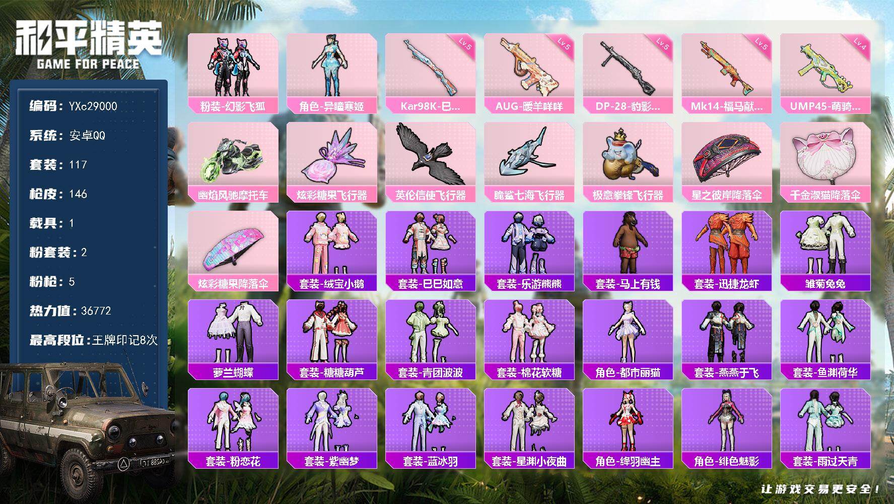 PX_2555378-赋1粉装-4特效枪第五大道】安卓手Q-1粉装-4特效枪-60套装-95枪皮-4王牌印记-荣耀皇冠Ⅲ-22013热力值【1粉装】第五大道【4特效枪】ACE32-萌骑漫游[4级],Mk14-福马献瑞[5级],UMP45-萌骑冒险[3级],DP-28-豹影疾电[5级]【7飞行器】异域银装飞行器,马上有福飞行器,狂鲨锋刃飞行器,炫彩糖果飞行器,破刃行动尾迹,荒原烈焰飞行器,鸡
