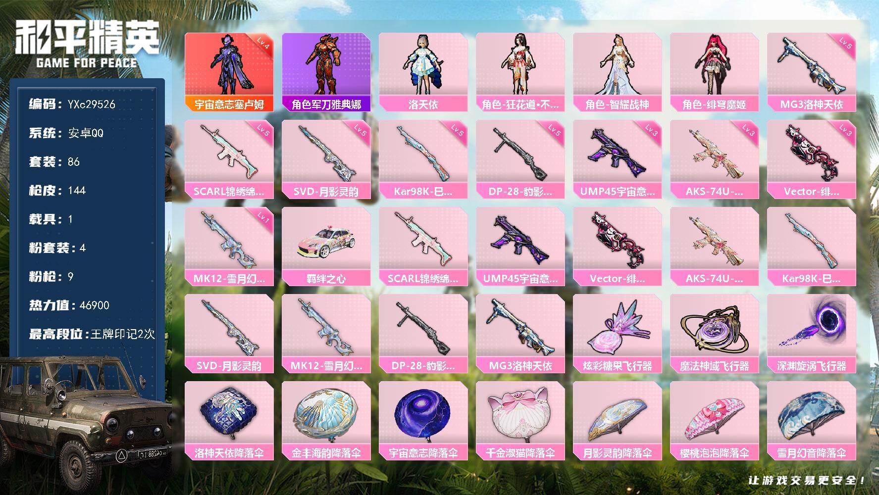 PX_2555424-宇宙意志,智耀战神,满地铁天赋】YXc29526-【无二次协助处理】【因赛季更新游戏段付以上号为准!】 ,安卓Q-1红装1载具4粉装9特效枪2热门86套装144枪皮,,2印记,历史绝世王牌13星, 【1红装】,宇宙意志-塞卢姆,(4级), 【1载具】,羁绊之心, 【4粉装】,狂花道·不知火舞,绯穹魔姬,洛天依,智耀战神, 【9特效枪】,SCAR-L-锦绣绵绵,(5级),AKS-74U-星穹咏叹调,(3级),UMP45-宇宙意志,(3级),Kar98K-巳巳如意,(5级),Vector-绯穹魔姬,(3级),DP-28-豹影疾电,(5级),SVD-月影灵韵,(5级),MK12-雪月幻音,(1级),MG3-洛神天依,(5级), 【2热门】,破蛋小黄鸡,军刀雅典娜, 【1飞行器】,深渊漩涡飞行器,