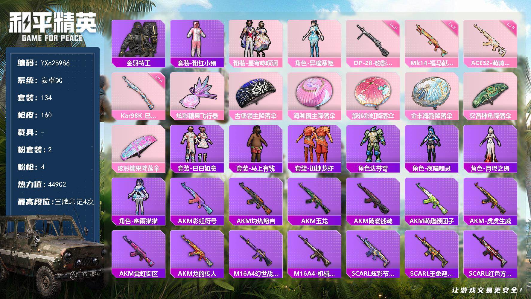 PX_2555251-可二次实名【4特效枪2粉装,秒换绑不用等】,安卓Q区-22759热力值-59套装-85枪皮,【2粉装】,莲影清波,角色-烟云彩露【4特效枪】,ACE32-萌骑漫游(3级),SCAR-L-锦绣绵绵(5级),AKM-绿萝繁花(5级),Kar98K-巳巳如意(2级)【58热门】,极速红龙,白色伏地魔,SS26特训,SS25特训,SS24特训,SS22特训,M762-天降萌叽,M762-彩虹符号,SKS-糯团青竹,Mini14-旋转彩虹,DBS-彩虹符号,M249-彩虹符号,MG3-幻世战舞者,AKM-星之彼岸,M416-蓝色火焰,长空猛禽,青涩时光,霓虹街区,懵萌河马,蓝色运动,红色运动,黑色伏地魔,AWM-天降萌叽,SS14特训,SS30特训,俏兔智灵,SS31特训,SS33特训,SS32特训,巳巳如意,MG3-火熔核心,老实芭蕉,战术大师,短管霰弹-星穹咏叹调,狙击之神,M416-糯团青竹,破片手榴弹-海盐豹豹,UMP45-海盐豹豹,Kar98K-彩虹符号,MG3-乌木金纹,破片手榴弹-巳巳如意,平底锅-青春冒险家,蝎式手枪-闲梦青缨,SS35特训,星途旅人,街头风暴,破片手榴弹-拽到爆炸,Famas-霓彩脉冲,沙漠之鹰-快闪甜心,平底锅-空岛之星,平底锅-快闪甜心,S686-巳巳如意,平底锅-惊鸿侠骨,平底锅-懵萌河马,SS37特训,破片手榴弹-呆爆全场,白糯汤圆,汤姆逊-像素花束【1飞行器】,UMP45-涂山之恋【10背包】,惊鸿侠骨背包(3级),快闪甜心背包(3级),炫光之旅背包(3级),黄族统领背包(3级),萌趣颜团子背包(3级),狂鲨锋刃背包(3级),龟仙人龟壳背包(3级),懵萌河马背包(3级),龙的传人背包(3级),未来歌姬背包(3级),营地ID:936519323,