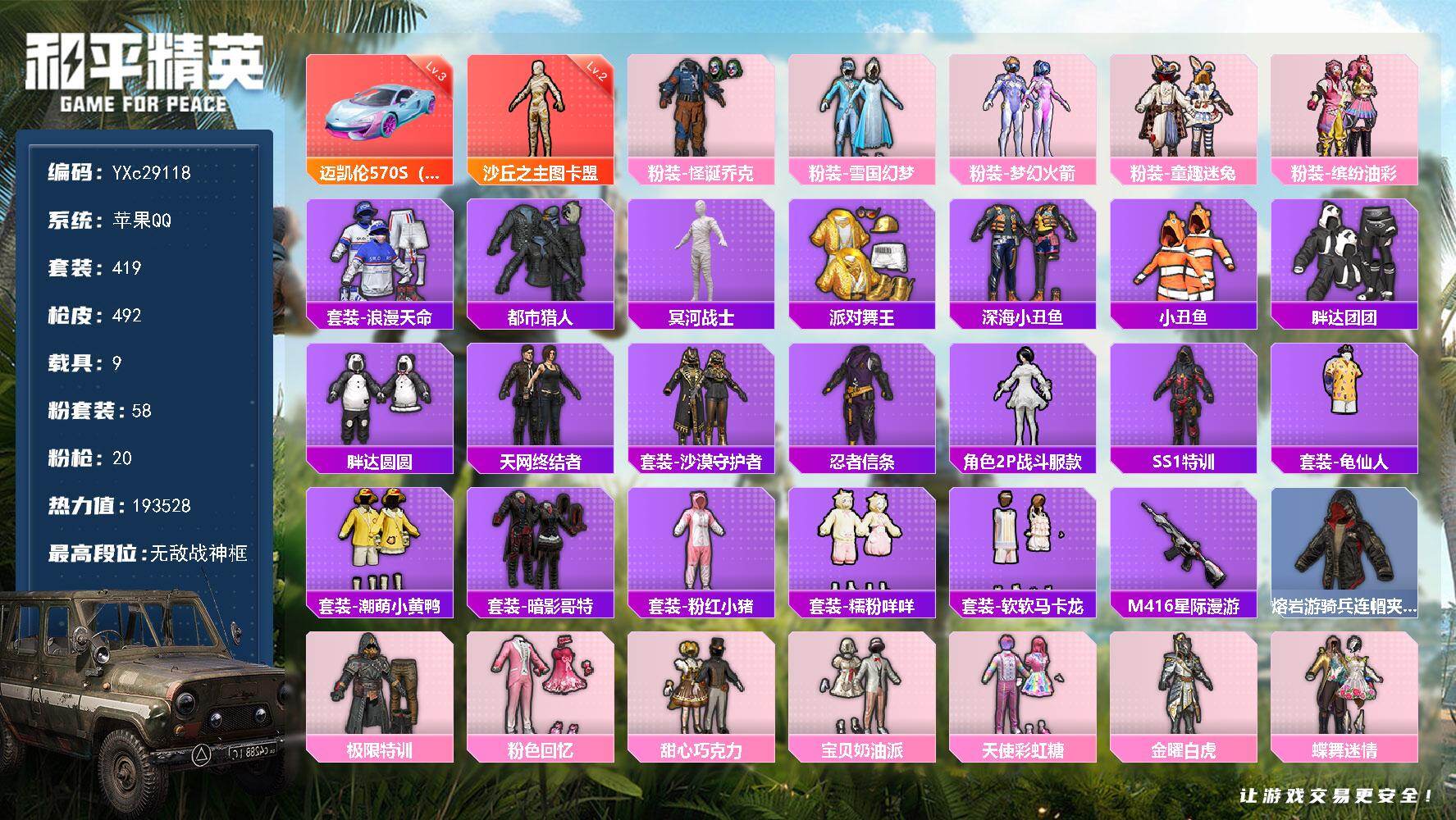 PX_2555206-??连体号!男神公主混搭素材号,战神框,图卡盟,木乃伊,都市,金鞋,天网,雪国,巧克力三姐妹,小丑,发光眼罩,猪妹,特训,童趣,小狐,馨动,星星裤,马卡龙,糯粉,黑丝,胖达,童趣头,粉熊包,星梦奇缘AUG】【连体王者v10-439皮-12水-4无双-36传】YXc29118-【可二次】【因赛季更新游戏段付以上号为准!】 ,苹果Q-1红装9稀有10载具57粉装19特效枪55热门419套装492枪皮,,21印记,历史无敌战神, 【1红装】,沙丘之主-图卡盟,(2级), 【9稀有】,木乃伊,M416-星际漫游,AKM-缤纷海域,SCAR-L-粉色回忆,都市猎人,浪漫天命,派对舞王,天网终结者,派对舞王(金靴子), 【10载具】,宾利欧陆GT火焰橘,迈凯伦570S炫冰蓝,(3级),星河领航(磐石银),玛莎拉蒂粉色,兰博SVJ绿色,合金龙骨蓝色,擎天重拳,海龙奔腾,星梦玉骢,空客蔚蓝之翼僚机, 【58粉装】,梦幻火箭,蝶舞迷情,雪国幻梦,奇迹舞步美雪,奇迹舞步美琪,引力星,白兰星,蜜语绒猫,宝贝奶油派,天使彩虹糖,甜心巧克力,雪月幻音,荧海星豚,樱桃泡泡,瑰丽时代,璀璨巨星,金曜白虎,怪诞乔克,星梦奇缘,飒粉甜心,白勺歌姬,呆萌星弥,小可学妹,静灵氛围,垂柳戏鸭,缤纷油彩,放客神游,萌物绒绒,仲夏莫吉托,筑梦精灵,粉色回忆,极限特训,第五大道,冰川幽秘,甜蜜草莓,草莓生巧,童趣迷兔,冰霜白皇,绒雪飘舞,炙焰红王,暖熊萌萌,甜梦小狐,馨动时刻,彩虹甜喵,冰川粉黛,冰川红玫,紫电风暴,蜜桃特工,暗夜玫瑰,山涧鹿灵,彩虹鹿灵,俏雪含霜,吟月归客,寒光使者,红伞翩翩,黄伞悠悠,黑伞漫漫,幻骨萌王 【20特效枪】,SCAR-L-梦幻火箭,(7级),M416-五爪金龙,(1级),M416-心之恋语,(7级),P90-金丰海韵,(3级),AKM-炫紫旋律,(5级),UMP45-雪国精灵,(7级),UMP45-宇宙意志,(3级),Kar98K-巳巳如意,(5级),MG3-酷泡奶龙,(5级),Vector-最终圣卫者,(3级),Vector-飒粉甜心,(5级),DP-28-豹影疾电,(4级),AUG-星梦奇缘,(3级),M24-莲影清波,(3级),M16A4-垂柳戏鸭,(5级),M416-风花雪月,(5级),Mk14-福马献瑞,(3级),燃烧瓶-薄荷可可,(6级),烟雾弹-甜梦果泡,(5级),碎片手榴弹-贪吃小熊(5级) 【55热门】,小丑鱼,奇迹天团,龟仙人,星光纪元,2P战斗服款,浪漫假日,太空漫步,雪山精英,东方飞龙,潮萌小黄鸭,恶魔人蛛,软软马卡龙,晶辉守护,糯粉咩咩,爱崽白熊,梦魇先生,呆萌铁蟹,万圣娃娃,鹰眼刺客,奶芙汪汪,恶魔喵喵,奇迹天团,激萌罗小黑,暴走罗小黑,沙漠守护者,迅捷狂鲨,深海小丑鱼,童话森林,折纸暴龙,胖达圆圆,胖达团团,TT追光队服,暗夜契约,怪笑疯兔,暗影哥特,SS1特训,团圆交子,瑞龙福将,纯白誓言,粉红小猪,忍者信条,西部牛仔,狂沙舞者,漫步者,薄荷蓝莓,白虎圣者,蓝甜马卡龙,娴静芝兰,破蛋小黄鸡,风华少年志,白月香洋装,弄潮海豚,M416-快乐主宰,M762-瑞龙福将,汤姆逊-林间仙鹿, 【4飞行器】,梦幻火箭飞行器,童趣迷兔飞行器,深渊漩涡飞行器,萌物绒绒飞行器, 【11头盔】,童趣迷兔头盔,银河战甲头盔,精灵迷巫头盔,梦幻火箭头盔,雪国精灵头盔,折纸暴龙头盔,甜心宝贝头盔,百万伏特头盔,深海小丑鱼头盔,马卡龙头盔,夏日绵绵冰头盔, 【13背包】,梦幻火箭背包,雪国精灵背包,火曜朱雀背包,甜心宝贝背包,百万伏特背包,幻影战神背包,缤纷油彩背包,萌熊伴侣背包,深海小丑鱼背包,深海曼妙背包,甜蜜誓约背包,心之恋语背包,马卡龙背包,