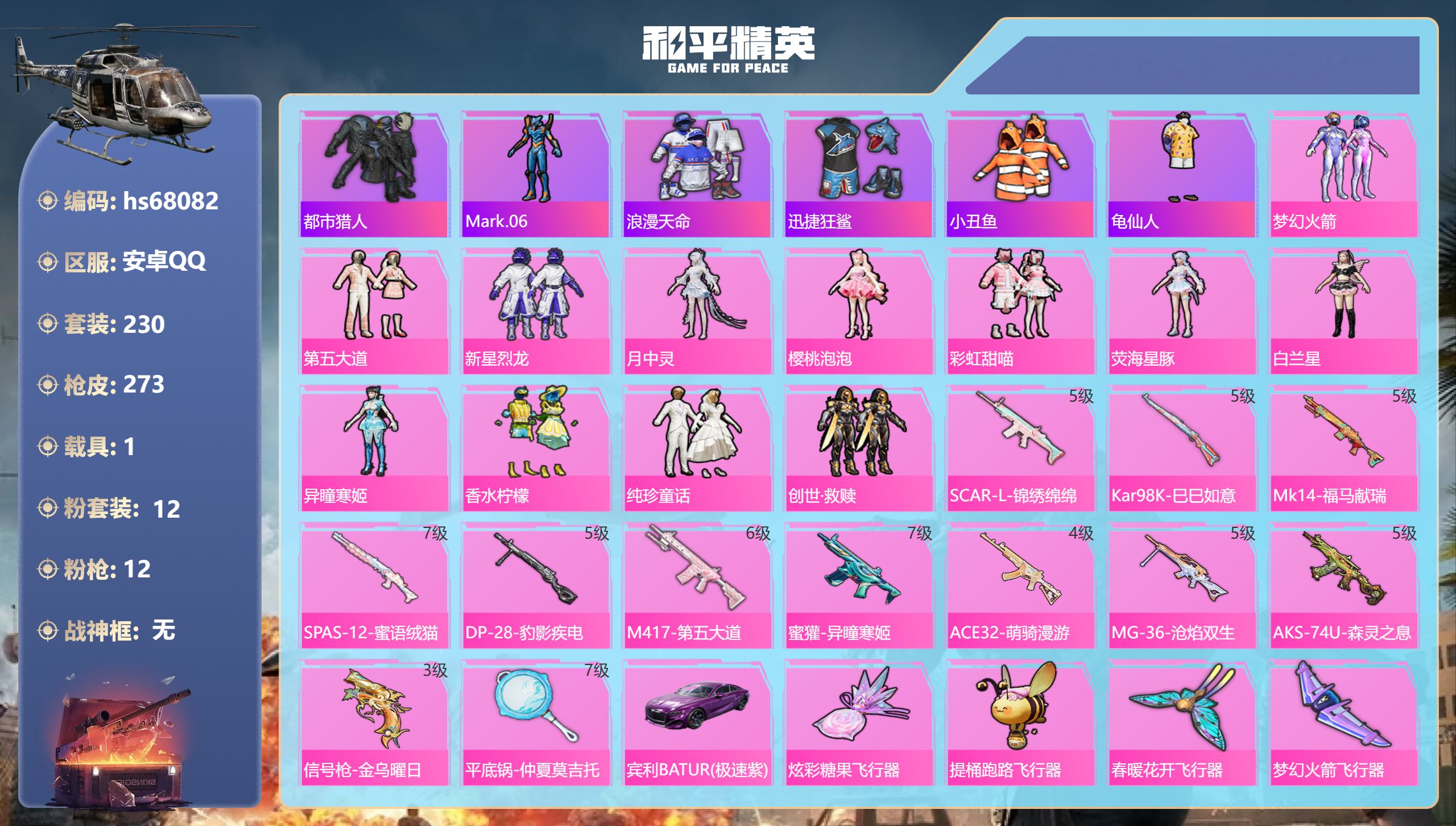 PX_2549225-,安卓手Q-19王牌印记-12粉装-12特效枪-1载具-90627热力值-230套装-273枪皮-8卓越印记-6传奇印记 【12粉装】角色-樱桃泡泡,角色-异瞳寒姬,角色-白兰星,套装-彩虹甜喵,角色-月中灵,套装-第五大道,套装-梦幻火箭,角色-荧海星豚,套装-创世·救赎,套装-香水柠檬,套装-纯珍童话,套装-新星烈龙 【12特效枪】平底锅-仲夏莫吉托/7级,信号枪-金乌曜日/3级,SPAS-12-蜜语绒猫/7级,M417-第五大道/6级,MG-36-沧焰双生/5级,ACE32-萌骑漫游/4级,蜜獾-异瞳寒姬/7级,SCAR-L-锦绣绵绵/5级,Mk14-福马献瑞/5级,Kar98K-巳巳如意/5级,DP-28-豹影疾电/5级,AKS-74U-森灵之息/5级 【6稀有紫装】都市猎人,Mark.06,浪漫天命,迅捷狂鲨,小丑鱼,龟仙人 【1稀有载具】宾利BATUR(极速紫) 【221稀有时装】梦幻火箭,第五大道,新星烈龙,月中灵,樱桃泡泡,彩虹甜喵,荧海星豚,白兰星,异瞳寒姬,香水柠檬,纯珍童话,创世·救赎,迅捷龙虾,SS38特训,都市猎人,浪漫天命,龟仙人,Mark.06,小丑鱼,迅捷狂鲨,兔兔白日梦,潮萌小黄鸭,Alan,Walker,申公豹,萌趣咩咩,龙魂突击队,暖阳柴柴,阿虎,铁血战翼,异域银装,纯白跃动,幸运青,霜刃之御,白糯汤圆,街头风暴,糖霜甜心,冰河战士,鱼渊荷华,绿头鱼,大橘大利,燕燕于飞,战术大师,紫俏灵猫,晶辉守护,香桃花海,旋风灵鼠,巳巳如意,曼妙人鱼,元素星魂,午间小调,摩卡猫猫,琴音绮想,霓虹热舞,雁字回时,画境星梦,朱霞炽焰,狂鲨锋刃,阳光菠萝,游乐,懒羊羊,凌霄紫焰,粉黛兰香,云魄琉璃,擎苍青焰,炫彩糖果,绯色魅影,萌鸡速递,荧光像素,元气之梦,书海巡游,风迹短诗,错位像素,超能元气,蜜露汐语,薄荷星砂,秘语星愿,顶瓜瓜,雪国风尚,恋语绒绒,青翼流星,马上来财,SS35特训,SS29特训,SS31特训,SS33特训,SS32特训,SS36特训,贝斯之夜,焰鹰斗篷,军械专家,粉彩缠枝,魂电,龙的传人,清香五月粽,潮流炫酷,SS8特训,甜梦熊熊,青玉碎影,SS37特训,SS28特训,汪仔布丁,特训学院,猎鹰,青年教官,橘黑制服,红色运动,小熊虫,黄色运动,蓝色运动,顽皮橙,黄色伏地魔,白色伏地魔,SS9特训,酒红色名流,阳光火鸡,湖蓝色名流,黄色名流,顽皮玉兔,暖暖麦兜,涂山之恋,SS26特训,漫步者,空岛之星,荧惑魅影,热情海星,黑色伏地魔,黎明保卫者,炫蓝之夏,元气发射,纯真浪花,SS34特训,竞技名士,深蓝色名流,猛禽,雨林探路者,长空猛禽,旭日情侣,街头潮人,冷焰舞者,惊鸿侠骨,魅力单车,灼焰舞者,云霞荷露,春光漫游,恶魔喵喵,猎梦纪元,甜心亚梦,虚音幻奏,极地朋克,幻世战舞者,战地督导,特殊使命,青涩时光,暖心熊熊,牛气满满,娇憨猪猪,风暴特警,春日漫步,冰川特警,极速红龙,狙击之神,红釉青花,麻辣教官,鹰眼刺客,雨过天青,福马献瑞,冰冻风暴,玲珑侠影,完美偶像,SS11特训,人气偶像,幻影武者,俏皮奶喵,破蛋小黄鸡,快闪甜心,酸甜橘柚,蓝彩潮人,千禧之恋,绮丽涂鸦,竞技达人朋克,海岛探路者,破晓战魂,霓虹街区,都市魅力,SS10特训,奈斯,耀粉歌者,探宝勇士,SS12特训,牛气冲天,清新柠檬,SS19特训,光之冒险,SS20特训,SS21特训,绝对偶像,玉兔迎春,SS22特训,SS23特训,呆萌铁蟹,甜蜜熊情侣,缤纷果语,滨海厨神,莱茵河畔,香榭午后,神气柴柴,灵蜜圈圈,妙红点点,幻彩翩翩,幻羽潜行,海盐绵绵冰,老实芭蕉,王牌教练,荣耀,柠萌假日,粉红小猪,SS24特训,鹤鸣,懵萌河马,SS25特训,锦衣飞扬 【269稀有枪械】SCAR-L-锦绣绵绵/5级,Kar98K-巳巳如意/5级,Mk14-福马献瑞/5级,SPAS-12-蜜语绒猫/7级,DP-28-豹影疾电/5级,M417-第五大道/6级,蜜獾-异瞳寒姬/7级,ACE32-萌骑漫游/4级,MG-36-沧焰双生/5级,AKS-74U-森灵之息/5级,信号枪-金乌曜日/3级,平底锅-仲夏莫吉托/7级,QBZ-纯真浪花,AWM-纯真浪花,汤姆逊-纯真浪花,DBS-乌木金纹,AA12-G-纯真浪花,平底锅-纯真浪花,Vector-创世·救赎,撬棍-朗基努斯之枪,DBS-绊爱,GROZA-海盐豹豹,Mk14-冰河战士,UZI-冰河战士,M16A4-冰河战士,MK20-H-乌木金纹,DBS-风迹短诗,莫辛纳甘-风迹短诗,M416-错位像素,Win94-乌木金纹,MK12-风迹短诗,野牛-魔童闹海,敖闰,MK12-乌木金纹,F57-魔童闹海,敖闰,AKS-74U-荧光像素,破片手榴弹-爆破雪人,MG3-霓彩脉冲,R45-幻彩电音,ACE32-画境星梦,M1加兰德-画境星梦,MP5K-画境星梦,蜜獾-乌木金纹,AWM-绿洲时空,汤姆逊-错位像素,SPAS-12-狂鲨锋刃,M417-玩趣呆呆,MK20-H-狂鲨锋刃,AUG-冰晶雪宝,突击盾牌-绝对恒星,铝热弹-炫彩糖果,UZI-炫彩糖果,UMP45-绿洲时空,ARX-像素花束,Mini14-绯穹魔姬,大砍刀-像素花束,AA12-G-画境星梦,平底锅-画境星梦,M249-冰晶雪宝,Kar98K-星穹咏叹调,Mk47-风迹短诗,JS9-凌霄紫焰,MG-36-凌霄紫焰,破片手榴弹-海盐豹豹,AC-VAL-霁蓝缠春,UMP45-海盐豹豹,ARX-凌霄紫焰,AKS-74U-乌木金纹,AKM-涂鸦街区,电击枪-喜羊羊与灰太狼,蜜獾-风迹短诗,爆炸猎弓-喜羊羊与灰太狼,P92-凌霄紫焰,Famas-乌木金纹,Famas-霓彩脉冲,M249-无面战甲,破片手榴弹-拽到爆炸,十字弩-异瞳寒姬,S1897-糯团青竹,信号枪-异瞳寒姬,平底锅-凌霄紫焰,烟雾弹-冰氧夏日,Mk14-紫晶流影,MG-36-薄荷星砂,SCAR-L-绿洲时空,PKM-荧光像素,PKM-啾咪啾咪,M24-天降萌叽,SVD-霓彩脉冲,SLR-霓彩脉冲,平底锅-属我最6,SCAR-L-彩虹符号,蜜獾-冰澜龙吟,S12K-霓彩脉冲,M416-魔童闹海,敖闰,AMR-鸡智如我,AKM-霓彩脉冲,M416-红色方程式,M416-蓝色火焰,M416-夜灯,M416-糯团青竹,M416-绿野极光,AKM-影袭,AKM-破晓战魂,AKM-龙的传人,AKM-灼热熔岩,AKM-霓虹街区,SCAR-L-红色方程式,SCAR-L-玉兔迎春,SCAR-L-暗夜玫瑰,SCAR-L-夜灯,M16A4-蓝色火焰,M16A4-幻世战舞者,M16A4-甜心亚梦,GROZA-乌木金纹,GROZA
