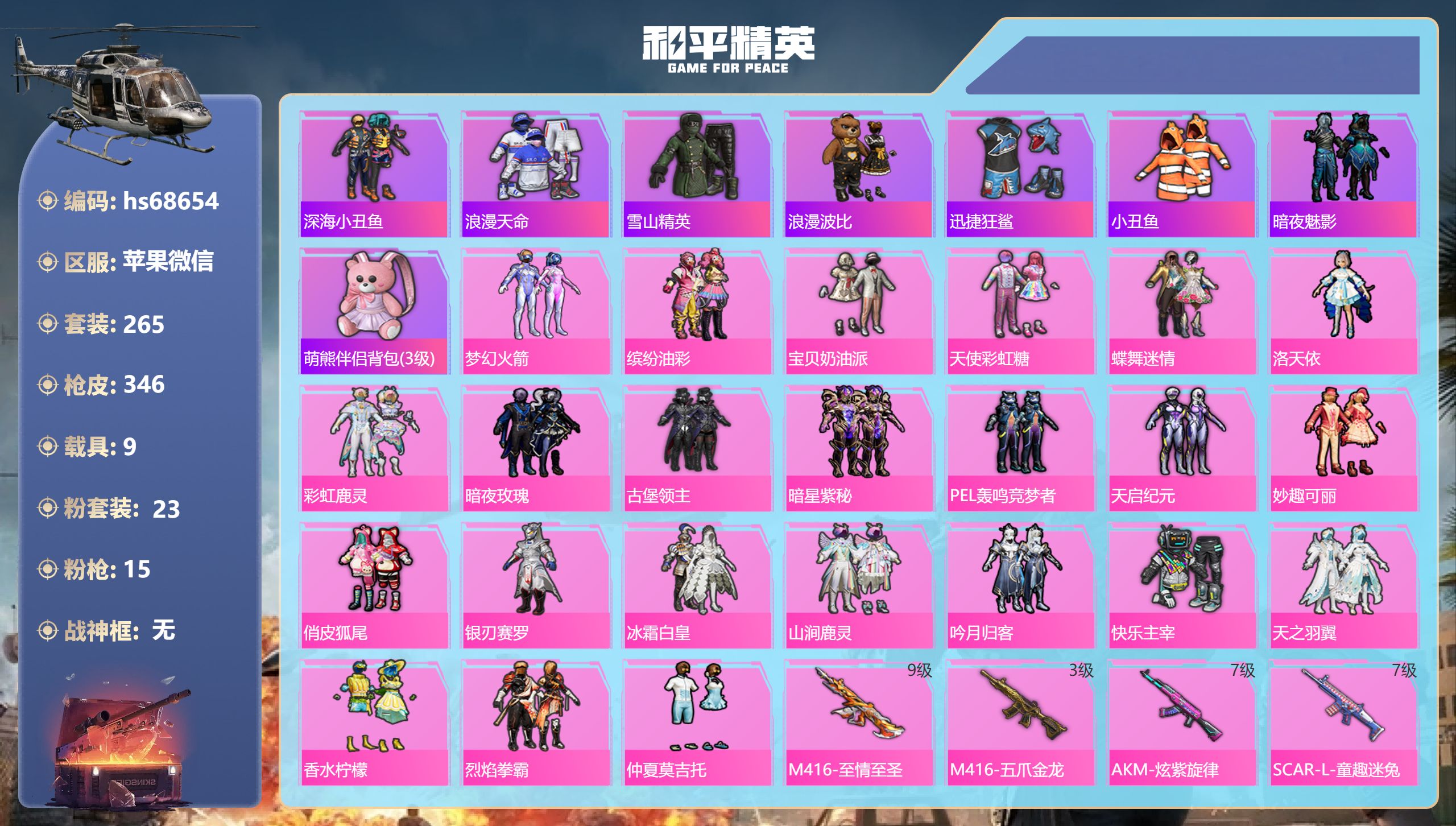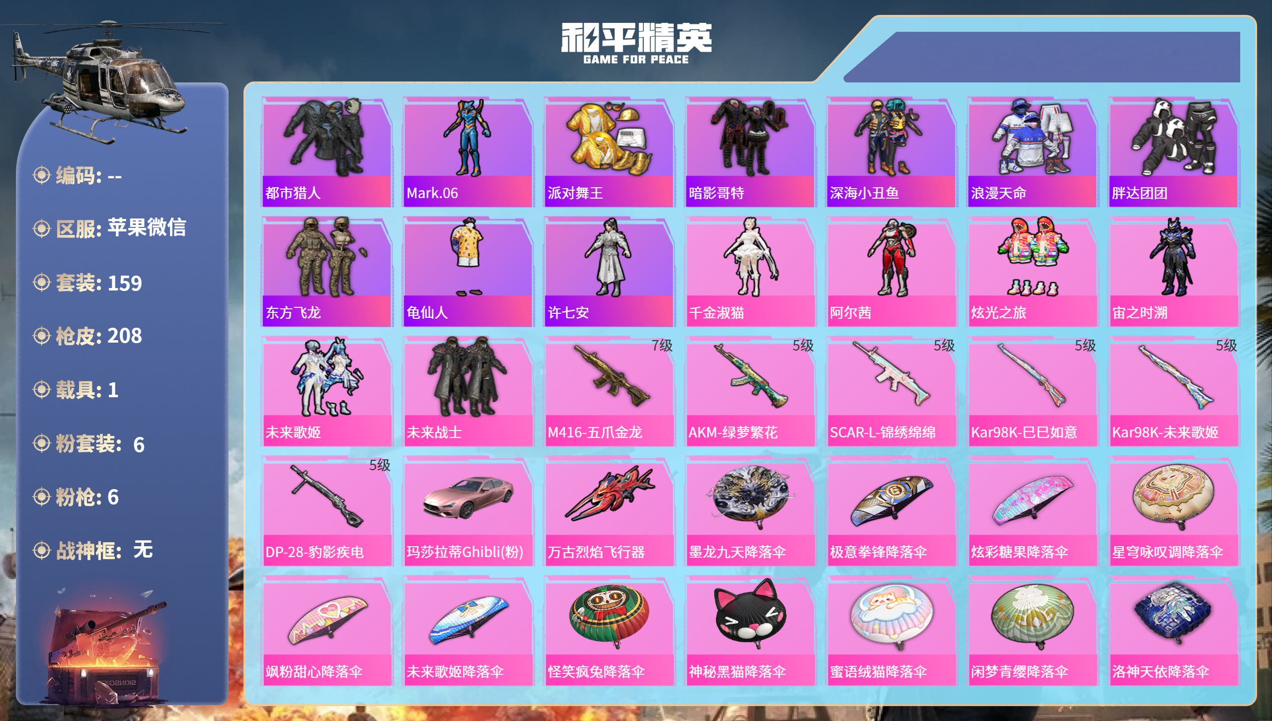 PX_2549239-苹果微信-16王牌印记-6粉装-6特效枪-1载具-66262热力值-159套装-208枪皮-2卓越印记-1传奇印记 【6粉装】角色-千金淑猫,套装-未来战士,角色-阿尔茜,套装-炫光之旅,套装-未来歌姬,角色-宙之时溯 【6特效枪】AKM-绿萝繁花/5级,SCAR-L-锦绣绵绵/5级,DP-28-豹影疾电/5级,Kar98K-巳巳如意/5级,M416-五爪金龙/7级,Kar98K-未来歌姬/5级 【11稀有紫装】巡查衣,都市猎人,Mark.06,派对舞王,暗影哥特,深海小丑鱼,浪漫天命,胖达团团,东方飞龙,龟仙人,许七安 【1稀有载具】玛莎拉蒂Ghibli(粉) 【160稀有时装】千金淑猫,阿尔茜,炫光之旅,创世·幻影,宙之时溯,未来歌姬,未来战士,绝对防御上衣,迅捷龙虾,SS38特训,都市猎人,胖达团团,浪漫天命,龟仙人,Mark.06,暗影哥特,深海小丑鱼,东方飞龙,派对舞王,狂沙舞者,龙魂突击队,小熊娃娃,异域银装,白糯汤圆,星渊小夜曲,街头风暴,星途旅人,冰河战士,鱼渊荷华,大橘大利,燕燕于飞,战术大师,智谋强哥,诡面顽熊,紫俏灵猫,许七安,雏菊兔兔,香桃花海,蝶变,巳巳如意,极地流光,元素星魂,琴音绮想,画境星梦,游乐,元气之梦,书海巡游,薄荷星砂,白光莹,顶瓜瓜,雪国风尚,恋语绒绒,青翼流星,SS35特训,SS29特训,萝兰蝴蝶,SS31特训,SS33特训,SS32特训,华灯初上,无暇誓言,SS36特训,贝斯之夜,焰鹰斗篷,源星混沌,都市漫游者,龙的传人,潮流炫酷,甜梦熊熊,白熊同盟,青玉碎影,SS37特训,SS28特训,猎鹰,黄色运动,浓情蜜辣,蓝色运动,雪晶战甲,黄色伏地魔,飞驰魅影,音速流光,热血青春,阳光火鸡,黄色名流,酷潮明星,绯格组合,涂山之恋,SS26特训,漫步者,空岛之星,黑色伏地魔,黎明保卫者,炫蓝之夏,元气发射,SS34特训,竞技名士,雨林探路者,SS30特训,长空猛禽,特战装甲,旭日情侣,甜蜜告白,街头潮人,冷焰舞者,惊鸿侠骨,魅力单车,春光漫游,极地朋克,贵族骑装,幻世战舞者,战地督导,特殊使命,红红火火,青春校园,燃烧卡路里,狙击之神,鹰眼刺客,冰冻风暴,幽夜迷踪,破蛋小黄鸡,摇滚战魂,快闪甜心,蓝彩潮人,绮丽涂鸦,耀眼新星,坚韧舞者,超能勇士,海岛探路者,破晓战魂,霓虹街区,沙漠兵团,SS27特训,SS18特训,竞技角斗士,异彩先驱,霓虹极客,空投萌叽,金戈铁马,SS19特训,光之冒险,SS20特训,SS21特训,绝对偶像,弄潮海豚,SS22特训,SS23特训,夏日倾情,缤纷果语,神气柴柴,幻羽潜行,海盐绵绵冰,老实芭蕉,王牌教练,柠萌假日,SS24特训,绚紫流光,懵萌河马,短笛,SS25特训,锦衣飞扬 【206稀有枪械】M416-五爪金龙/7级,AKM-绿萝繁花/5级,SCAR-L-锦绣绵绵/5级,Kar98K-巳巳如意/5级,Kar98K-未来歌姬/5级,DP-28-豹影疾电/5级,DBS-乌木金纹,AMR-墨龙九天,Vector-创世·救赎,SCAR-L-海盐豹豹,平底锅-精灵梦叶罗丽,GROZA-海盐豹豹,野牛-雏菊兔兔,Mk14-冰河战士,平底锅-雏菊兔兔,M762-雏菊兔兔,Mini14-雏菊兔兔,Famas-突变脉冲,R1895-雏菊兔兔,UZI-冰河战士,M16A4-冰河战士,MK20-H-乌木金纹,Win94-乌木金纹,MK12-乌木金纹,MG3-霓彩脉冲,DBS-幻彩电音,ACE32-画境星梦,M1加兰德-画境星梦,MP5K-画境星梦,蜜獾-乌木金纹,SPAS-12-狂鲨锋刃,M417-玩趣呆呆,UZI-炫彩糖果,ARX-像素花束,大砍刀-像素花束,AA12-G-画境星梦,G36C-星穹咏叹调,平底锅-画境星梦,M249-冰晶雪宝,破片手榴弹-海盐豹豹,UMP45-海盐豹豹,AKS-74U-乌木金纹,Famas-乌木金纹,S1897-糯团青竹,Mk14-薄荷星砂,AKS-74U-鸡智如我,烟雾弹-冰氧夏日,MG3-智耀战神,MG-36-薄荷星砂,PKM-啾咪啾咪,SLR-霓彩脉冲,平底锅-属我最6,AKM-霓彩脉冲,M416-红色方程式,M416-蓝色火焰,M416-糯团青竹,AKM-彩虹符号,AKM-破晓战魂,AKM-龙的传人,AKM-灼热熔岩,AKM-霓虹街区,SCAR-L-红色方程式,SCAR-L-玉兔迎春,SCAR-L-夜灯,SCAR-L-炫彩节奏,M16A4-红色方程式,M16A4-幻世战舞者,GROZA-绯红回忆,GROZA-异彩先驱,GROZA-蓝莓炮弹,GROZA-影袭,GROZA-懵萌河马,AUG-耀粉歌者,AUG-怪笑疯兔,AUG-甜蜜菠萝,AUG-天降萌叽,QBZ-飞驰魅影,QBZ-未来歌姬,QBZ-彩虹符号,M762-彩虹符号,M762-第五大道,M762-橘柚倾心,M762-天星战神,M762-天降萌叽,Mk47-乌木金纹,G36C-懵萌河马,G36C-炙焰牛王,AC-VAL-天降萌叽,AC-VAL-快闪甜心,AC-VAL-乌木金纹,蜜獾-天降萌叽,蜜獾-垂柳戏鸭,Kar98K-红色方程式,Kar98K-六号树人,Kar98K-飞驰魅影,Kar98K-彩虹符号,M24-乌木金纹,M24-影袭,AWM-天降萌叽,AWM-焰鹰斗篷,莫辛纳甘-乌木金纹,莫辛纳甘-懵萌河马,AMR-乌木金纹,M200-惊鸿侠骨,SKS-金玉无双,SKS-未来歌姬,SKS-炫彩节奏,VSS-彩虹符号,Mini14-涂山之恋,Mini14-异彩先驱,Mini14-穿刺龙虾,Mk14-乌木金纹,M417-惊鸿侠骨,MK20-H-快闪甜心,UZI-红色方程式,UZI-影袭,UZI-金风玉露,UZI-天降萌叽,UZI-啾咪啾咪,UMP45-涂山之恋,UMP45-蓝色火焰,UMP45-生命誓言,UMP45-夜灯,Vector-生命誓言,Vector-彩虹符号,Vector-焰鹰斗篷,汤姆逊-耀粉歌者,汤姆逊-天降萌叽,汤姆逊-异彩先驱,汤姆逊-炫彩节奏,野牛-乌木金纹,野牛-天星战神,MP5K-异彩先驱,MP5K-彩虹嘻嘻猴,MP5K-乌木金纹,P90-乌木金纹,P90-快闪甜心,P90-飞驰魅影,P90-玩趣呆呆,S686-彩虹符号,S686-红色方程式,S686-生命誓言,S1897-炫彩节奏,S1897-飞驰魅影,S12K-破晓战魂,S12K-玩趣呆呆,S12K-夜灯,DBS-焰鹰斗篷,DBS-彩虹符号,AA12-G-萌物绒绒,M249-破晓战魂,M249-彩虹符号,M249-糯团青竹,DP-28-未来战士,DP-28-焰鹰斗篷,DP-28-橘柚倾心,DP-28-彩虹符号,DP-28-甜蜜旋律,MG3-惊鸿侠骨,MG3-第五大道,MG3-幻世战舞者,PKM-懵萌河马,沙漠之鹰-快闪甜心,TMP-9-江南烟雨,TMP-9-未来歌姬,平底锅-惊鸿侠骨,平底锅-空岛之星,平底锅-空投萌叽,平底锅-飞驰魅影,平底锅-懵萌河马,平底锅-快闪甜心,平底锅-异