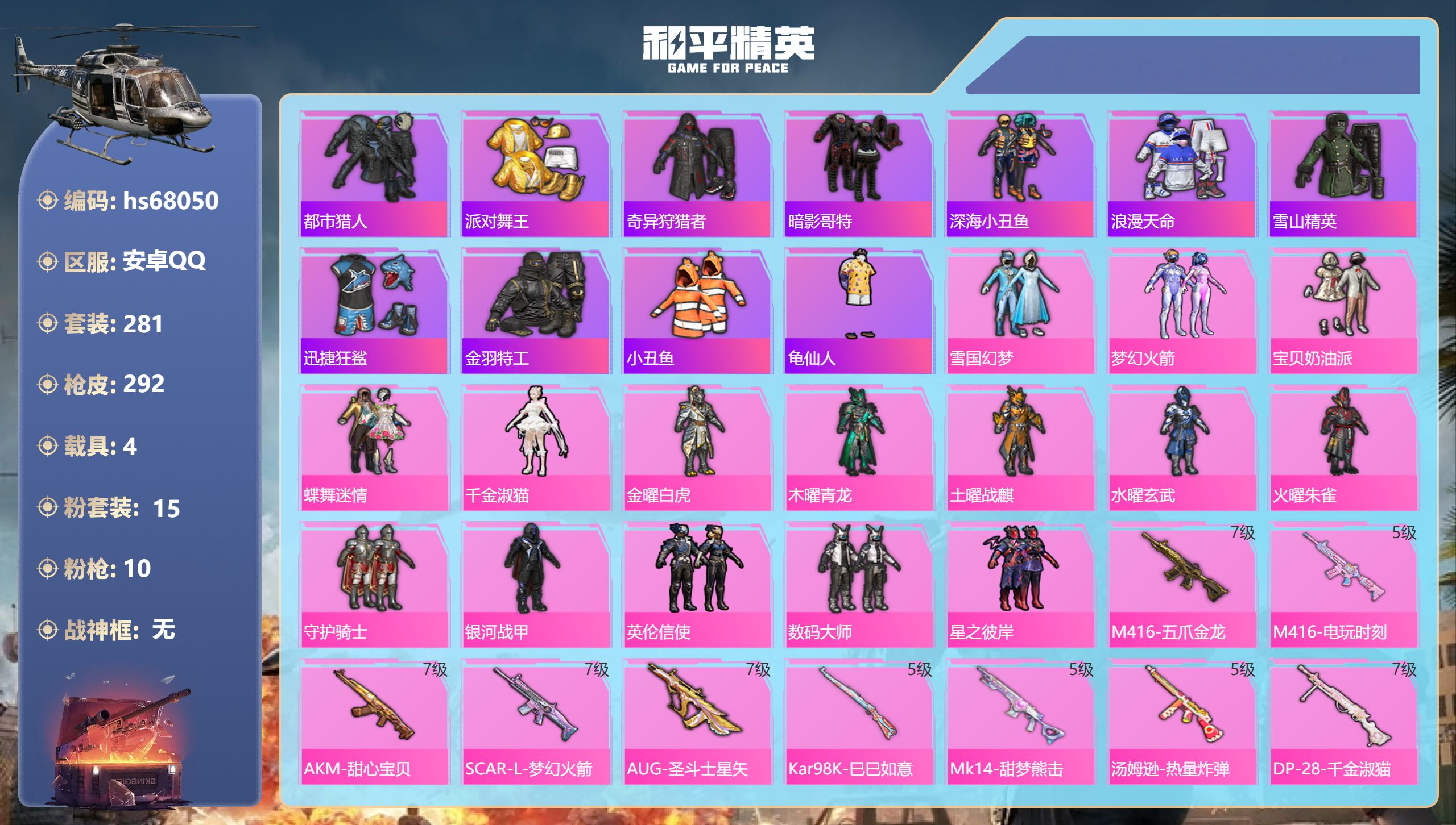 PX_2549241-,安卓手Q-17王牌印记-15粉装-10特效枪-4载具-热力值-281套装-292枪皮-1卓越印记-1传奇印记 【15粉装】角色-千金淑猫,套装-火曜朱雀,套装-木曜青龙,套装-蝶舞迷情,套装-水曜玄武,套装-数码大师,套装-金曜白虎,套装-英伦信使,套装-星之彼岸,套装-雪国幻梦,套装-土曜战麒,套装-宝贝奶油派,套装-守护骑士,套装-梦幻火箭,套装-银河战甲 【10特效枪】AUG-圣斗士星矢/7级,Kar98K-巳巳如意/5级,Mk14-甜梦熊击/5级,M416-五爪金龙/7级,M416-电玩时刻/5级,AKM-甜心宝贝/7级,DP-28-千金淑猫/7级,SCAR-L-梦幻火箭/7级,汤姆逊-热量炸弹/5级,AKS-74U-森灵之息/5级 【11稀有紫装】都市猎人,派对舞王,奇异狩猎者,暗影哥特,深海小丑鱼,浪漫天命,雪山精英,迅捷狂鲨,金羽特工,小丑鱼,龟仙人 【4稀有载具】玛莎拉蒂Ghibli(金),玛莎拉蒂Ghibli(粉),玛莎拉蒂Ghibli(蓝),双人摩托-梦幻火箭 【282稀有时装】雪国幻梦,梦幻火箭,宝贝奶油派,蝶舞迷情,千金淑猫,金曜白虎,木曜青龙,土曜战麒,水曜玄武,火曜朱雀,守护骑士,银河战甲,英伦信使,数码大师,星之彼岸,S1赛事,太空漫步,狼队追光队服,都市猎人,浪漫天命,奇异狩猎者,龟仙人,雪山精英,暗影哥特,深海小丑鱼,小丑鱼,金羽特工,迅捷狂鲨,派对舞王,爱崽白熊,狂战萌兔,仓鼠灰灰,狂沙舞者,萌熊伴侣,潮萌小黄鸭,黄金大亨,折纸暴龙,龙魂突击队,异域银装,白糯汤圆,街头风暴,鱼渊荷华,萌熊伴侣,青团波波,大橘大利,燕燕于飞,海琴烟,战术大师,智谋强哥,糖糖葫芦,蝶变,元素星魂,彩虹兔,琴音绮想,霓虹热舞,雪绒豹,画境星梦,书海巡游,云朵鹅,顶瓜瓜,银尘,SS35特训,SS29特训,SS5特训,SS31特训,冰原使者,SS33特训,SS32特训,SS16特训,SS36特训,焰鹰斗篷,维京奇缘,拳皇97八神庵,决胜时刻,S5赛事,福星高照,精密机核,潮流炫酷,SS8特训,火舞潮人,白熊同盟,黄色格斗者,SS37特训,PEL摇滚竞梦者,击剑大师,SS28特训,S6赛事,恶魔宝贝,特训学院,猎鹰,青年教官,橘黑制服,红色运动,黄色运动,蓝色运动,黄色伏地魔,白色伏地魔,热血青春,碟中谍A款,冰川格斗者,活力之心,SS9特训,太极红客,帅气教官,酒红色名流,阳光火鸡,湖蓝色名流,黄色名流,绯格组合,棕色飞行服,幻世尖兵,SS26特训,红镰战舞者,迅猛虎鲸,苍影战舞者,野性山猫,翡翠之思,沙漠雄狮,漫步者,空岛之星,霸义无双,热情海星,黑色伏地魔,黎明保卫者,元气发射,纯真浪花,SS34特训,雪鹰学院,S2赛事,竞技名士,蓝色守护者,S3赛事,深蓝色名流,猛禽,雨林探路者,SS30特训,长空猛禽,竞技勇士朋克,特战装甲,战地菁英,旭日情侣,灰色格斗者,六六大吉,甜蜜告白,街头潮人,怒火燎原,冷焰舞者,惊鸿侠骨,魅力单车,灼焰舞者,雪山征服者,春光漫游,夜莺强袭者,野性战魂,水银刺客,SS2特训,派对绅士,传奇侦探,浪漫假日,极地朋克,贵族骑装,幻世战舞者,战地督导,甜蜜菠萝,半糖蓝莓,街舞之王,街舞达人,午夜朋克,突袭者,青涩时光,特种空勤,牛气满满,和平特警,风暴特警,冰川特警,潮流先锋,雷霆特警,龙腾端午,燃烧卡路里,滨海假日,极速红龙,狙击之神,WiFi精灵,沙漠毒蛇,红釉青花,麻辣教官,鹰眼刺客,雨过天青,苍穹猎鹰,SS3特训,冰冻风暴,攀登者,冷酷挑战者,完美偶像,人气偶像,幽夜迷踪,SS4特训,幻影武者,梦魇先生,破蛋小黄鸡,摇滚战魂,疯狂小兔子,摇滚舞王,圣诞大吉,特战英豪,快闪甜心,凛冬战士,暗金炫舞,北国孤狼,蓝彩潮人,SS6特训,千禧之恋,神秘领域,炽焰拳师,绮丽涂鸦,格斗专家,耀眼新星,星光纪元,坚韧舞者,奇迹天团,竞技达人朋克,淡雅花蕊,野性战心,玲珑飞花,海岛探路者,跃动心情,SS7特训,破晓战魂,霓虹街区,都市魅力,萌趣颜团子,风行保卫者,特种颜团子,沙漠兵团,耀粉歌者,摩艾涂鸦,奇趣章鱼,SS12特训,王子的夏天,SS27特训,牛气冲天,冰凉西瓜,清新柠檬,SS13特训,飞行日记,金耀舞者,自由不朽乐队,机械哨兵,装甲骑士,SS20特训,SS21特训,弄潮海豚,深海梦境,SS22特训,呆萌铁蟹,夏日倾情,甜蜜熊情侣,缤纷果语,滨海厨神,青涩年华,灿烂千阳,SS14特训,神气柴柴,忍者信条,妙红点点,幻彩翩翩,格斗先锋,幻羽潜行,海盐绵绵冰,老实芭蕉,冷血极客,游猎者,旷野奇兵,刚毅裁决者,SS1特训,暗夜之虎,鹤鸣,懵萌河马,锦衣飞扬,万圣娃娃,惊声尖笑,黑夜传说 【292稀有枪械】M416-五爪金龙/7级,M416-电玩时刻/5级,AKM-甜心宝贝/7级,SCAR-L-梦幻火箭/7级,AUG-圣斗士星矢/7级,Kar98K-巳巳如意/5级,Mk14-甜梦熊击/5级,汤姆逊-热量炸弹/5级,DP-28-千金淑猫/7级,AKS-74U-森灵之息/5级,QBZ-纯真浪花,AWM-纯真浪花,汤姆逊-纯真浪花,DBS-乌木金纹,AA12-G-纯真浪花,平底锅-纯真浪花,蜜獾-精灵梦叶罗丽,SCAR-L-海盐豹豹,Mk14-冰河战士,撬棍-突变脉冲,M16A4-冰河战士,MK20-H-乌木金纹,MK12-乌木金纹,R45-幻彩电音,ACE32-画境星梦,M1加兰德-画境星梦,MP5K-画境星梦,蜜獾-乌木金纹,M762-云朵鹅,SVD-云朵鹅,M417-玩趣呆呆,UMP45-绿洲时空,MG3-鸢尾珑雾,AA12-G-画境星梦,G36C-星穹咏叹调,平底锅-画境星梦,M249-冰晶雪宝,Kar98K-星穹咏叹调,破片手榴弹-海盐豹豹,UMP45-海盐豹豹,Famas-乌木金纹,SPAS-12-云朵鹅,M249-无面战甲,AKS-74U-鸡智如我,沙漠之鹰-云朵鹅,烟雾弹-冰氧夏日,MG-36-薄荷星砂,大砍刀-云朵鹅,M416-红色方程式,M416-仓鼠灰灰,M416-乌木金纹,M416-蓝色火焰,M416-糯团青竹,M416-快乐主宰,M416-黄金龙骨,M416-南瓜骑士,AKM-影袭,AKM-百万伏特,AKM-折纸暴龙,AKM-奇异狩猎者,AKM-生命誓言,AKM-乌木金纹,AKM-缤纷海域,AKM-春暖花开,AKM-冰凉西瓜,AKM-破晓战魂,AKM-2P