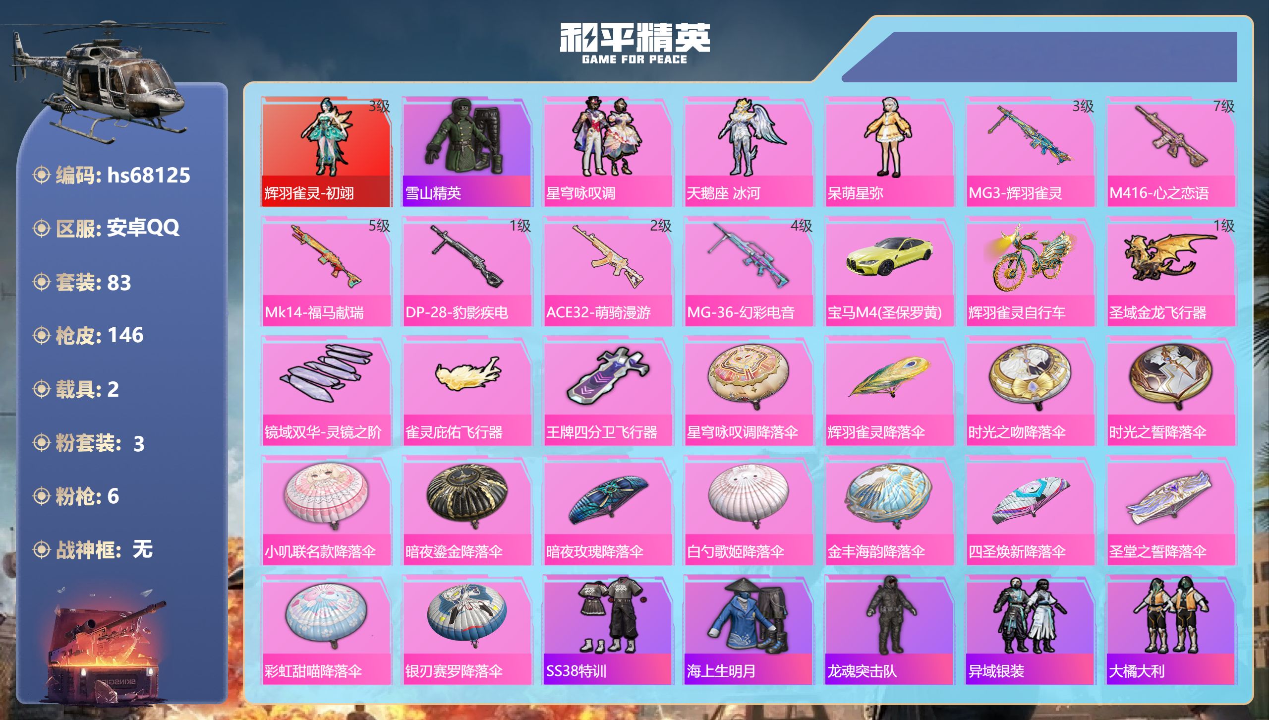 PX_2549238-,安卓手Q-4王牌印记-1红装-3粉装-6特效枪-2载具-45614热力值-83套装-146枪皮-1卓越印记-1传奇印记 【1红装】辉羽雀灵-初翊/3级 【3粉装】角色-天鹅座,冰河,套装-星穹咏叹调,角色-呆萌星弥 【6特效枪】Mk14-福马献瑞/5级,MG-36-幻彩电音/4级,M416-心之恋语/7级,MG3-辉羽雀灵/3级,ACE32-萌骑漫游/2级,DP-28-豹影疾电/1级 【1稀有紫装】雪山精英 【2稀有载具】宝马M4(圣保罗黄),辉羽雀灵自行车 【83稀有时装】初翊/3级,星穹咏叹调,天鹅座,冰河,呆萌星弥,SS38特训,雪山精英,海上生明月,龙魂突击队,异域银装,大橘大利,香桃花海,粉恋花,湖畔霞光,灵公主,雪绒豹,星影赞美诗,云朵鹅,顶瓜瓜,蓝冰羽,紫幽梦,马上来财,迷域探索者,SS31特训,SS33特训,SS32特训,SS16特训,星际旅行,暗夜傀儡,粉彩缠枝,福星高照,暗夜契约,夏日音浪,龙的传人,SS8特训,智慧之神,青玉碎影,萌黄之夏,SS37特训,摇滚狂鲨,热血青春,SS9特训,阳光火鸡,绯格组合,黎明保卫者,SS34特训,骑行爱好者,竞技名士,SS30特训,长空猛禽,灰色格斗者,甜蜜告白,牛气满满,月华战甲,极速红龙,狙击之神,红釉青花,雨过天青,福马献瑞,幻影武者,俏皮奶喵,破蛋小黄鸡,玄武圣者,白虎圣者,北国孤狼,神秘领域,原初圣火,逆风勇士,SS10特训,SS12特训,SS27特训,治愈之星,科技之星,SS13特训,SS17特训,瑞龙福将,团圆交子,绚烂繁星,SS19特训,梦起落英,缤纷果语,SS14特训,老实芭蕉,SS15特训 【146稀有枪械】MG3-辉羽雀灵/3级,M416-心之恋语/7级,Mk14-福马献瑞/5级,DP-28-豹影疾电/1级,ACE32-萌骑漫游/2级,MG-36-幻彩电音/4级,SLR-金丰海韵,蝎式手枪-金丰海韵,短管霰弹-圣域龙灵,PKM-紫幽梦,MG3-霓彩脉冲,R45-幻彩电音,Mk14-紫幽梦,蜜獾-乌木金纹,M762-云朵鹅,S1897-紫幽梦,SVD-云朵鹅,P92-紫幽梦,M417-玩趣呆呆,MK20-H-狂鲨锋刃,ARX-像素花束,大砍刀-像素花束,G36C-星穹咏叹调,短管霰弹-星穹咏叹调,Kar98K-星穹咏叹调,平底锅-紫幽梦,燃烧瓶-甜梦桃焰,破片手榴弹-海盐豹豹,UMP45-海盐豹豹,AKS-74U-乌木金纹,AKS-74U-辉羽雀灵,Famas-乌木金纹,SPAS-12-云朵鹅,M249-无面战甲,平底锅-辉羽雀灵,Mini14-辉羽雀灵,S1897-糯团青竹,汤姆逊-智耀战神,沙漠之鹰-云朵鹅,MG3-智耀战神,大砍刀-云朵鹅,平底锅-属我最6,M416-红色方程式,M416-乌木金纹,AKM-夜灯,AKM-四圣焕新,AKM-乌木金纹,AKM-龙的传人,SCAR-L-玉兔迎春,SCAR-L-乌木金纹,SCAR-L-龙宫之主,M16A4-幻世战舞者,M16A4-天使羽翼,GROZA-乌木金纹,GROZA-治愈之星,AUG-乌木金纹,AUG-耀粉歌者,AUG-天降萌叽,QBZ-原初圣火,QBZ-乌木金纹,QBZ-彩虹符号,M762-瑞龙福将,M762-乌木金纹,M762-彩虹符号,M762-牛气冲天,G36C-镜域双华,G36C-乌木金纹,AC-VAL-天降萌叽,蜜獾-天降萌叽,Kar98K-乌木金纹,Kar98K-彩虹符号,Kar98K-勇闯险境,M24-歌者泠鸢,M24-香水柠檬,M24-治愈之星,AWM-天降萌叽,AWM-乌木金纹,AWM-圣堂之誓,Win94-瑞龙福将,SKS-勇闯险境,SKS-炫彩节奏,Mini14-原初圣火,Mini14-炫彩节奏,Mk14-治愈之星,SLR-众神之王,SLR-四圣焕新,UZI-炫彩节奏,UZI-红色方程式,UZI-众神之王,UZI-天降萌叽,UMP45-生命誓言,UMP45-夜灯,Vector-暗夜玫瑰,Vector-生命誓言,Vector-彩虹符号,Vector-治愈之星,汤姆逊-乌木金纹,汤姆逊-勇闯险境,汤姆逊-花间之火,MP5K-众神之王,MP5K-乌木金纹,S686-红色方程式,S686-生命誓言,S1897-乌木金纹,S1897-暗夜鎏金,S1897-勇闯险境,S12K-乌木金纹,S12K-瑞龙福将,DBS-彩虹符号,M249-乌木金纹,M249-星之彼岸,M249-四圣焕新,DP-28-彩虹符号,DP-28-原初圣火,MG3-幻世战舞者,MG3-乌木金纹,MG3-瑞龙福将,P18C-原初圣火,平底锅-众神之王,平底锅-原初圣火,平底锅-勇闯险境,平底锅-治愈之星,平底锅-瑞龙福将,破片手榴弹-萌趣颜团子,DBS-绿洲时空,MG3-火熔核心,AUG-异域银装,MK20-H-星途旅人,十字弩-异域银装,SPAS-12-乌木金纹,破片手榴弹-星途旅人,M16A4-雨过天青,GROZA-福马献瑞,蜜獾-启元战纹,AMR-雨过天青,SLR-乌木金纹,AA12-G-雨过天青,PKM-雨过天青,沙漠之鹰-雨过天青,燃烧瓶-福马献瑞,Vector-荒原烈焰,VSS-香桃花海,Mini14-香桃花海,汤姆逊-像素花束,DBS-绿洲时空,MG3-火熔核心 【7稀有飞行器】圣域金龙飞行器/1级,镜域双华-灵镜之阶,雀灵庇佑飞行器,破刃行动尾迹,王牌四分卫飞行器,顶峰精英尾迹,异域银装飞行器 【21稀有背包】狂鲨锋刃背包(3级),星穹咏叹调背包(3级),辉羽雀灵背包(3级),智耀战神背包(3级),紫幽梦背包(3级),云朵鹅背包(3级),小叽联名款背包(3级),异域银装背包(3级),炫彩节奏背包(3级),洛神天依背包(3级),雨过天青背包(3级),治愈之星背包(3级),金风玉露背包(3级),福马献瑞背包(3级),香桃花海背包(3级),焰龙焚天背包(3级),四圣焕新背包(3级),SS8赛季背包(3级),SS7赛季背包(3级),山经魅狐背包(3级),SS9赛季背包(3级) 【37稀有降落伞】SS32王牌降落伞,星穹咏叹调降落伞,雨过天青降落伞,福马献瑞降落伞,紫幽梦降落伞,辉羽雀灵降落伞,SS33王牌降落伞,云朵鹅降落伞,时光之吻降落伞,一举夺葵降落伞,时光之誓降落伞,小叽联名款降落伞,紫菱降落伞,瑞龙福将降落伞,钢铁雄心降落伞,牛气冲天降落伞,青羽降落伞,普通降落伞,化学天才降落伞,暗夜鎏金降落伞,迷雾突击降落伞,异域银装降落伞,暗夜玫瑰降落伞,电玩视界降落伞,原初圣火降落伞,白勺歌姬降落伞,SS30王牌降落伞,萌趣颜团子降落伞,香桃花海降落伞,勇闯险境降落伞,金丰海韵降落伞,四圣焕新降落伞,治愈之星降落伞,圣堂之誓降落伞,彩虹甜喵降落伞,山经魅狐降落伞,银刃赛罗降落伞 【16稀有头盔】星穹咏叹