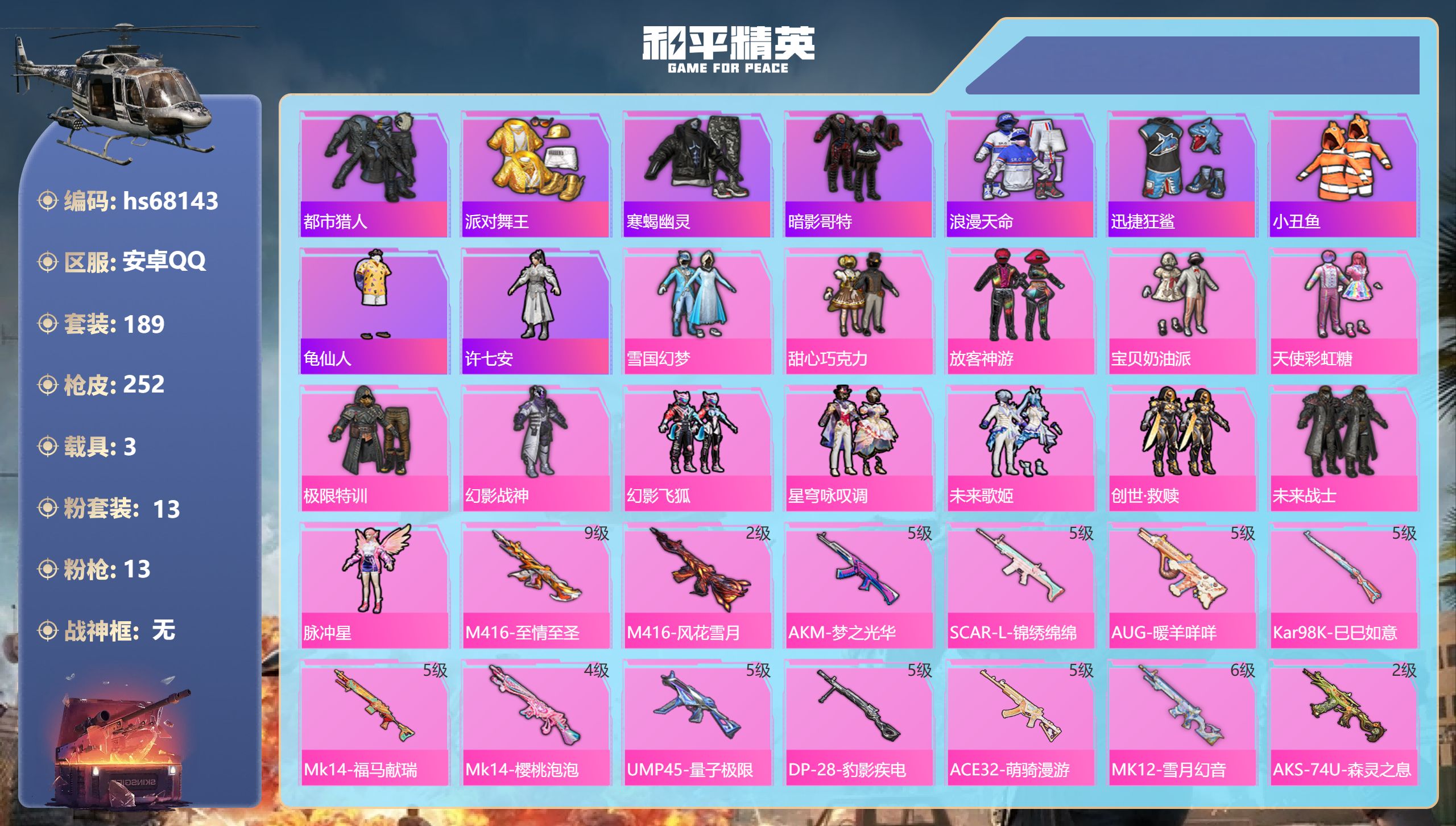 PX_2549234-,安卓手Q-13王牌印记-13粉装-13特效枪-3载具-82825热力值-189套装-252枪皮-5卓越印记 【13粉装】套装-宝贝奶油派,套装-创世·救赎,角色-脉冲星,套装-星穹咏叹调,套装-天使彩虹糖,套装-幻影飞狐,套装-未来战士,套装-甜心巧克力,套装-未来歌姬,套装-雪国幻梦,套装-放客神游,套装-幻影战神,套装-极限特训 【13特效枪】UMP45-量子极限/5级,SCAR-L-锦绣绵绵/5级,AKS-74U-森灵之息/2级,M416-至情至圣/9级,AKM-梦之光华/5级,DP-28-豹影疾电/5级,AUG-暖羊咩咩/5级,Kar98K-巳巳如意/5级,M416-风花雪月/2级,Mk14-福马献瑞/5级,ACE32-萌骑漫游/5级,MK12-雪月幻音/6级,Mk14-樱桃泡泡/4级 【9稀有紫装】都市猎人,派对舞王,寒蝎幽灵,暗影哥特,浪漫天命,迅捷狂鲨,小丑鱼,龟仙人,许七安 【3稀有载具】兰博基尼Estoque(银翼灰),暮色幽蹄,霜月冰狼 【189稀有时装】雪国幻梦,甜心巧克力,放客神游,宝贝奶油派,天使彩虹糖,极限特训,幻影战神,幻影飞狐,星穹咏叹调,未来歌姬,创世·救赎,未来战士,脉冲星,SS38特训,都市猎人,浪漫天命,寒蝎幽灵,龟仙人,暗影哥特,小丑鱼,迅捷狂鲨,派对舞王,狂沙舞者,Alan,Walker,龙魂突击队,小熊娃娃,异域银装,霜刃之御,白糯汤圆,星渊小夜曲,街头风暴,星途旅人,蜜桃派对,糖霜甜心,冰河战士,鱼渊荷华,青团波波,大橘大利,燕燕于飞,战术大师,智谋强哥,许七安,雏菊兔兔,马上有钱,糖糖葫芦,香桃花海,蝶变,巳巳如意,粉恋花,湖畔霞光,棉花软糖,元素星魂,午间小调,彩虹兔,琴音绮想,乐音,雪绒豹,画境星梦,星影赞美诗,朱霞炽焰,狂鲨锋刃,游乐,凌霄紫焰,云魄琉璃,擎苍青焰,炫彩糖果,萌鸡速递,元气之梦,书海巡游,风迹短诗,薄荷星砂,秘语星愿,云朵鹅,顶瓜瓜,冰公主,雪国风尚,蓝冰羽,恋语绒绒,青翼流星,紫幽梦,SS35特训,SS29特训,萝兰蝴蝶,SS31特训,SS33特训,SS32特训,SS36特训,贝斯之夜,焰鹰斗篷,军械专家,湖雨初晴,都市漫游者,龙的传人,潮流炫酷,白熊同盟,青玉碎影,SS37特训,SS28特训,特训学院,猎鹰,青年教官,黄色运动,黄色伏地魔,白色伏地魔,冰川格斗者,活力之心,阳光火鸡,黄色名流,绯格组合,SS26特训,漫步者,空岛之星,荧惑魅影,热情海星,黑色伏地魔,纯真浪花,SS34特训,竞技名士,猛禽,雨林探路者,SS30特训,特战装甲,旭日情侣,街头潮人,冷焰舞者,惊鸿侠骨,魅力单车,灼焰舞者,云霞荷露,雪山征服者,春光漫游,水银刺客,极地朋克,幻世战舞者,牛气满满,春日漫步,冰川特警,燃烧卡路里,幻影公爵,狙击之神,生化防暴队,红釉青花,麻辣教官,鹰眼刺客,雨过天青,福马献瑞,冰冻风暴,冷酷挑战者,完美偶像,幻影武者,破蛋小黄鸡,摇滚舞王,快闪甜心,蓝彩潮人,耀眼新星,坚韧舞者,野性战心,海岛探路者,破晓战魂,幻世保卫者,霓虹街区,森林游猎者,耀粉歌者,探宝勇士,SS27特训,飞行日记,光之冒险,SS20特训,SS21特训,玉兔迎春,弄潮海豚,SS22特训,SS23特训,呆萌铁蟹,夏日倾情,缤纷果语,滨海厨神,青涩年华,忍者信条,幻彩翩翩,幻羽潜行,海盐绵绵冰,老实芭蕉,王牌教练,暗夜之虎,SS24特训,鹤鸣,SS25特训,锦衣飞扬 【251稀有枪械】M416-至情至圣/9级,M416-风花雪月/2级,AKM-梦之光华/5级,SCAR-L-锦绣绵绵/5级,AUG-暖羊咩咩/5级,Kar98K-巳巳如意/5级,Mk14-福马献瑞/5级,Mk14-樱桃泡泡/4级,UMP45-量子极限/5级,DP-28-豹影疾电/5级,ACE32-萌骑漫游/5级,MK12-雪月幻音/6级,AKS-74U-森灵之息/2级,QBZ-纯真浪花,AWM-纯真浪花,汤姆逊-纯真浪花,DBS-乌木金纹,AA12-G-纯真浪花,平底锅-纯真浪花,P1911-创世·救赎,SLR-墨龙九天,撬棍-朗基努斯之枪,SCAR-L-海盐豹豹,GROZA-海盐豹豹,SLR-金丰海韵,野牛-雏菊兔兔,Mk14-冰河战士,AKS-74U-尼罗河传说,平底锅-雏菊兔兔,M762-雏菊兔兔,Mini14-雏菊兔兔,Vector-突变脉冲,R1895-雏菊兔兔,UZI-冰河战士,M16A4-冰河战士,MK20-H-乌木金纹,DBS-风迹短诗,莫辛纳甘-风迹短诗,AKM-绿洲时空,Win94-乌木金纹,MK12-风迹短诗,MK12-乌木金纹,烟雾弹-冰澜龙吟,破片手榴弹-爆破雪人,PKM-紫幽梦,MG3-霓彩脉冲,ACE32-画境星梦,SCAR-L-冷漠罗丽,M1加兰德-画境星梦,MP5K-画境星梦,M762-登顶巅峰,Mk14-紫幽梦,蜜獾-乌木金纹,M762-云朵鹅,S1897-紫幽梦,SVD-云朵鹅,P92-紫幽梦,M249-绯穹魔姬,SPAS-12-狂鲨锋刃,M417-玩趣呆呆,MK20-H-狂鲨锋刃,AUG-冰晶雪宝,铝热弹-炫彩糖果,UZI-炫彩糖果,UMP45-绿洲时空,ARX-像素花束,大砍刀-像素花束,AA12-G-画境星梦,G36C-星穹咏叹调,平底锅-画境星梦,短管霰弹-星穹咏叹调,M249-冰晶雪宝,Kar98K-星穹咏叹调,Mk47-风迹短诗,JS9-凌霄紫焰,MG-36-凌霄紫焰,平底锅-紫幽梦,破片手榴弹-海盐豹豹,UMP45-海盐豹豹,ARX-凌霄紫焰,AKS-74U-乌木金纹,AKM-涂鸦街区,蜜獾-风迹短诗,爆炸猎弓-喜羊羊与灰太狼,P92-凌霄紫焰,Famas-乌木金纹,Famas-霓彩脉冲,SPAS-12-云朵鹅,破片手榴弹-拽到爆炸,S1897-糯团青竹,平底锅-凌霄紫焰,沙漠之鹰-云朵鹅,烟雾弹-冰氧夏日,Mk14-紫晶流影,MG-36-薄荷星砂,SCAR-L-绿洲时空,大砍刀-云朵鹅,PKM-啾咪啾咪,DBS-荧海星豚,SLR-霓彩脉冲,平底锅-属我最6,SCAR-L-彩虹符号,蜜獾-绿洲时空,蜜獾-冰澜龙吟,大砍刀-冰澜龙吟,S12K-霓彩脉冲,AKM-霓彩脉冲,M416-红色方程式,M416-蓝色火焰,M416-诡夜天鹅,M416-绯红前夜,AKM-影袭,AKM-缤纷海域,AKM-龙的传人,AKM-2P战斗服款,SCAR-L-红色方程式,SCAR-L-玉兔迎春,SCAR-L-夜灯,M16A4-幻世战舞者,GROZA-影袭,AUG-幻影战神,AUG-耀粉歌者,AUG-甜蜜菠萝,M762-绯红前夜,M762-甜心宝贝,Mk47-乌木金纹,Mk47-妙红点点,AC-VAL-天降萌叽,AC-VAL-快闪甜心,AC-VAL-乌木金纹,蜜獾-天降萌叽,Kar98K-王