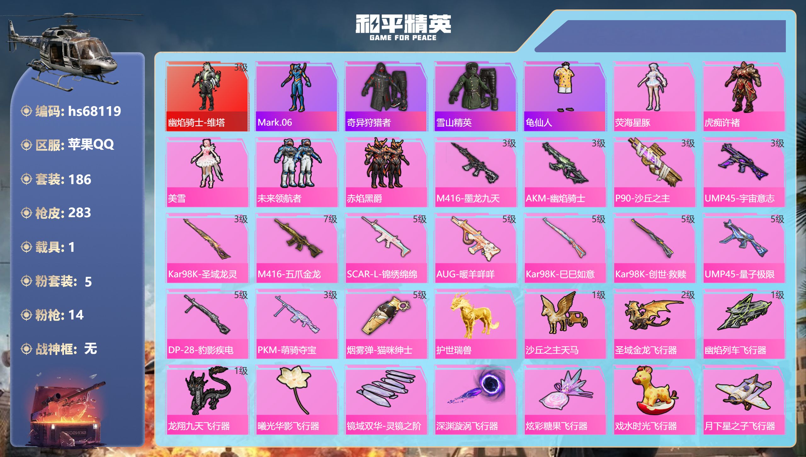 PX_2549236-,苹果手Q-17王牌印记-1红装-5粉装-14特效枪-1载具-93469热力值-186套装-283枪皮-3卓越印记-2传奇印记 【1红装】幽焰骑士-维塔/3级 【5粉装】角色-美雪,套装-未来领航者,套装-赤焰黑爵,角色-虎痴许褚,角色-荧海星豚 【14特效枪】AUG-暖羊咩咩/5级,烟雾弹-猫咪绅士/5级,PKM-萌骑夺宝/3级,Kar98K-巳巳如意/5级,M416-墨龙九天/3级,Kar98K-创世·救赎/5级,M416-五爪金龙/7级,P90-沙丘之主/3级,UMP45-宇宙意志/3级,AKM-幽焰骑士/3级,UMP45-量子极限/5级,DP-28-豹影疾电/5级,Kar98K-圣域龙灵/3级,SCAR-L-锦绣绵绵/5级 【4稀有紫装】Mark.06,奇异狩猎者,雪山精英,龟仙人 【1稀有载具】护世瑞兽 【185稀有时装】维塔/3级,荧海星豚,虎痴许褚,美雪,未来领航者,赤焰黑爵,迅捷龙虾,SS38特训,奇异狩猎者,龟仙人,Mark.06,雪山精英,粉雾星云,萌趣咩咩,晶灵使者,鹿角斗士,龙魂突击队,小熊娃娃,异域银装,纯白跃动,都市丽猫,摩登魅猫,街头风暴,星途旅人,冰河战士,鱼渊荷华,青团波波,大橘大利,燕燕于飞,战术大师,紫俏灵猫,听雨铃兰,雏菊兔兔,糖糖葫芦,晶辉守护,香桃花海,蝶变,巳巳如意,粉恋花,粉日山川,曼妙人鱼,朱霞炽焰,阳光菠萝,绛羽幽主,凌霄紫焰,擎苍青焰,萌鸡速递,元气之梦,顶瓜瓜,雪国风尚,蓝冰羽,青翼流星,紫幽梦,SS35特训,机械英豪,机械征服者,SS29特训,萝兰蝴蝶,SS5特训,SS31特训,SS33特训,SS32特训,SS16特训,星际旅行,SS36特训,焰鹰斗篷,红酒骑士,军械专家,金鼠迎春,夏日音浪,龙的传人,SS8特训,白熊同盟,萌黄之夏,SS37特训,蝶吟花词,SS28特训,特训学院,蓝色运动,黄色伏地魔,白色伏地魔,热血青春,冰川格斗者,SS9特训,酒红色名流,阳光火鸡,湖蓝色名流,绯格组合,SS26特训,酷萌兔限定,空岛之星,热情海星,黑色伏地魔,纯真浪花,SS34特训,骑行爱好者,竞技名士,深蓝色名流,猛禽,雨林探路者,SS30特训,长空猛禽,竞技勇士朋克,战地菁英,旭日情侣,甜蜜告白,怒火燎原,冷焰舞者,惊鸿侠骨,魅力单车,春光漫游,夜莺强袭者,甜心亚梦,SS2特训,虚音幻奏,贵族骑装,幻世战舞者,战地督导,青涩时光,娇憨猪猪,风暴特警,冰川特警,沙漠毒蛇,红釉青花,麻辣教官,雨过天青,SS3特训,冰冻风暴,SS11特训,幽夜迷踪,SS4特训,幻影武者,破蛋小黄鸡,疯狂小兔子,快闪甜心,北国孤狼,蓝彩潮人,SS6特训,绮丽涂鸦,坚韧舞者,原初圣火,逆风勇士,海岛探路者,跃动心情,SS7特训,破晓战魂,和煦暖阳,霓虹街区,田园牧歌,萌趣颜团子,轻风白浪,SS10特训,特种颜团子,耀粉歌者,探宝勇士,SS12特训,SS27特训,牛气冲天,SS18特训,SS13特训,飞行日记,岑岑玉浪,SS17特训,金耀舞者,光之冒险,SS20特训,SS21特训,玉兔迎春,SS22特训,SS23特训,呆萌铁蟹,缤纷果语,SS14特训,格斗先锋,幻羽潜行,海盐绵绵冰,老实芭蕉,刚毅裁决者,SS1特训,王牌教练,柠萌假日,SS24特训,SS25特训,锦衣飞扬,SS15特训 【282稀有枪械】M416-墨龙九天/3级,AKM-幽焰骑士/3级,P90-沙丘之主/3级,UMP45-宇宙意志/3级,Kar98K-圣域龙灵/3级,M416-五爪金龙/7级,SCAR-L-锦绣绵绵/5级,AUG-暖羊咩咩/5级,Kar98K-巳巳如意/5级,Kar98K-创世·救赎/5级,UMP45-量子极限/5级,DP-28-豹影疾电/5级,PKM-萌骑夺宝/3级,烟雾弹-猫咪绅士/5级,GROZA-奶油梦幻熊,QBZ-纯真浪花,AWM-纯真浪花,汤姆逊-纯真浪花,DBS-乌木金纹,AA12-G-纯真浪花,平底锅-纯真浪花,Famas-墨龙九天,AMR-墨龙九天,SLR-墨龙九天,蝎式手枪-奶油梦幻熊,烟雾弹-鸢尾晶梦,蜜獾-精灵梦叶罗丽,R1895-绊爱,SCAR-L-海盐豹豹,SCAR-L-绊爱,GROZA-海盐豹豹,野牛-雏菊兔兔,蝎式手枪-金丰海韵,Mk14-冰河战士,平底锅-雏菊兔兔,M762-雏菊兔兔,Mini14-雏菊兔兔,PKM-明月桂语,M200-宇宙意志,R1895-雏菊兔兔,Mk47-极冰使者,UZI-冰河战士,Famas-涂鸦旋风,M16A4-冰河战士,MK20-H-乌木金纹,MK20-H-圣域龙灵,短管霰弹-圣域龙灵,AKM-绿洲时空,Win94-乌木金纹,MK12-乌木金纹,PKM-紫幽梦,Mk14-紫幽梦,蜜獾-乌木金纹,S1897-紫幽梦,P92-紫幽梦,SPAS-12-狂鲨锋刃,M417-玩趣呆呆,MK20-H-狂鲨锋刃,突击盾牌-绝对恒星,铝热弹-炫彩糖果,M416-萌萌史莱姆,ARX-像素花束,MG3-鸢尾珑雾,大砍刀-像素花束,JS9-凌霄紫焰,MG-36-凌霄紫焰,平底锅-紫幽梦,破片手榴弹-海盐豹豹,UMP45-海盐豹豹,ARX-凌霄紫焰,AKS-74U-乌木金纹,AKM-涂鸦街区,爆炸猎弓-喜羊羊与灰太狼,P92-凌霄紫焰,Famas-乌木金纹,M249-无面战甲,S1897-糯团青竹,平底锅-凌霄紫焰,Mk14-薄荷星砂,TMP-9-雪月幻音,MG-36-薄荷星砂,SLR-霓彩脉冲,平底锅-属我最6,SCAR-L-彩虹符号,蜜獾-鸡智如我,M416-夜灯,M416-糯团青竹,M416-暗夜行者,AKM-夜灯,AKM-奇异狩猎者,AKM-生命誓言,AKM-缤纷海域,AKM-破晓战魂,AKM-龙的传人,AKM-灼热熔岩,AKM-萌趣颜团子,SCAR-L-玉兔迎春,SCAR-L-夜灯,SCAR-L-炫彩节奏,SCAR-L-生命誓言,M16A4-机械英豪,M16A4-红色方程式,M16A4-蓝色火焰,M16A4-幻世战舞者,M16A4-甜心亚梦,M16A4-乌木金纹,M16A4-天使羽翼,GROZA-乌木金纹,GROZA-田园牧歌,GROZA-生命誓言,AUG-乌木金纹,AUG-耀粉歌者,AUG-甜蜜菠萝,AUG-天降萌叽,QBZ-妙趣可丽,QBZ-赛罗,QBZ-原初圣火,QBZ-乌木金纹,QBZ-彩虹符号,M762-生命誓言,M762-乌木金纹,M762-彩虹符号,M762-绯红前夜,M762-牛气冲天,M762-奇异狩猎者,M762-天降萌叽,Mk47-乌木金纹,G36C-镜域双华,G36C-乌木金纹,AC-VAL-快闪甜心,AC-VAL-甜心亚梦,AC-VAL-乌木金纹,蜜獾-天降萌叽,蜜獾-垂柳戏鸭,蜜獾-娇憨猪猪,Famas-镜域双华,Famas-璀璨流光,Kar98K-乌木金纹,Kar98K-王子的夏天,Kar98K-红色方程式,Kar98K-古堡领主,Kar98K-彩虹符号,M24-乌木金纹,AWM-天降萌叽,AWM-乌木金纹,AWM-焰鹰斗篷,Win94-机械英