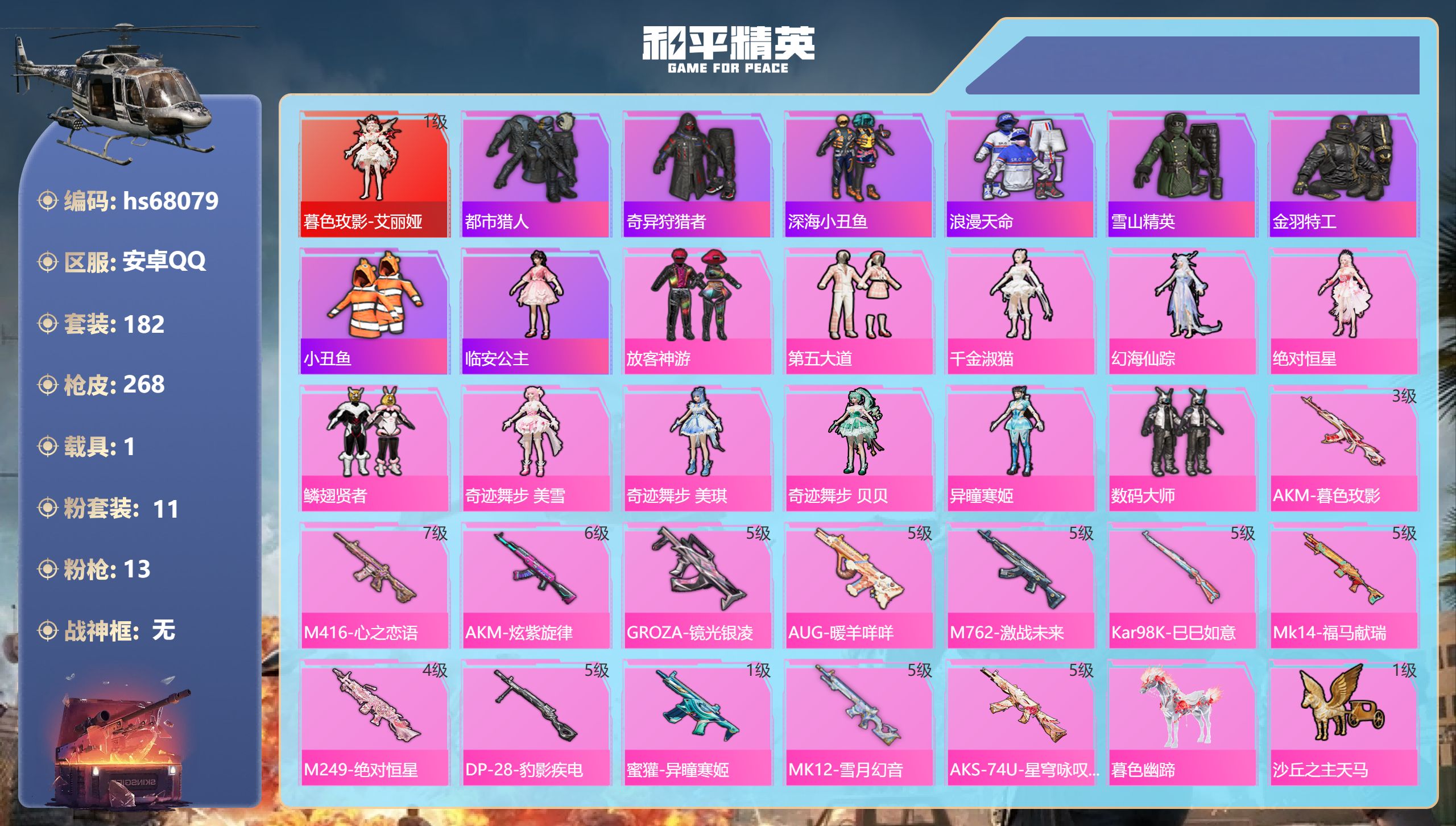 PX_2549229-,安卓手Q-15王牌印记-1红装-11粉装-13特效枪-1载具-90156热力值-182套装-268枪皮-3卓越印记-1传奇印记 【1红装】暮色玫影-艾丽娅/1级 【11粉装】套装-鳞翅贤者,角色-幻海仙踪,角色-奇迹舞步,贝贝,套装-第五大道,角色-奇迹舞步,美雪,角色-奇迹舞步,美琪,套装-数码大师,套装-放客神游,角色-绝对恒星,角色-千金淑猫,角色-异瞳寒姬 【13特效枪】AKM-炫紫旋律/6级,Kar98K-巳巳如意/5级,AKM-暮色玫影/3级,AUG-暖羊咩咩/5级,Mk14-福马献瑞/5级,M762-激战未来/5级,M249-绝对恒星/4级,M416-心之恋语/7级,GROZA-镜光银凌/5级,MK12-雪月幻音/5级,AKS-74U-星穹咏叹调/5级,蜜獾-异瞳寒姬/1级,DP-28-豹影疾电/5级 【8稀有紫装】都市猎人,奇异狩猎者,深海小丑鱼,浪漫天命,雪山精英,金羽特工,小丑鱼,临安公主 【1稀有载具】暮色幽蹄 【182稀有时装】艾丽娅/1级,放客神游,第五大道,千金淑猫,幻海仙踪,绝对恒星,鳞翅贤者,奇迹舞步,美雪,奇迹舞步,美琪,奇迹舞步,贝贝,异瞳寒姬,数码大师,都市猎人,浪漫天命,奇异狩猎者,雪山精英,深海小丑鱼,小丑鱼,金羽特工,大橘为重,狂沙舞者,龙魂突击队,小熊娃娃,鲛海歌灵,异域银装,蓝调潮影,纯白跃动,幽澜祭司,摩登魅猫,星途旅人,航行童话,冰河战士,鱼渊荷华,青团波波,大橘大利,燕燕于飞,临安公主,战术大师,智谋强哥,雏菊兔兔,糖糖葫芦,晶辉守护,香桃花海,蝶变,巳巳如意,粉恋花,曼妙人鱼,棉花软糖,TMG战队服,果冻柠檬,午间小调,琴音绮想,雪绒豹,画境星梦,朱霞炽焰,狂鲨锋刃,喜羊羊,懒羊羊,凌霄紫焰,云魄琉璃,擎苍青焰,炫彩糖果,萌鸡速递,元气之梦,书海巡游,风迹短诗,甜心蒙太奇,薄荷星砂,秘语星愿,超感刻度,云朵鹅,顶瓜瓜,银尘,雪国风尚,蓝冰羽,恋语绒绒,青翼流星,紫幽梦,SS35特训,迷域探索者,机械征服者,SS29特训,萝兰蝴蝶,SS31特训,SS33特训,SS32特训,SS36特训,焰鹰斗篷,炫光向阳,纯白誓言,夏日音浪,众神之王,智慧之神,萌黄之夏,SS37特训,PEL摇滚竞梦者,SS28特训,红色运动,黄色伏地魔,白色伏地魔,热血青春,登山爱好者,SS9特训,深海格斗者,湖蓝色名流,酷潮明星,绯格组合,涂山之恋,漫步者,热情海星,黑色伏地魔,炫蓝之夏,纯真浪花,SS34特训,竞技名士,深蓝色名流,猛禽,SS30特训,长空猛禽,竞技勇士朋克,特战装甲,旭日情侣,灰色格斗者,冷焰舞者,魅力单车,幻世战舞者,牛气满满,春日漫步,幻影公爵,狙击之神,鹰眼刺客,冰冻风暴,完美偶像,SS11特训,人气偶像,幽夜迷踪,幻影武者,破蛋小黄鸡,疯狂小兔子,北国孤狼,SS6特训,诡谋托雷基亚,绮丽涂鸦,耀眼新星,原初圣火,逆风勇士,海岛探路者,跃动心情,SS7特训,霓虹街区,田园牧歌,轻风白浪,镭射皇者,耀粉歌者,SS12特训,SS27特训,牛气冲天,治愈之星,银白舞王,科技之星,SS13特训,飞行日记,熠彩粉晶,SS19特训,光之冒险,SS20特训,SS21特训,玉兔迎春,SS22特训,SS23特训,甜蜜熊情侣,缤纷果语,滨海厨神,SS14特训,天籁歌者,妙红点点,幻彩翩翩,幻羽潜行,海盐绵绵冰,王牌教练,柠萌假日,粉红小猪 【268稀有枪械】AKM-暮色玫影/3级,M416-心之恋语/7级,AKM-炫紫旋律/6级,GROZA-镜光银凌/5级,AUG-暖羊咩咩/5级,M762-激战未来/5级,Kar98K-巳巳如意/5级,Mk14-福马献瑞/5级,M249-绝对恒星/4级,DP-28-豹影疾电/5级,蜜獾-异瞳寒姬/1级,MK12-雪月幻音/5级,AKS-74U-星穹咏叹调/5级,QBZ-纯真浪花,AWM-纯真浪花,汤姆逊-纯真浪花,DBS-乌木金纹,AA12-G-纯真浪花,平底锅-纯真浪花,蜜獾-精灵梦叶罗丽,SCAR-L-海盐豹豹,野牛-雏菊兔兔,Mk14-冰河战士,平底锅-雏菊兔兔,M762-雏菊兔兔,Mini14-雏菊兔兔,R1895-雏菊兔兔,UZI-冰河战士,M16A4-冰河战士,MK20-H-乌木金纹,DBS-风迹短诗,莫辛纳甘-风迹短诗,Win94-乌木金纹,MK12-风迹短诗,MK12-乌木金纹,破片手榴弹-爆破雪人,S12K-极意拳锋,PKM-紫幽梦,MG3-霓彩脉冲,ACE32-画境星梦,M1加兰德-画境星梦,MP5K-画境星梦,Mk14-紫幽梦,蜜獾-乌木金纹,M762-云朵鹅,S1897-紫幽梦,SVD-云朵鹅,P92-紫幽梦,蜜獾-绯穹魔姬,M249-绯穹魔姬,SPAS-12-狂鲨锋刃,M417-玩趣呆呆,MK20-H-狂鲨锋刃,燃点复合弓-幻海仙踪,AUG-冰晶雪宝,突击盾牌-绝对恒星,铝热弹-炫彩糖果,UZI-炫彩糖果,AWM-奇迹舞步,信号枪-奇迹舞步,AA12-G-画境星梦,平底锅-画境星梦,M249-冰晶雪宝,Mk47-风迹短诗,JS9-凌霄紫焰,MG-36-凌霄紫焰,平底锅-紫幽梦,破片手榴弹-海盐豹豹,ARX-凌霄紫焰,AKS-74U-乌木金纹,蜜獾-风迹短诗,P92-凌霄紫焰,AMR-喜羊羊与灰太狼,Famas-乌木金纹,Famas-霓彩脉冲,SPAS-12-云朵鹅,M249-无面战甲,破片手榴弹-拽到爆炸,十字弩-异瞳寒姬,S1897-糯团青竹,信号枪-异瞳寒姬,平底锅-凌霄紫焰,汤姆逊-智耀战神,S12K-智耀战神,沙漠之鹰-云朵鹅,MG-36-薄荷星砂,大砍刀-云朵鹅,PKM-啾咪啾咪,AUG-绝对恒星,爆炸猎弓-雪月幻音,SLR-霓彩脉冲,平底锅-属我最6,M762-果冻柠檬,P1911-果冻柠檬,AKM-霓彩脉冲,M416-红色方程式,M416-乌木金纹,M416-夜灯,AKM-影袭,AKM-百万伏特,AKM-乌木金纹,AKM-缤纷海域,AKM-春暖花开,AKM-阿狸红,AKM-霓虹街区,SCAR-L-乌木金纹,SCAR-L-炫彩节奏,M16A4-机械英豪,M16A4-幻世战舞者,GROZA-乌木金纹,GROZA-影袭,GROZA-田园牧歌,GROZA-治愈之星,AUG-耀粉歌者,AUG-天降萌叽,QBZ-神秘黑猫,QBZ-洛神天依,QBZ-赛罗,QBZ-原初圣火,QBZ-乌木金纹,M762-镭射皇者,M762-乌木金纹,M762-彩虹符号,M762-牛气冲天,M762-暗夜鎏金,M762-快乐主宰,M762-第五大道,M762-彩虹甜喵,M762-天降萌叽,Mk47-乌木金纹,Mk47-妙红点点,Mk47-洛神天依,蜜獾-天降萌叽,蜜獾-千面幻镜,Kar98K-红色方程式,Kar98K-洛神天依,Kar98K-幻