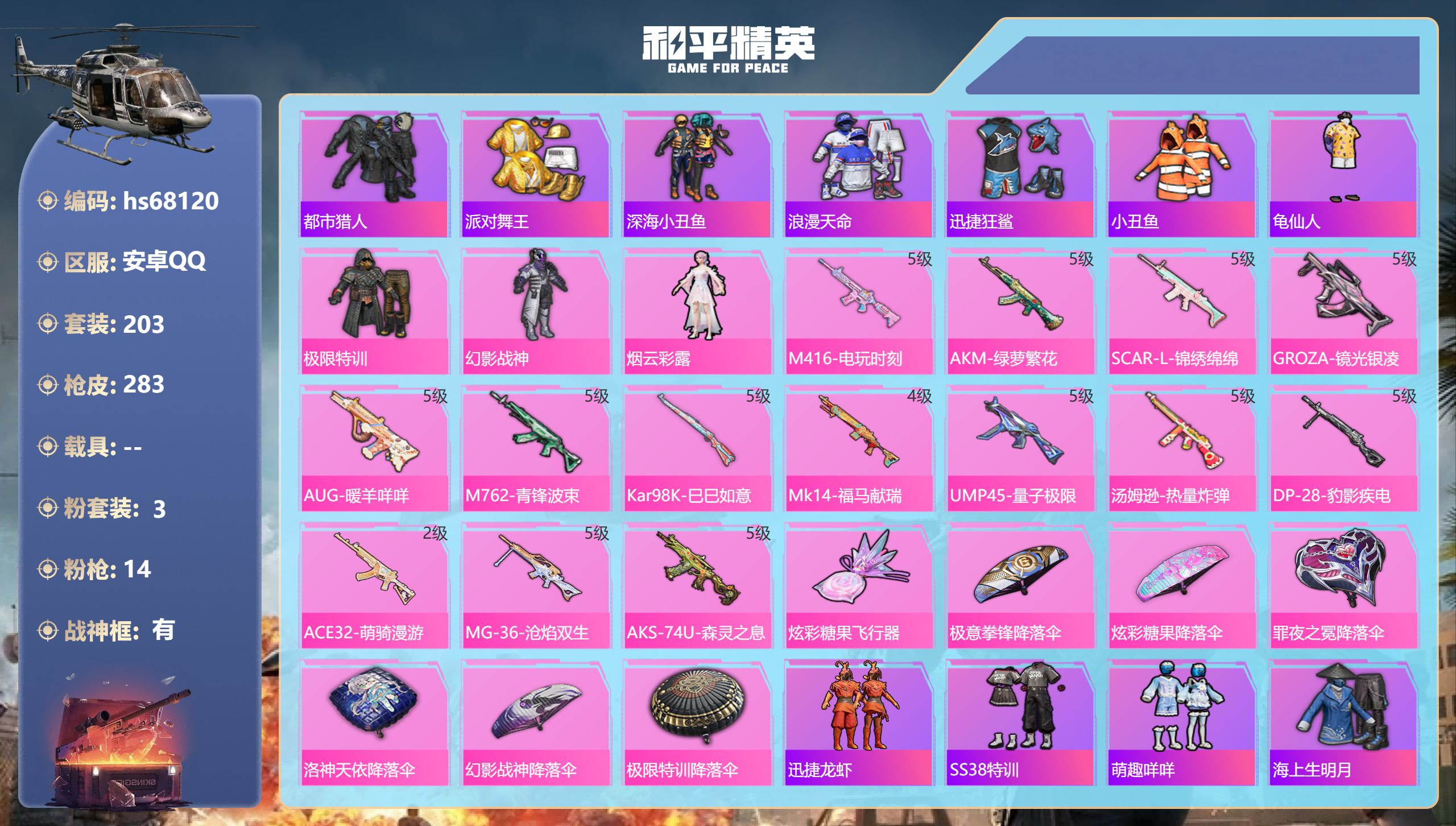 PX_2549222-,安卓手Q-23王牌印记-有战神框-3粉装-14特效枪-77194热力值-203套装-283枪皮 【3粉装】套装-极限特训,角色-烟云彩露,套装-幻影战神 【14特效枪】AUG-暖羊咩咩/5级,M416-电玩时刻/5级,Kar98K-巳巳如意/5级,UMP45-量子极限/5级,GROZA-镜光银凌/5级,M762-青锋波束/5级,AKM-绿萝繁花/5级,SCAR-L-锦绣绵绵/5级,MG-36-沧焰双生/5级,AKS-74U-森灵之息/5级,ACE32-萌骑漫游/2级,Mk14-福马献瑞/4级,DP-28-豹影疾电/5级,汤姆逊-热量炸弹/5级 【7稀有紫装】都市猎人,派对舞王,深海小丑鱼,浪漫天命,迅捷狂鲨,小丑鱼,龟仙人 【203稀有时装】极限特训,幻影战神,烟云彩露,迅捷龙虾,SS38特训,都市猎人,浪漫天命,龟仙人,深海小丑鱼,小丑鱼,迅捷狂鲨,派对舞王,萌趣咩咩,海上生明月,小熊娃娃,白糯汤圆,星途旅人,鱼渊荷华,青团波波,大橘大利,燕燕于飞,达芬奇,战术大师,智谋强哥,雏菊兔兔,幽雨猫猫,糖糖葫芦,香桃花海,元素星魂,午间小调,琴音绮想,雪绒豹,画境星梦,朱霞炽焰,游乐,凌霄紫焰,云魄琉璃,无面战甲,擎苍青焰,炫彩糖果,萌鸡速递,元气之梦,书海巡游,风迹短诗,蜜露汐语,漫游都市,薄荷星砂,秘语星愿,白光莹,云朵鹅,顶瓜瓜,蓝冰羽,青翼流星,紫幽梦,马上来财,SS35特训,SS29特训,萝兰蝴蝶,SS31特训,SS33特训,SS32特训,SS16特训,暴风机械师,时空追击者,SS36特训,贝斯之夜,焰鹰斗篷,福星高照,都市漫游者,虎虎生威吉莉,夏日音浪,龙的传人,潮流炫酷,白熊同盟,萌黄之夏,SS37特训,SS28特训,特训学院,猎鹰,青年教官,橘黑制服,红色运动,黄色运动,蓝色运动,黄色伏地魔,飞驰魅影,白色伏地魔,音速流光,爆竹金鼠,酒红色名流,阳光火鸡,湖蓝色名流,黄色名流,绯格组合,涂山之恋,SS26特训,漫步者,空岛之星,热情海星,黑色伏地魔,炫蓝之夏,纯真浪花,SS34特训,竞技名士,浑天鲲鹏,深蓝色名流,猛禽,SS30特训,长空猛禽,特战装甲,旭日情侣,街头潮人,冷焰舞者,惊鸿侠骨,魅力单车,灼焰舞者,云霞荷露,春光漫游,水银刺客,甜心亚梦,虚音幻奏,幻世战舞者,战地督导,青涩时光,牛气满满,娇憨猪猪,春日漫步,幻影公爵,滨海假日,极速红龙,狙击之神,红釉青花,麻辣教官,鹰眼刺客,雨过天青,福马献瑞,冰冻风暴,玲珑侠影,冷酷挑战者,完美偶像,人气偶像,幻影武者,暖心橘喵,破蛋小黄鸡,摇滚战魂,快闪甜心,蓝彩潮人,千禧之恋,绮丽涂鸦,竞技达人朋克,超能勇士,海岛探路者,破晓战魂,幻世保卫者,霓虹街区,田园牧歌,都市魅力,萌趣颜团子,轻风白浪,特种颜团子,耀粉歌者,探宝勇士,SS27特训,SS18特训,SS17特训,瑞龙福将,团圆交子,蓝调潮人,异彩先驱,霓虹极客,空投萌叽,SS19特训,光之冒险,SS20特训,血色贵族,SS21特训,玉兔迎春,弄潮海豚,SS22特训,SS23特训,飞狐塔尔斯,缤纷果语,滨海厨神,SS14特训,电音精灵,神气柴柴,忍者信条,妙红点点,幻彩翩翩,格斗先锋,幻羽潜行,海盐绵绵冰,老实芭蕉,吉莉礼服,王牌教练,荣耀,柠萌假日,SS24特训,绚紫流光,懵萌河马,SS25特训,锦衣飞扬,SS15特训 【283稀有枪械】M416-电玩时刻/5级,AKM-绿萝繁花/5级,SCAR-L-锦绣绵绵/5级,GROZA-镜光银凌/5级,AUG-暖羊咩咩/5级,M762-青锋波束/5级,Kar98K-巳巳如意/5级,Mk14-福马献瑞/4级,UMP45-量子极限/5级,汤姆逊-热量炸弹/5级,DP-28-豹影疾电/5级,ACE32-萌骑漫游/2级,MG-36-沧焰双生/5级,AKS-74U-森灵之息/5级,QBZ-纯真浪花,AWM-纯真浪花,汤姆逊-纯真浪花,DBS-乌木金纹,AA12-G-纯真浪花,平底锅-纯真浪花,S1897-精灵梦叶罗丽,SCAR-L-海盐豹豹,野牛-雏菊兔兔,Mk14-冰河战士,平底锅-雏菊兔兔,M762-雏菊兔兔,Mini14-雏菊兔兔,R1895-雏菊兔兔,M16A4-冰河战士,MK20-H-乌木金纹,DBS-风迹短诗,莫辛纳甘-风迹短诗,Mini14-鸡智如我,GROZA-无面战甲,Win94-乌木金纹,SKS-大We天龙(WeGame),MK12-风迹短诗,M24-快狙起手(快手),MK12-乌木金纹,M24-鱼跃突击(斗鱼),M24-抖狙瞬镜(抖音),S12K-极意拳锋,PKM-紫幽梦,MG3-霓彩脉冲,ACE32-画境星梦,M1加兰德-画境星梦,MP5K-画境星梦,Mk14-紫幽梦,蜜獾-乌木金纹,M762-云朵鹅,S1897-紫幽梦,SVD-云朵鹅,P92-紫幽梦,M24-虎虎生风(虎牙),AUG-冰晶雪宝,铝热弹-炫彩糖果,UZI-炫彩糖果,ARX-像素花束,大砍刀-像素花束,AA12-G-画境星梦,平底锅-画境星梦,Mk47-风迹短诗,JS9-凌霄紫焰,MG-36-凌霄紫焰,平底锅-紫幽梦,破片手榴弹-海盐豹豹,UMP45-海盐豹豹,ARX-凌霄紫焰,AKS-74U-乌木金纹,蜜獾-风迹短诗,P92-凌霄紫焰,Famas-乌木金纹,Famas-霓彩脉冲,SPAS-12-云朵鹅,M249-无面战甲,破片手榴弹-拽到爆炸,平底锅-凌霄紫焰,Mk14-薄荷星砂,沙漠之鹰-云朵鹅,烟雾弹-冰氧夏日,Mk14-紫晶流影,MG-36-薄荷星砂,大砍刀-云朵鹅,SVD-霓彩脉冲,SLR-霓彩脉冲,平底锅-属我最6,P1911-无面战甲,AUG-紫晶流影,S12K-霓彩脉冲,AKM-霓彩脉冲,M416-红色方程式,M416-神秘黑猫,M416-蓝色火焰,M416-夜灯,M416-糯团青竹,M416-绯红前夜,AKM-影袭,AKM-夜灯,AKM-生命誓言,AKM-彩虹符号,AKM-龙的传人,AKM-灼热熔岩,AKM-虎虎生威,AKM-萌趣颜团子,AKM-霓虹街区,SCAR-L-玉兔迎春,SCAR-L-暗夜玫瑰,SCAR-L-夜灯,SCAR-L-炫彩节奏,M16A4-蓝色火焰,M16A4-幻世战舞者,M16A4-甜心亚梦,M16A4-夜灯,GROZA-异彩先驱,GROZA-影袭,GROZA-田园牧歌,GROZA-懵萌河马,GROZA-彩虹符号,AUG-幻影战神,AUG-甜蜜菠萝,AUG-流星咚咚,QBZ-飞驰魅影,QBZ-彩虹符号,M762-瑞龙福将,M762-彩虹符号,M762-绯红前夜,M762-天降萌叽,Mk47-乌木金纹,Mk47-妙红点点,G36C-乌木金纹,G36C-懵萌河马,G36C-时空追击者,AC-VAL-天降萌叽,AC-VAL-快闪甜心,AC-VAL-甜心亚梦,AC-VAL-乌木金纹,蜜獾-天降萌叽,蜜獾-垂柳戏鸭,蜜獾-娇憨猪猪,Kar9
