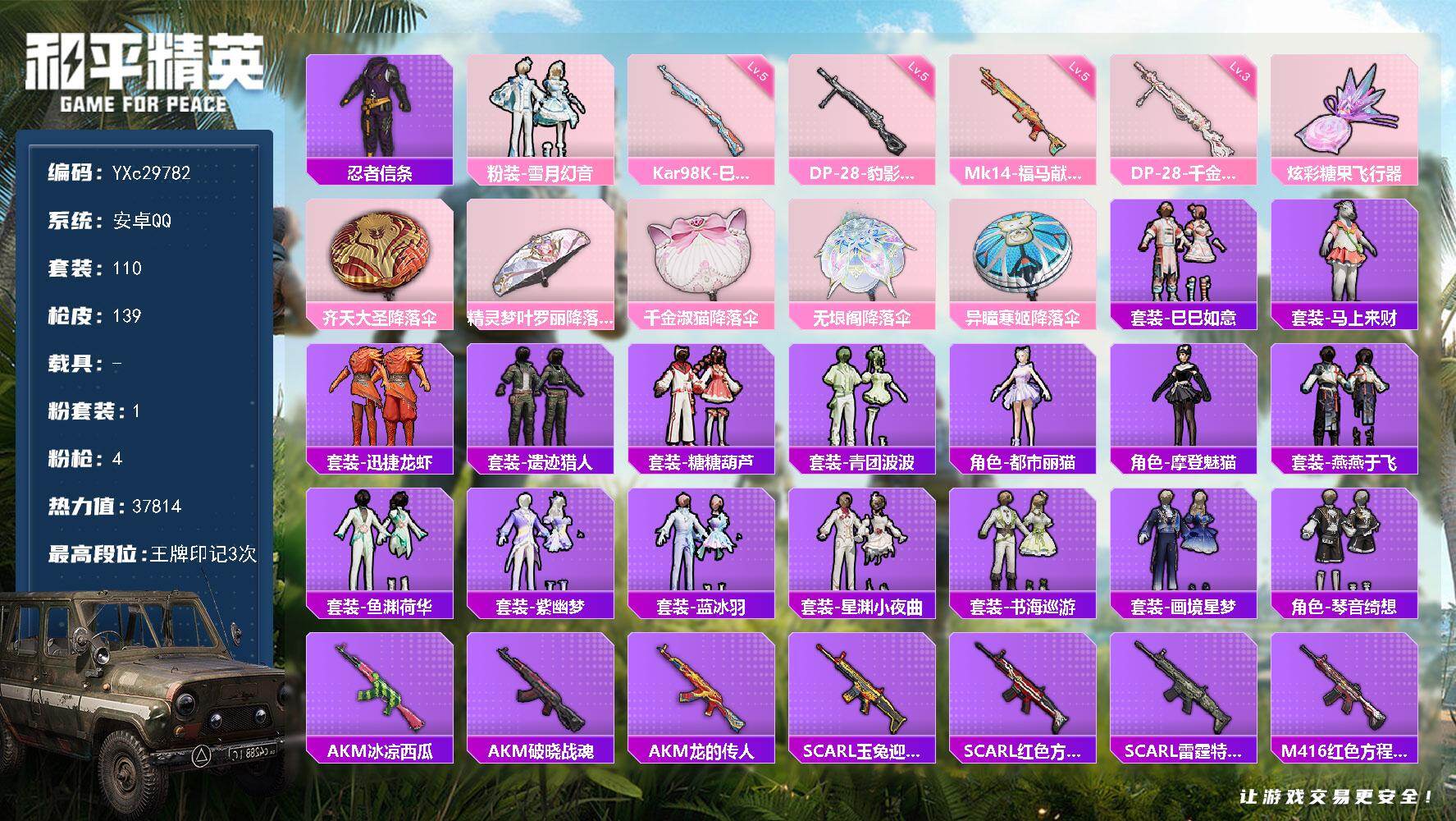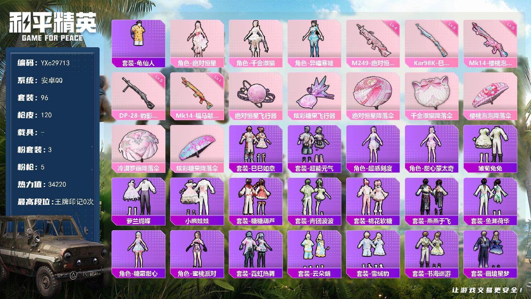 PX_2541187-粉装-9特效枪,小可学妹,深海小丑鱼,SCAR-L-童趣迷兔[6级]】无二次包,安卓手Q-4粉装-9特效枪-65套装-111枪皮-4王牌印记-不朽星钻Ⅴ-30572热力值【4粉装】角色-小可学妹,炙焰红王,角色-萨利娅,冰霜白皇【9特效枪】MG-36-沧焰双生[5级],Kar98K-巳巳如意[5级],Mk14-甜梦熊击[5级],DP-28-豹影疾电[5级],SCAR-L-童趣迷兔[6级]