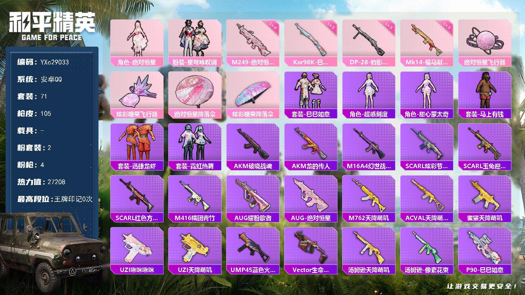 PX_2556376-??铁天赋】YXc29033-【可二次】【因赛季更新游戏段付以上号为准!】 ,安卓Q-2粉装4特效枪1热门71套装105枪皮,,历史荣耀皇冠Ⅰ, 【2粉装】,星穹咏叹调,绝对恒星, 【4特效枪】,Kar98K-巳巳如意,(5级),DP-28-豹影疾电,(5级),M249-绝对恒星,(4级),Mk14-福马献瑞,(5级), 【1热门】,鹰眼刺客,
