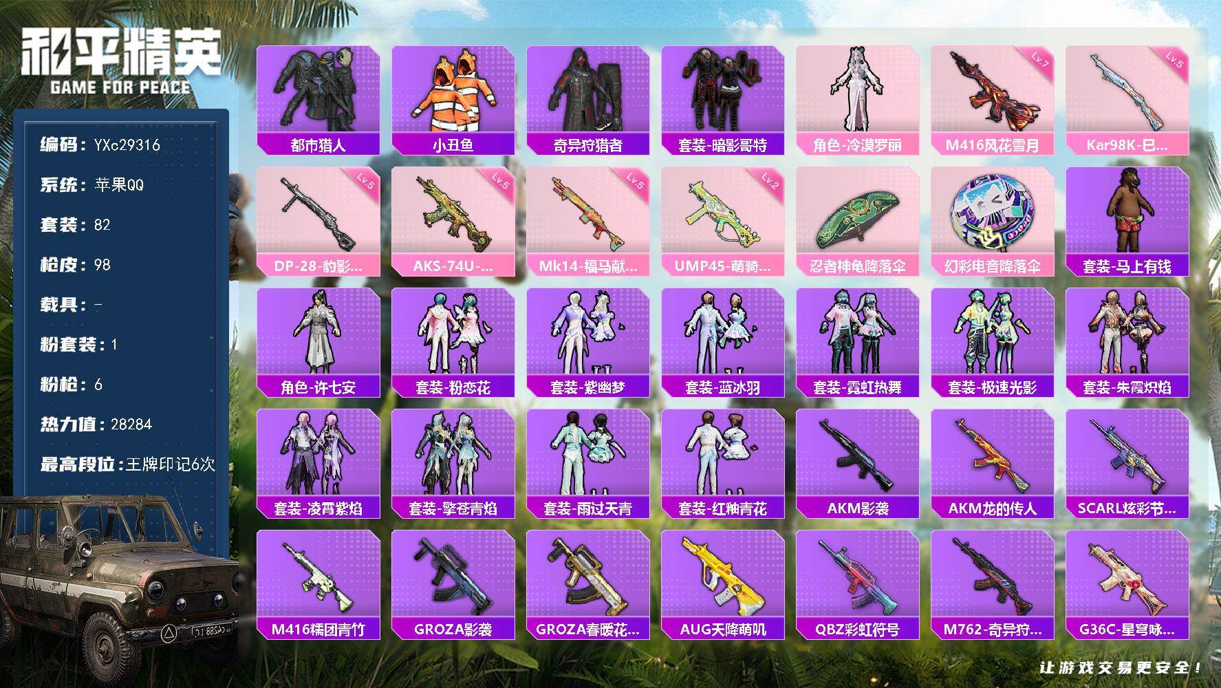 PX_2556383-【8特效枪6粉装】,苹果V区-36040热力值-99套装-127枪皮,【6粉装】,绚金战神,虹云熊熊,人物-小舞·灵珑,玩偶服-猪猪侠,星穹咏叹调,角色-女娲灵识【8特效枪】,AKS-74U-森灵之息(5级),Mk14-福马献瑞(5级),UMP45-萌骑冒险(4级),ACE32-萌骑漫游(4级),Kar98K-巳巳如意(5级),Mk14-甜梦熊击(5级),AUG-暖羊咩咩(5级),DP-28-豹影疾电(5级)【169热门】,DBS-彩虹符号,破蛋小黄鸡,长空猛禽,特训学院,青年教官,魅力单车,蓝色运动,黄色运动,黄色伏地魔,黑色伏地魔,海岛探路者,春日漫步,S1897-糯团青竹,MK20-H-樱桃泡泡,AA12-G-雨过天青,沙漠之鹰-雨过天青,平底锅-画境星梦,馥郁金蕊,M16A4-雨过天青,AC-VAL-荒原烈焰,顶瓜瓜,M249-无面战甲,雨过天青,冰河战士,MG-36-薄荷星砂,GROZA-福马献瑞,恋语绒绒,SS34特训,漫游都市,朱霞炽焰,星影赞美诗,撬棍-冰晶雪宝,AWM-天降萌叽,福马献瑞,大橘大利,GROZA-晶梦幻蝶,凌霄紫焰,蓝冰羽,龙魂突击队,SS29特训,SS30特训,ACE32-冰晶雪宝,青团波波,鱼渊荷华,糖糖葫芦,青翼流星,SS28特训,PKM-啾咪啾咪,M16A4-冰河战士,燕燕于飞,SS31特训,SS33特训,SS32特训,巳巳如意,紫幽梦,极速光影,棉花软糖,雪绒豹,MG3-霓彩脉冲,狂鲨锋刃,SS36特训,大砍刀-像素花束,瑰梦爱神,异域银装,智谋强哥,粉恋花,战术大师,JS9-凌霄紫焰,MG-36-凌霄紫焰,马上来财,蜜獾-启元战纹,迅捷龙虾,ARX-凌霄紫焰,云朵鹅,晶辉守护,短管霰弹-星穹咏叹调,G36C-星穹咏叹调,P92-凌霄紫焰,撬棍-冷漠罗丽,炽纹蛇影,平底锅-凌霄紫焰,狙击之神,燃烧瓶-甜梦桃焰,航行童话,破片手榴弹-海盐豹豹,UMP45-海盐豹豹,大砍刀-黑金刀,ARX-像素花束,MK20-H-星途旅人,短管霰弹-竹节火铳,M417-玩趣呆呆,AKM-荧星灵猫,Mk14-薄荷星砂,AUG-紫晶流影,AMR-鸡智如我,SS38特训,燃烧瓶-福马献瑞,PKM-紫幽梦,Mk14-冰河战士,短管霰弹-圣域龙灵,ACE32-画境星梦,Kar98K-顶峰精英,M1加兰德-画境星梦,琴音绮想,Mini14-香桃花海,破片手榴弹-巳巳如意,Mk14-紫幽梦,M16A4-千金淑猫,SCAR-L-星途旅人,S686-千金淑猫,蝎式手枪-千金淑猫,M200-六号稻草人,AKS-74U-鸡智如我,UZI-冰河战士,烟雾弹-冰氧夏日,平底锅-属我最6,S1897-紫幽梦,蜜獾-糖糖葫芦,平底锅-糖糖葫芦,P92-紫幽梦,野牛-燕燕于飞,UMP45-糖糖葫芦,星途旅人,M249-萌萌史莱姆,薄荷星砂,MK20-H-糖糖葫芦,平底锅-紫幽梦,破片手榴弹-星途旅人,香桃花海,SPAS-12-燕燕于飞,P18C-糖糖葫芦,摩登魅猫,Vector-燕燕于飞,都市丽猫,蝎式手枪-燕燕于飞,街头风暴,十字弩-燕燕于飞,AKS-74U-粉粉喵呜,M416-小财神当家,VSS-香桃花海,AUG-异域银装,MP5K-画境星梦,十字弩-异域银装,AA12-G-画境星梦,雪国风尚,粉彩缠枝,SVD-云朵鹅,小财神当家,M762-云朵鹅,电击枪-喜羊羊与灰太狼,SPAS-12-云朵鹅,MK20-H-狂鲨锋刃,SPAS-12-狂鲨锋刃,P90-巳巳如意,破片手榴弹-小财神当家,S686-巳巳如意,M249-冰晶雪宝,书海巡游,沙漠之鹰-云朵鹅,SS37特训,大砍刀-云朵鹅,玩偶服-懒羊羊,AMR-雨过天青,PKM-雨过天青,红釉青花,元素星魂,白糯汤圆,画境星梦,汤姆逊-像素花束【2飞行器】,云梦轻舟飞行器,时光之吻飞行器【18背包】,瑞龙福将背包(3级),冰河战士背包(3级),蝶变背包(3级),糖糖葫芦背包(3级),第五大道背包(3级),香桃花海背包(3级),千金淑猫背包(3级),燕燕于飞背包(3级),智谋强哥背包(3级),异域银装背包(3级),樱桃泡泡背包(3级),巳巳如意背包(3级),桃粉嫣然背包(3级),紫幽梦背包(3级),云朵鹅背包(3级),凌霄紫焰背包(3级),狂鲨锋刃背包(3级),龙的传人背包(3级),营地ID:978512437,