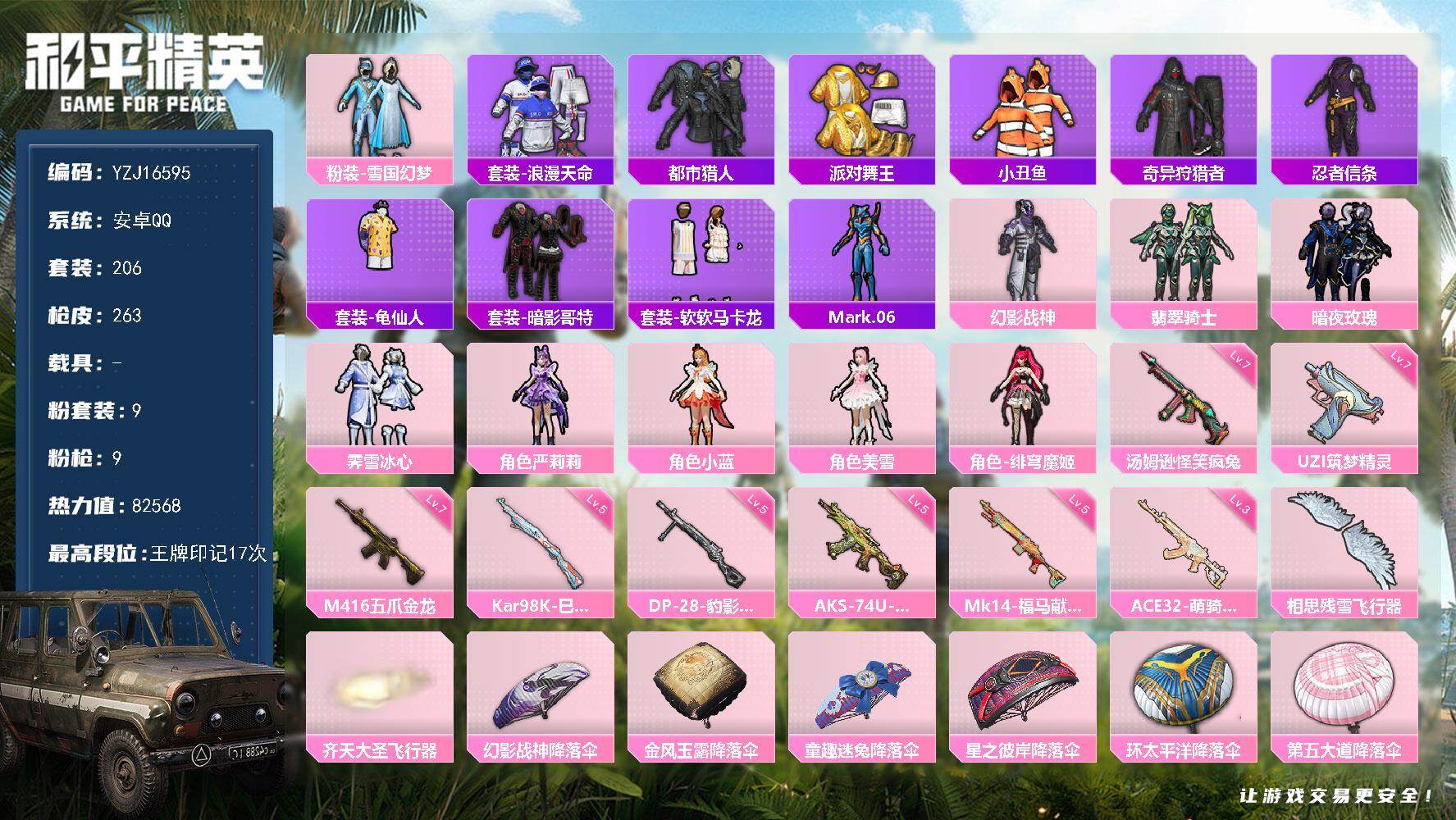 PX_2556937-可二次,安卓Q【精氪小身法号,幻影战神,智能音符,莫吉托,千金淑猫,猪猪侠,都市,金鞋,巡查衣,奇异狩猎者,红眼罩,蓝粉螳螂,深海小丑鱼,狂沙,激萌罗小黑,天命,马上有钱,满级M4五爪,满级M249彩虹甜喵,满级AUG暖羊,】-6稀有8粉装11特效枪21热门236套装306枪皮,96894热力值,19印记,历史超级王牌14星,【6稀有】,奇异狩猎者,巡查衣,都市猎人,浪漫天命,派对舞王,派对舞王(金靴子),【8粉装】,猪猪侠,千金淑猫,异瞳寒姬,幻影战神,智能音符,仲夏莫吉托,数码大师,恐龙拽拽,【11特效枪】,M416-五爪金龙,(7级),SCAR-L-锦绣绵绵,(5级),M416-电玩时刻,(5级),AKM-绿萝繁花,(5级),Kar98K-巳巳如意,(5级),M762-青锋波束,(5级),DP-28-豹影疾电,(5级),AUG-暖羊咩咩,(5级),UMP45-量子极限,(5级),M249-彩虹甜喵,(7级),Mk14-福马献瑞,(5级),【21热门】,8号机,Mark.06,小丑鱼,龟仙人,雪山精英,呆萌铁蟹,鹰眼刺客,激萌罗小黑,深海小丑鱼,暗影哥特,团圆交子,瑞龙福将,粉红小猪,豚鼠丹丹,狂沙舞者,漫步者,破蛋小黄鸡,极速红龙,弄潮海豚,AKM-奇异狩猎者,M762-瑞龙福将,【2飞行器】,齐天大圣飞行器,天之羽翼飞行器,【4头盔】,百万伏特头盔,幻影战神头盔,金风玉露头盔,深海小丑鱼头盔,【5背包】,百万伏特背包,幻影战神背包,金风玉露背包,深海小丑鱼背包,甜蜜誓约背包,营地ID:786829284,